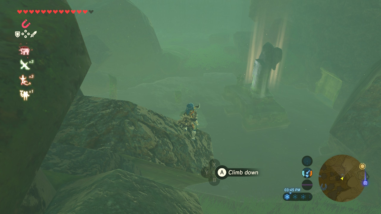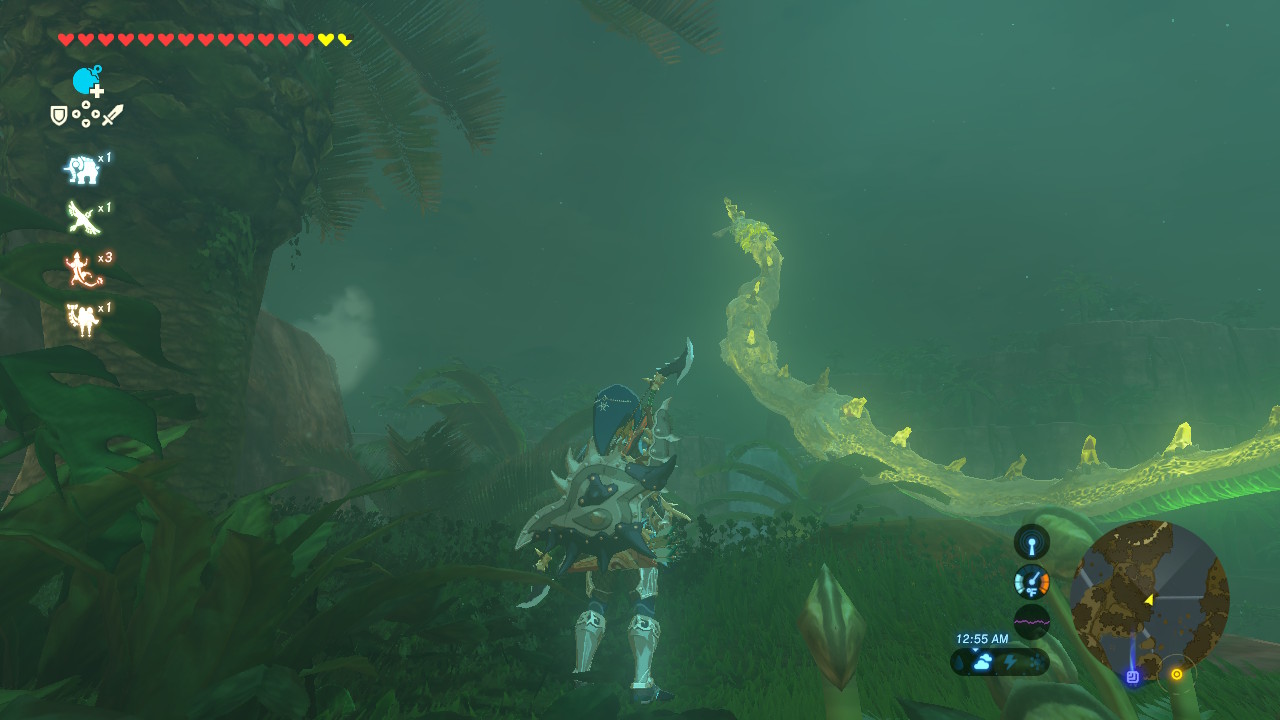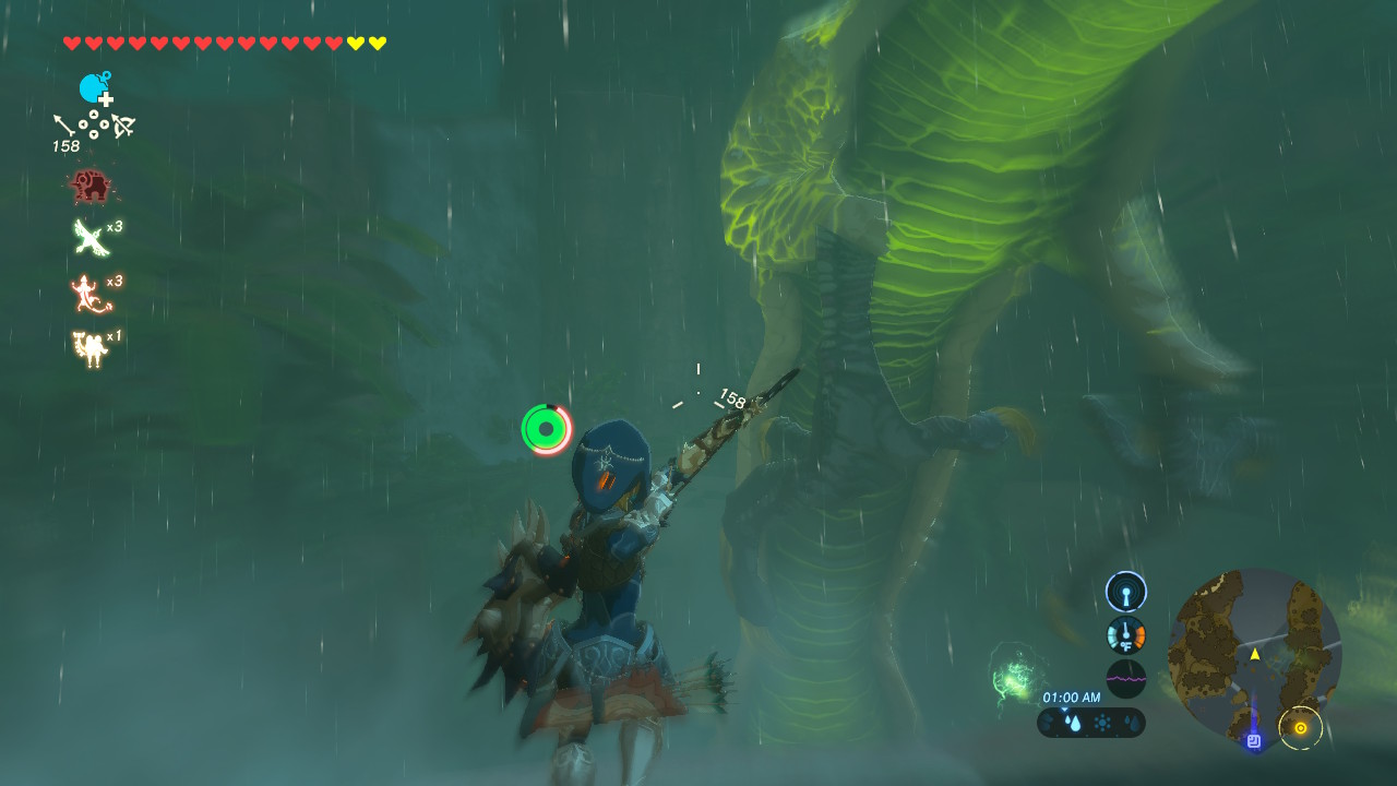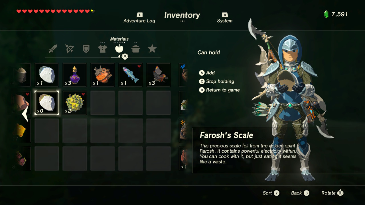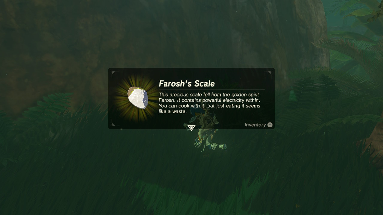 This time, you’ll need the scale of Farosh, a lightning dragon that travels a long route from Floria Falls and back to Lake Hylia, where it flies beneath the Bridge of Hylia and into the sky beyond. It dives in the water and re-emerges in both locations, making it pretty tricky to follow. Wait around Floria Falls bridge or the Bridge of Hylia until the dragon appears.