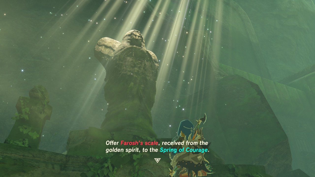 Once you’ve got the scale, return to the Spring of Courage and drop Farosh’s Scale into the spring water. That will complete the Shrine Quest and open the door to the Shae Katha Shrine.
