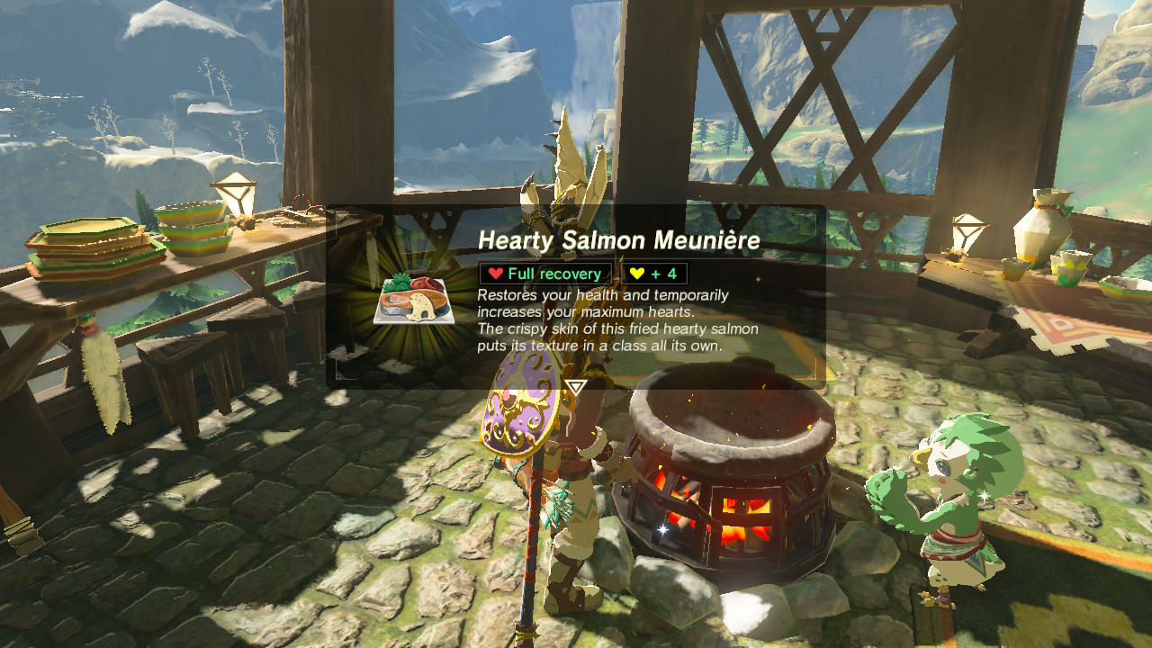 Go to the village kitchen and cook up a salmon recipe using the three ingredients: goat butter + hearty salmon + Tabantha wheat. Give this fresh dish to the child Rito in the kitchen.
