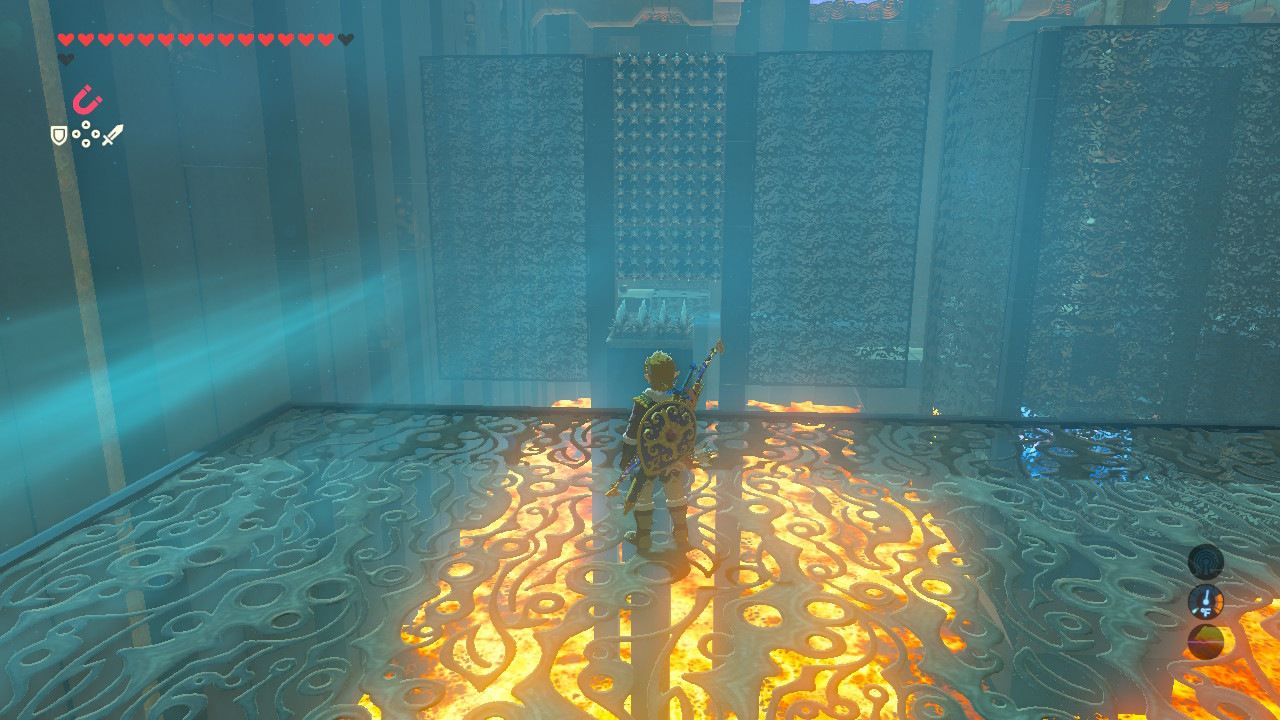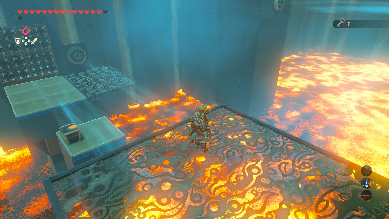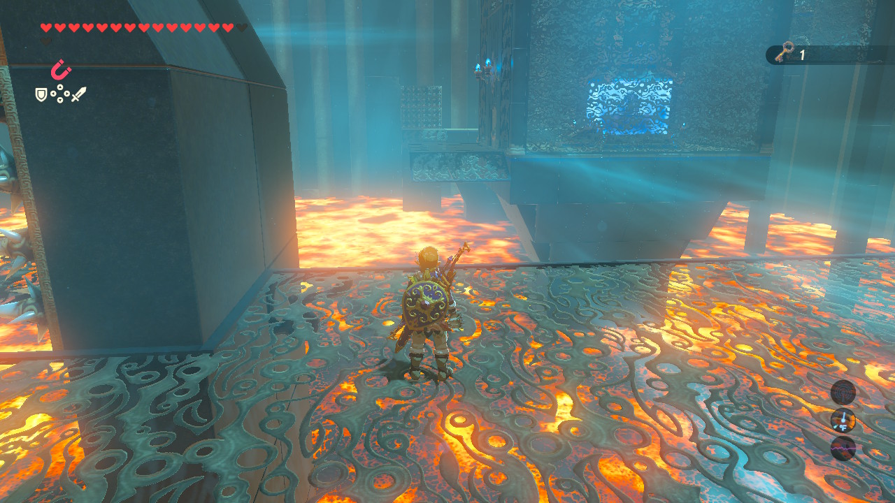 Climb up the long ladder and hit the switch to drop into the lava-filled puzzle chamber. Immediately open Link glider and ride the wind draft toward the center of the room — the altar is locked behind a door that requires a small key.