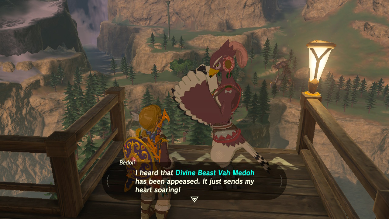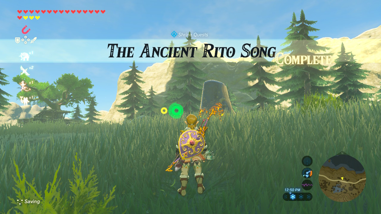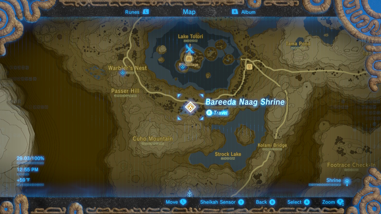 This hidden shrine is located south of Rito Village. To begin the shrine quest, talk to Bedoli on the large platform around the east side of the village, across from the town shrine. Talk to Laissa to hear the rest of the ancient Rito song — select “Ancient Rito Song” as your active quest to find her.
