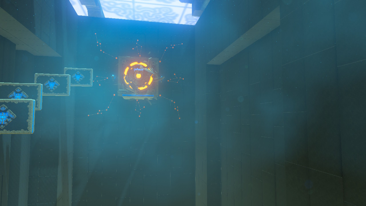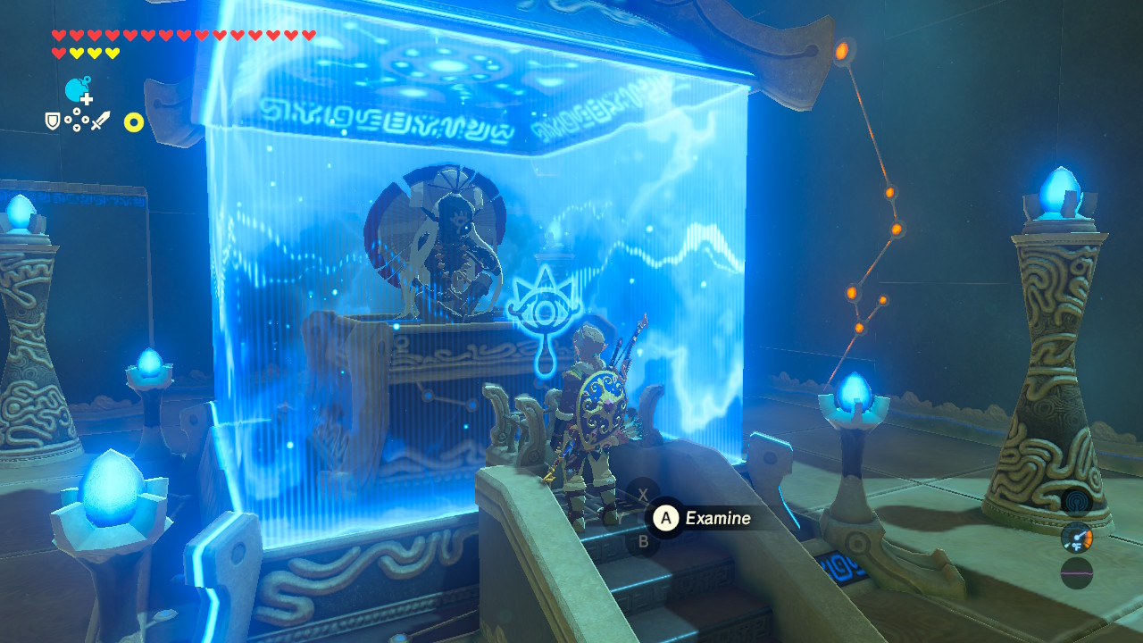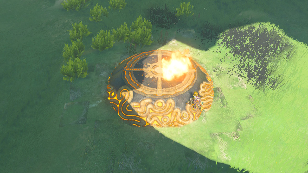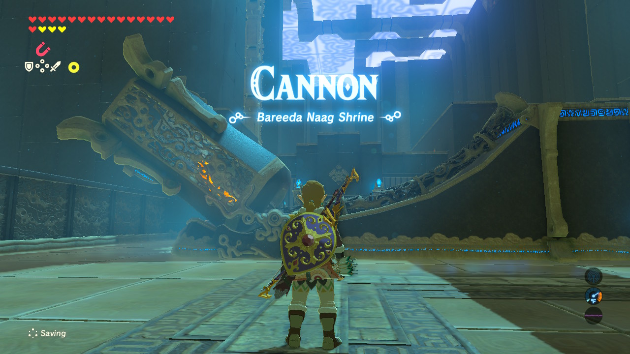 This is a nice, simple shrine. As you enter, climb up the ladder and a round bomb into the funnel at the cannon. Detonate to launch a boulder into the wall, then fire it again after the barriers start blocking the cannon’s trajectory. Time your launch right and the orb will hit the glowing input pad, opening the door to the altar.