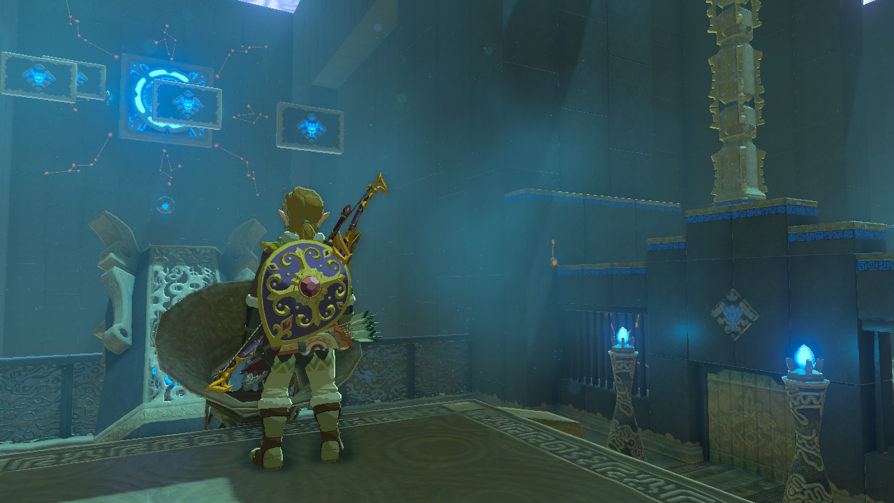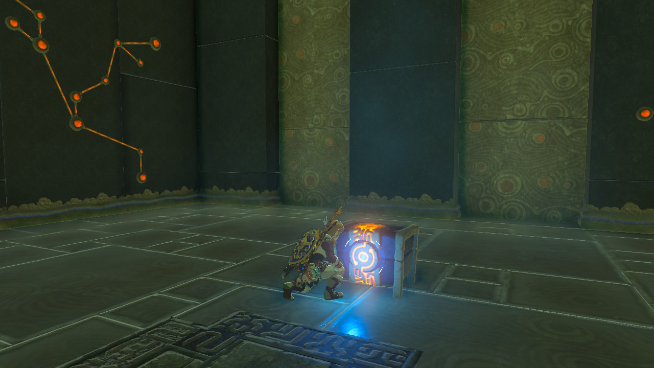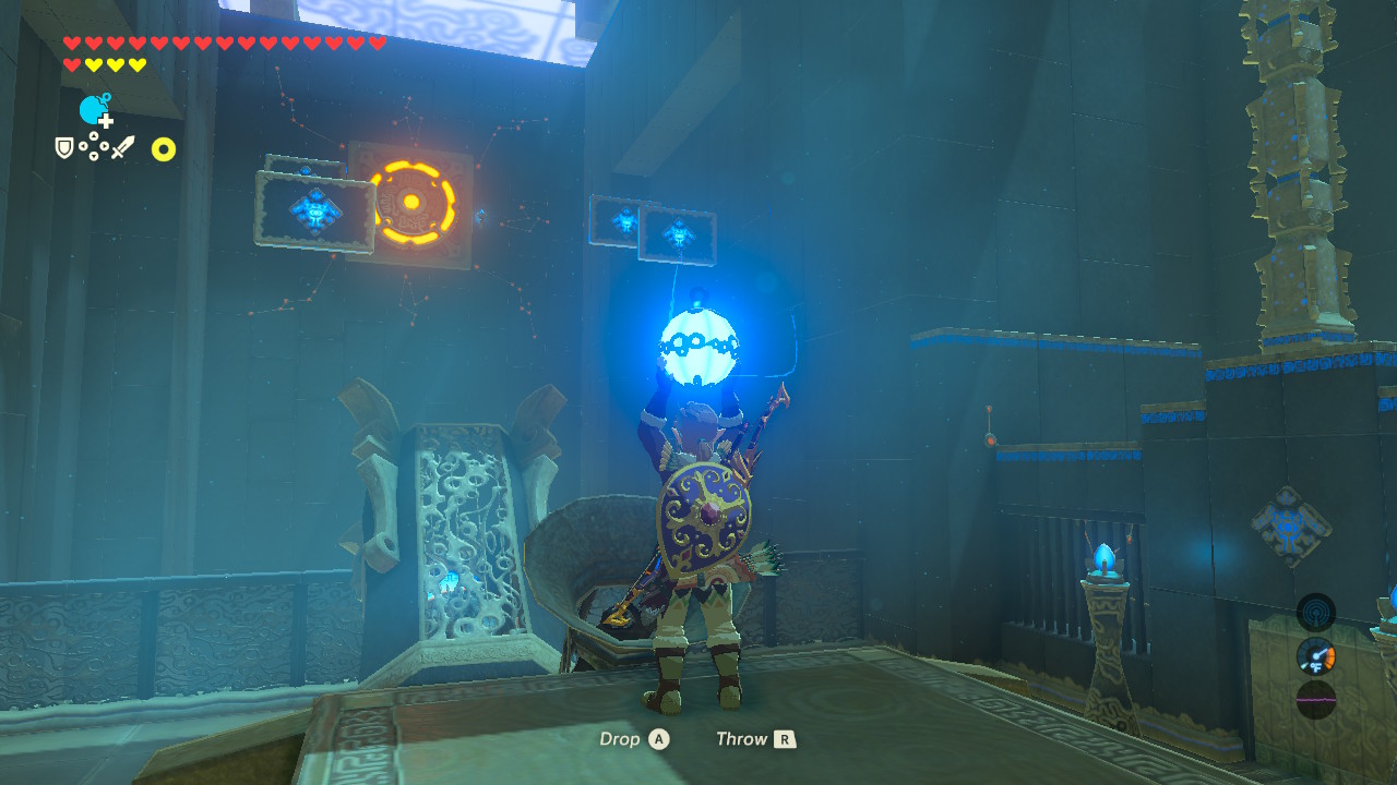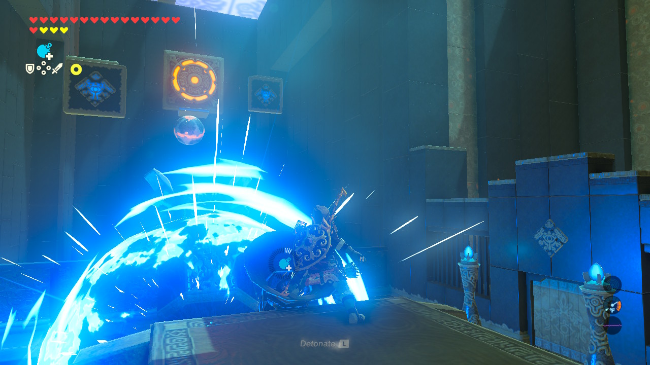 This is a nice, simple shrine. As you enter, climb up the ladder and a round bomb into the funnel at the cannon. Detonate to launch a boulder into the wall, then fire it again after the barriers start blocking the cannon’s trajectory. Time your launch right and the orb will hit the glowing input pad, opening the door to the altar.