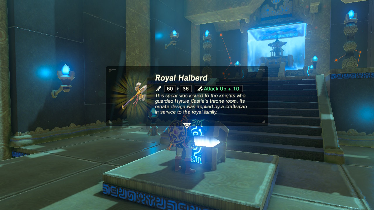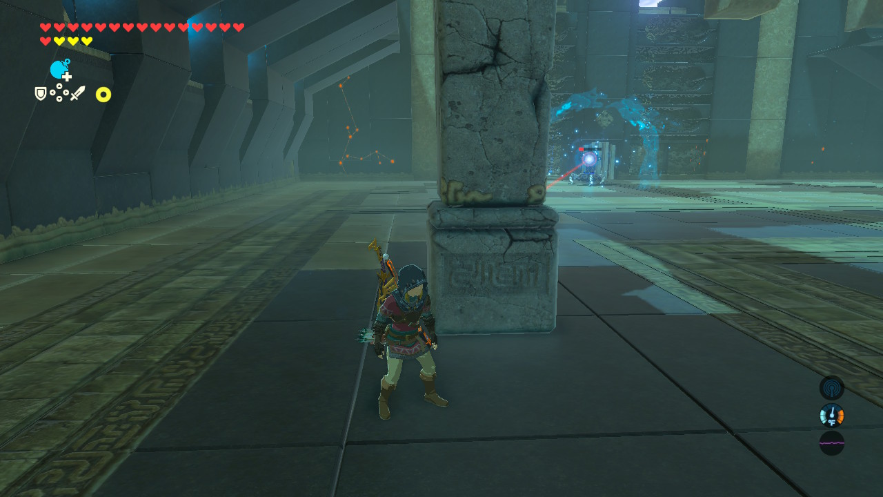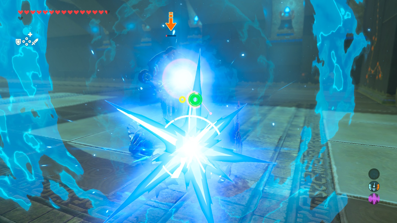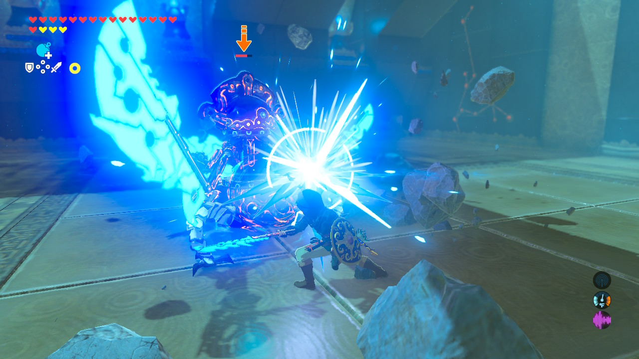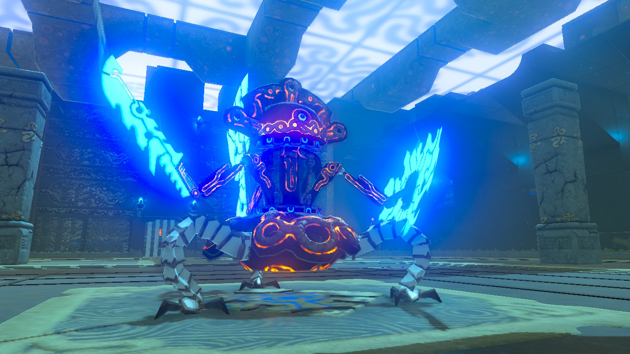 The shrine contains a Guardian Scout Mk. 4 — these are some of the toughest enemies in the game. Like every other Guardian Scout, it uses three main special attacks; a spin charge, a laser spin, and a charge beam. Hide behind pillars when you can, use the glider when the laser spins, and unleash a torrent of attacks when it tries to unleash a charge beam.