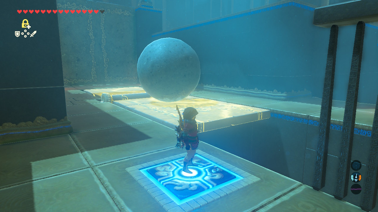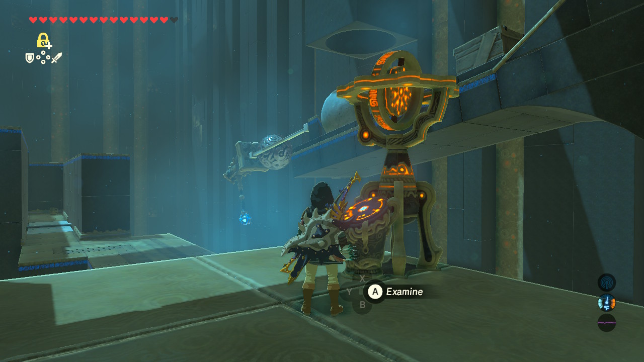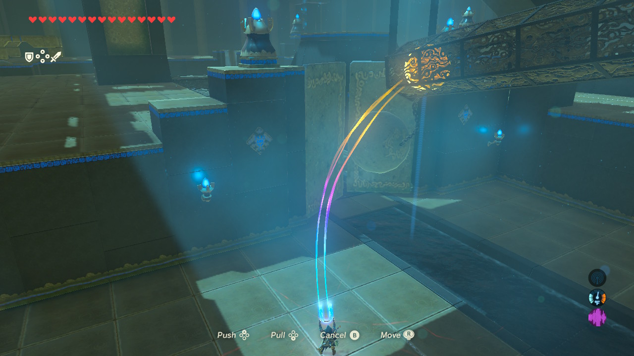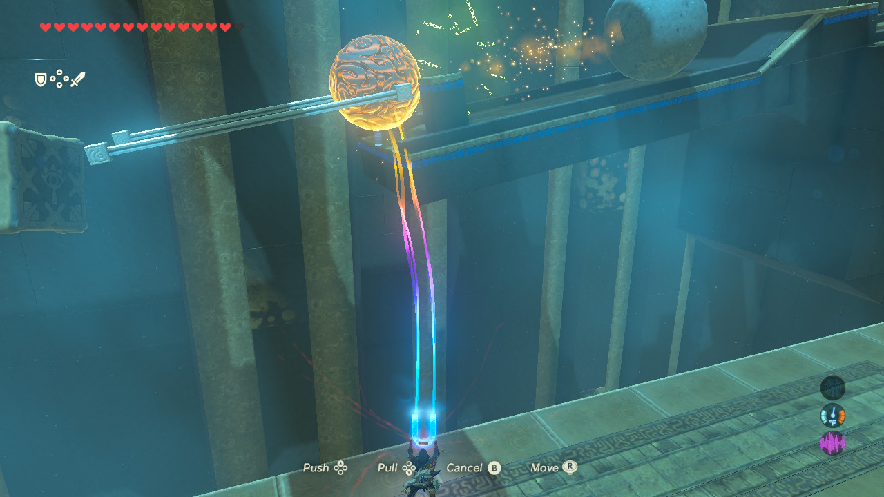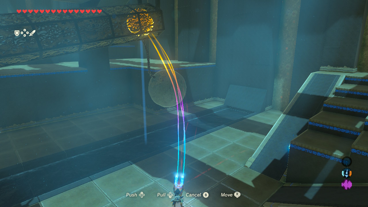 Here, Link is faced with a strange contraption — a stone boulder hanging by a chain. Use Magnesis on the smaller orb in the cage above the contraption to manipulate the larger boulder. Move it back, then forward to push open the stone doors.