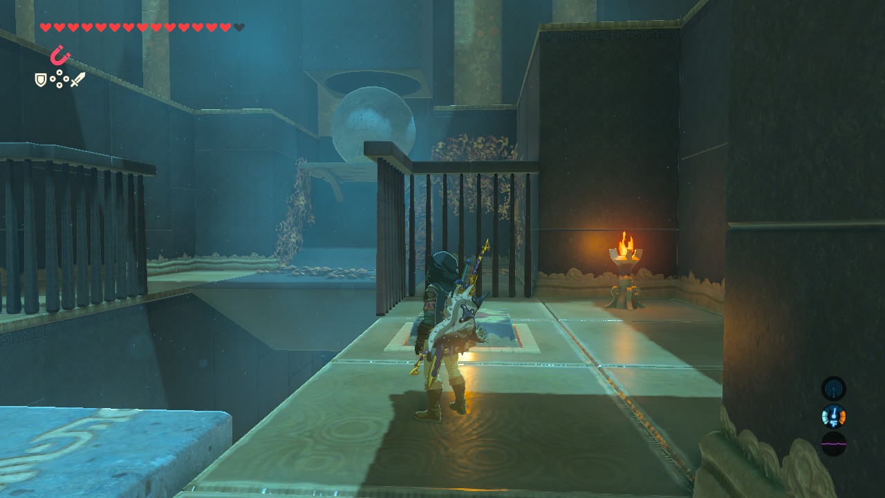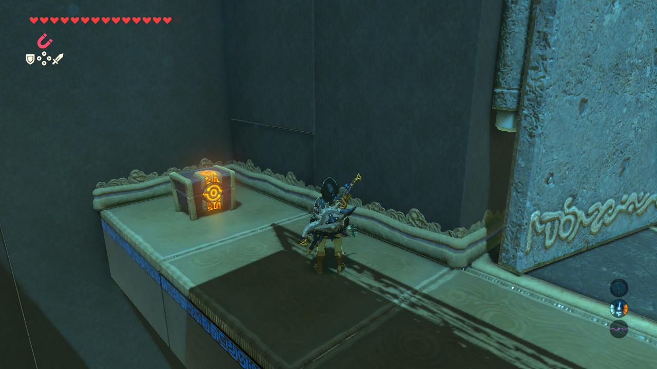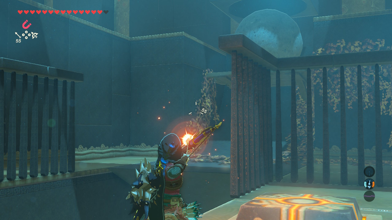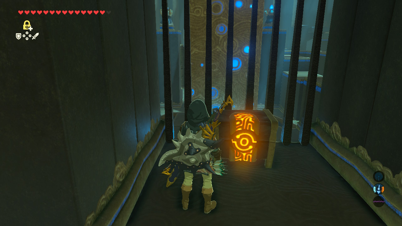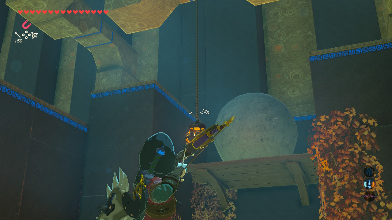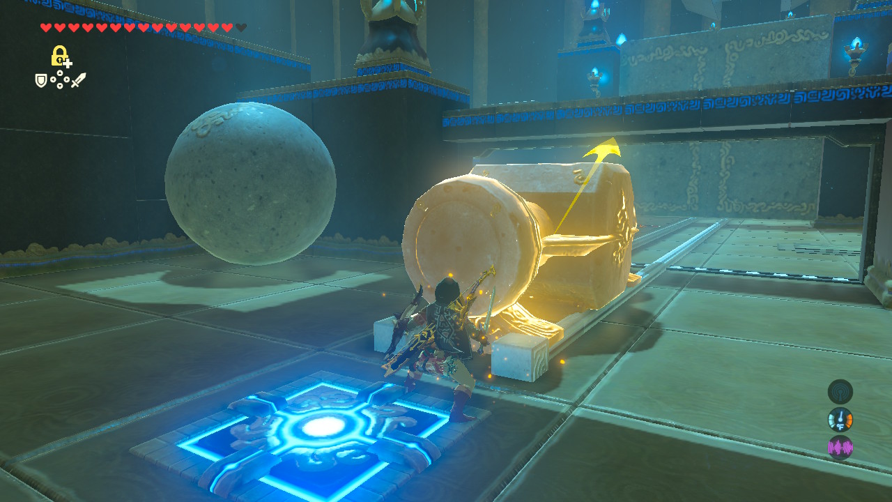 Here, Link is faced with a strange contraption — a stone boulder hanging by a chain. Use Magnesis on the smaller orb in the cage above the contraption to manipulate the larger boulder. Move it back, then forward to push open the stone doors.