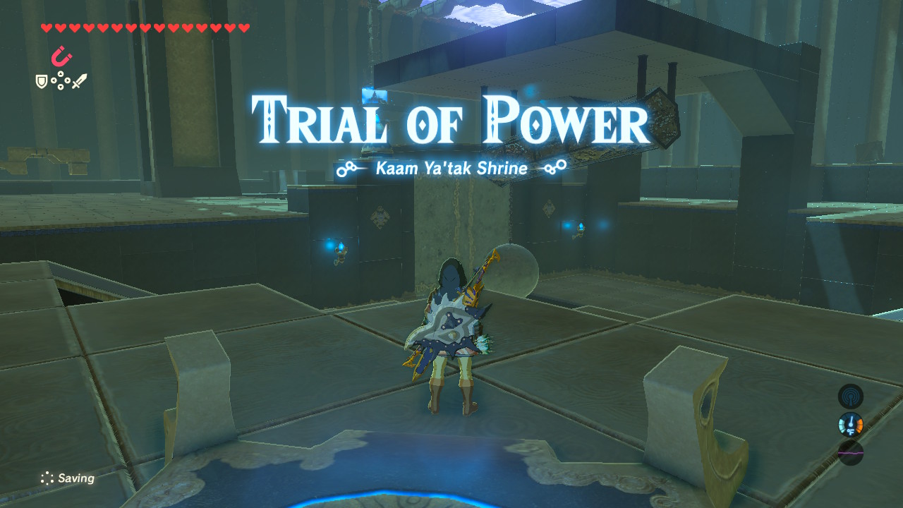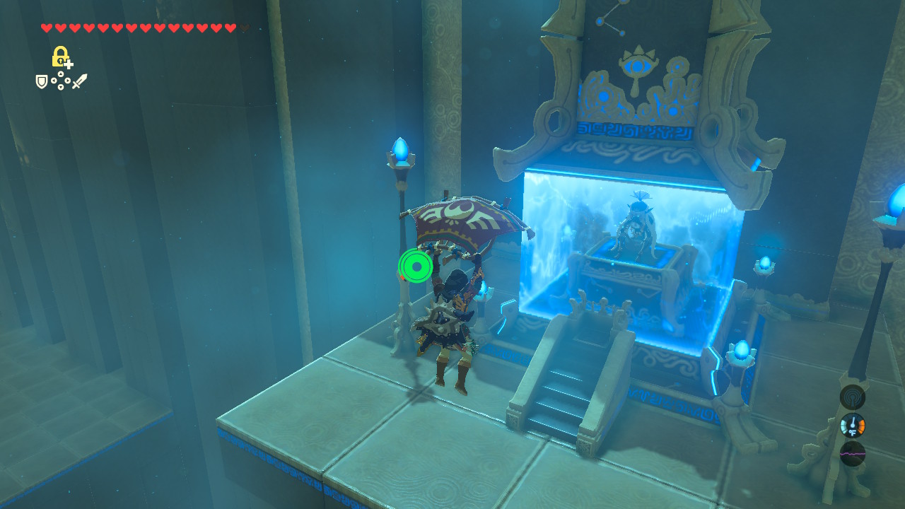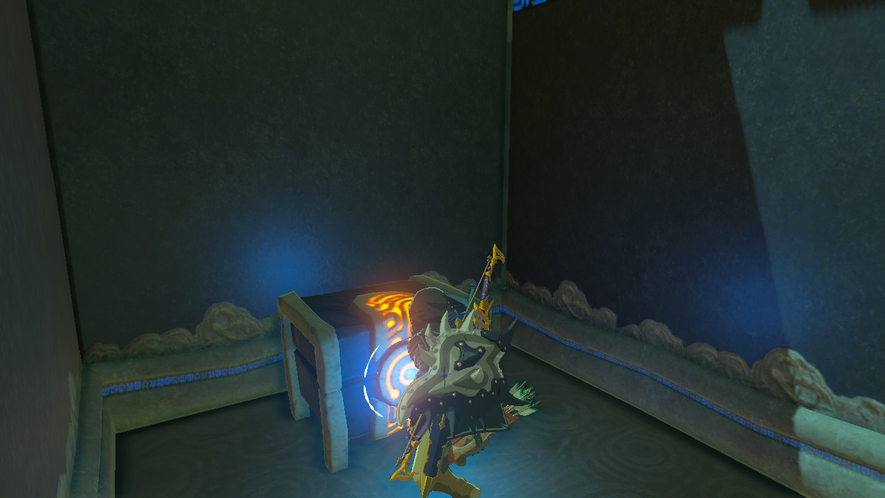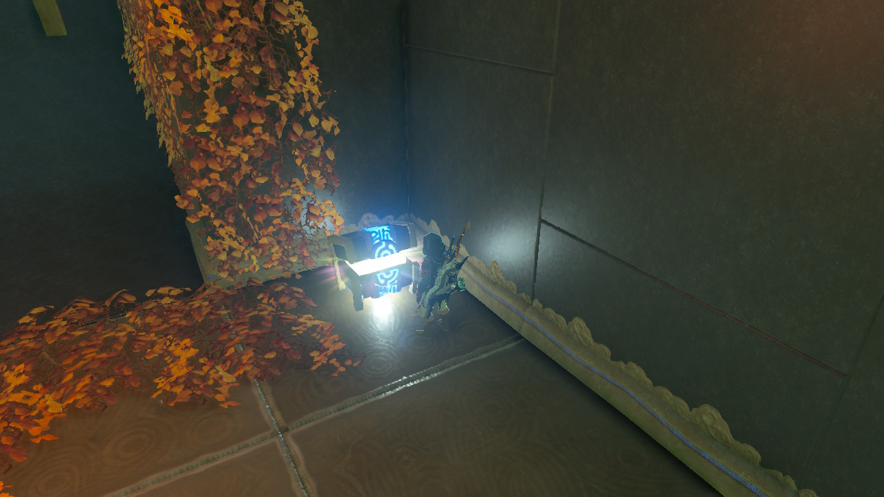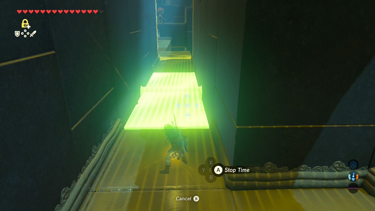 Here, Link is faced with a strange contraption — a stone boulder hanging by a chain. Use Magnesis on the smaller orb in the cage above the contraption to manipulate the larger boulder. Move it back, then forward to push open the stone doors.