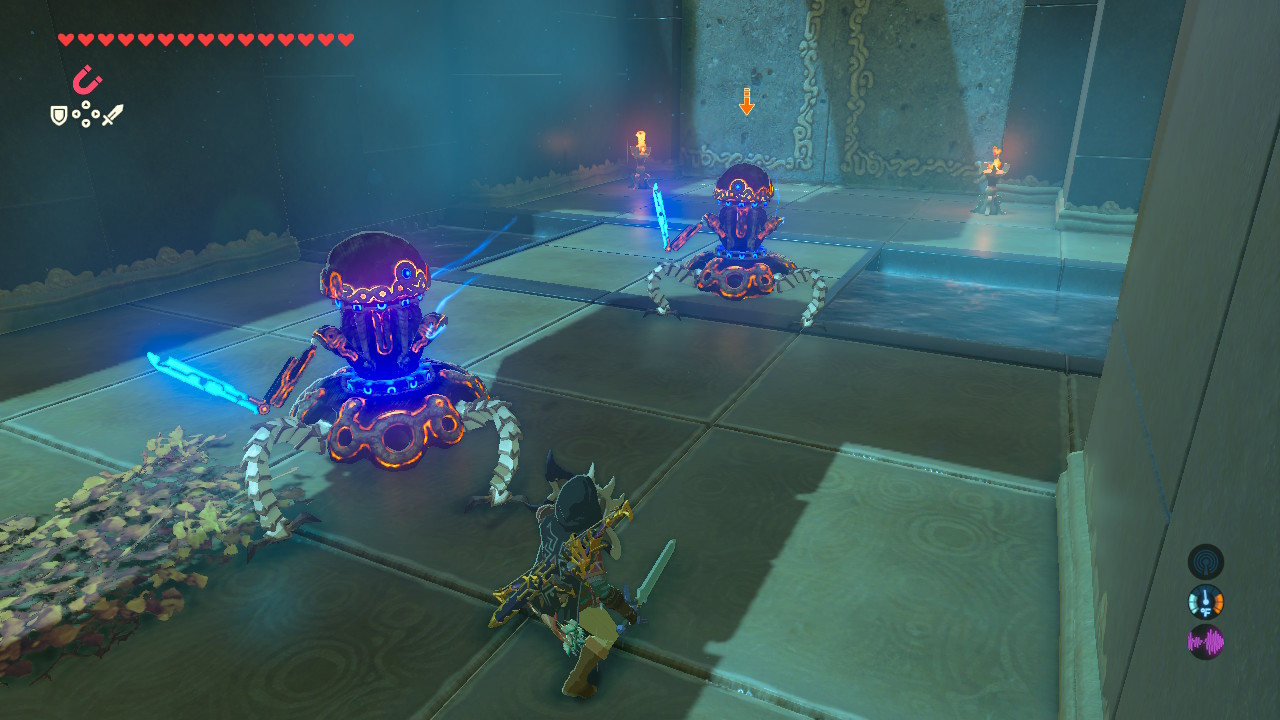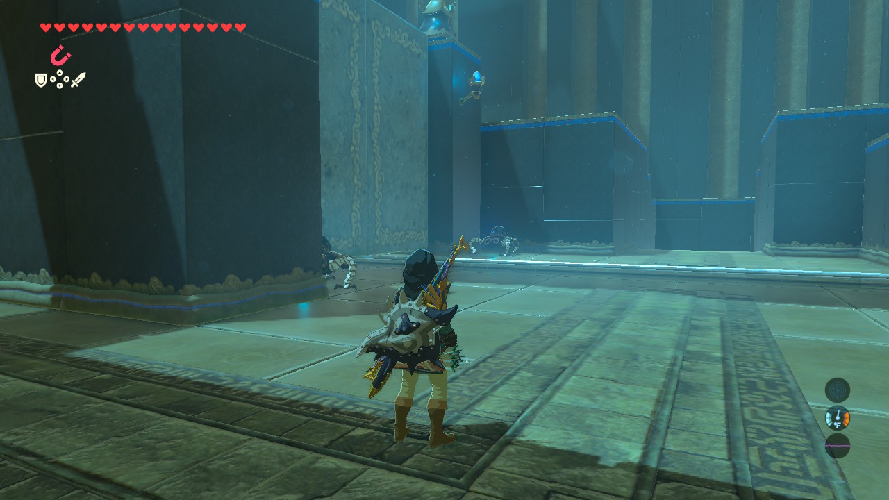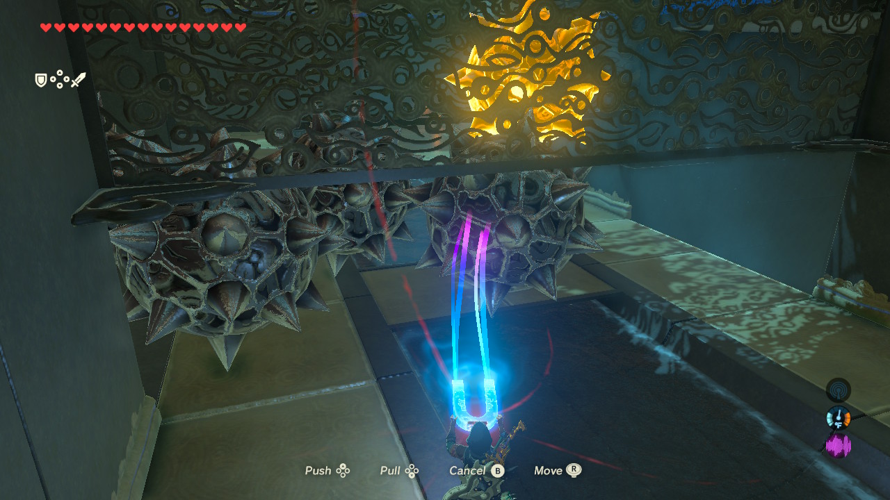 Ahead, to get through the spike gauntlet, use Magnesis to grab the sliding spike balls and stop up the works. When the spike balls are stopped, you’ll be able to get through safely.