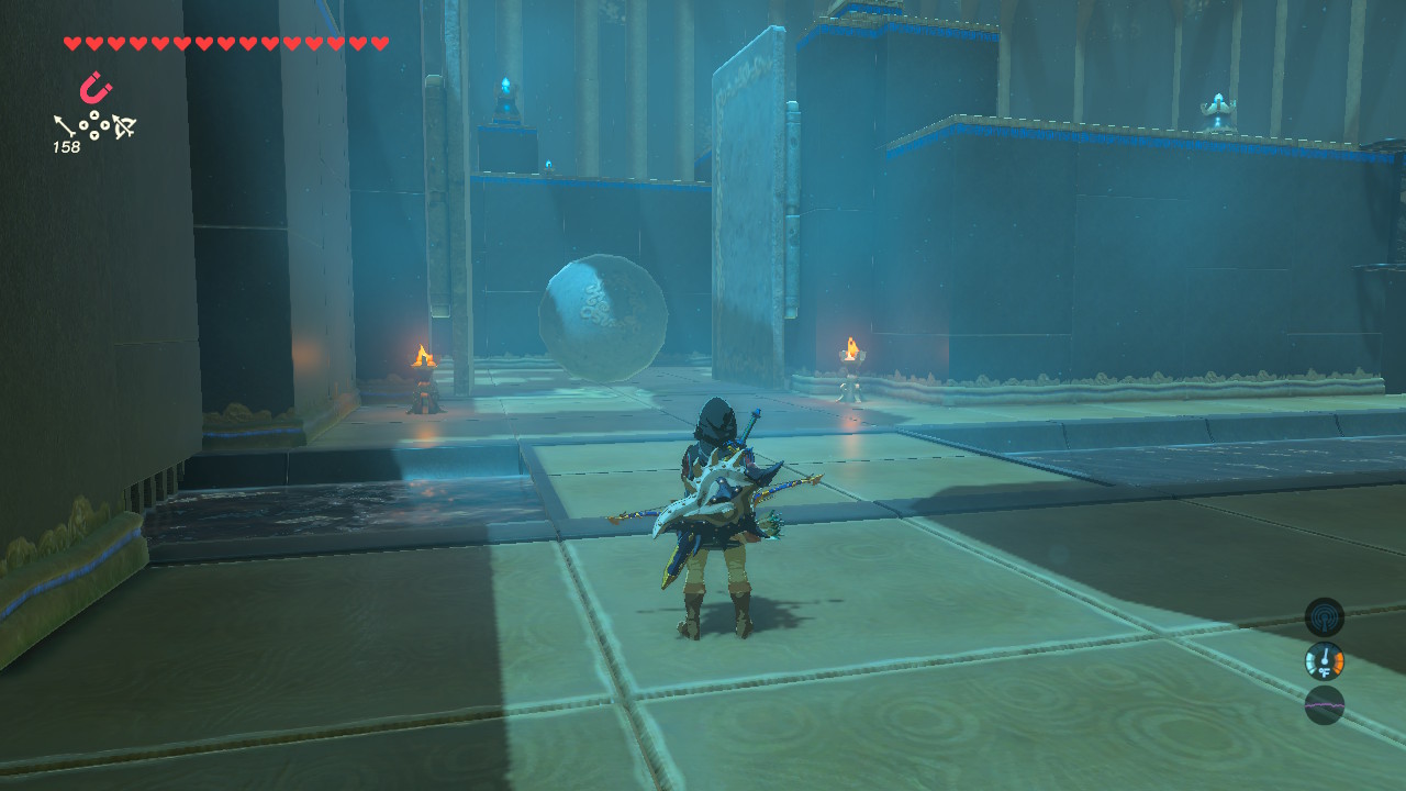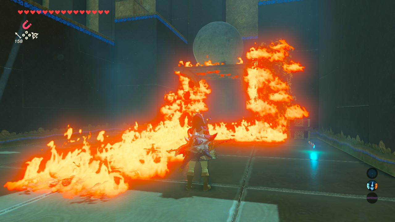 At the third door, use a fire arrow to burn down the stone boulder platform. Next, you’ll need to press the button just as the boulder rolls down the slope. Pressing the button raises a ramp — as long as you have enough speed, the boulder will roll onto the tilting platform.