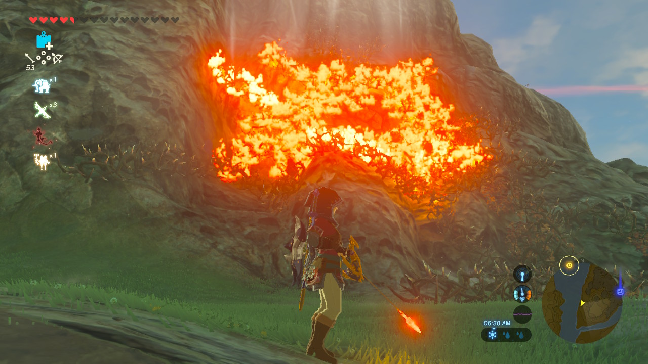 Check out the island west of Hyrule Castle. Cross the Moat Bridge to find this island — on the southern shore, there’s a huge mass of brambles. Burn it all down with a fire arrows, then blow open the cracked cave wall to find the hidden shrine.