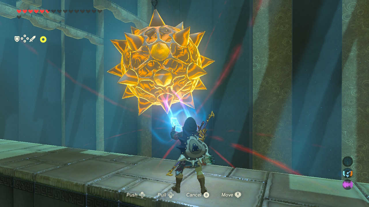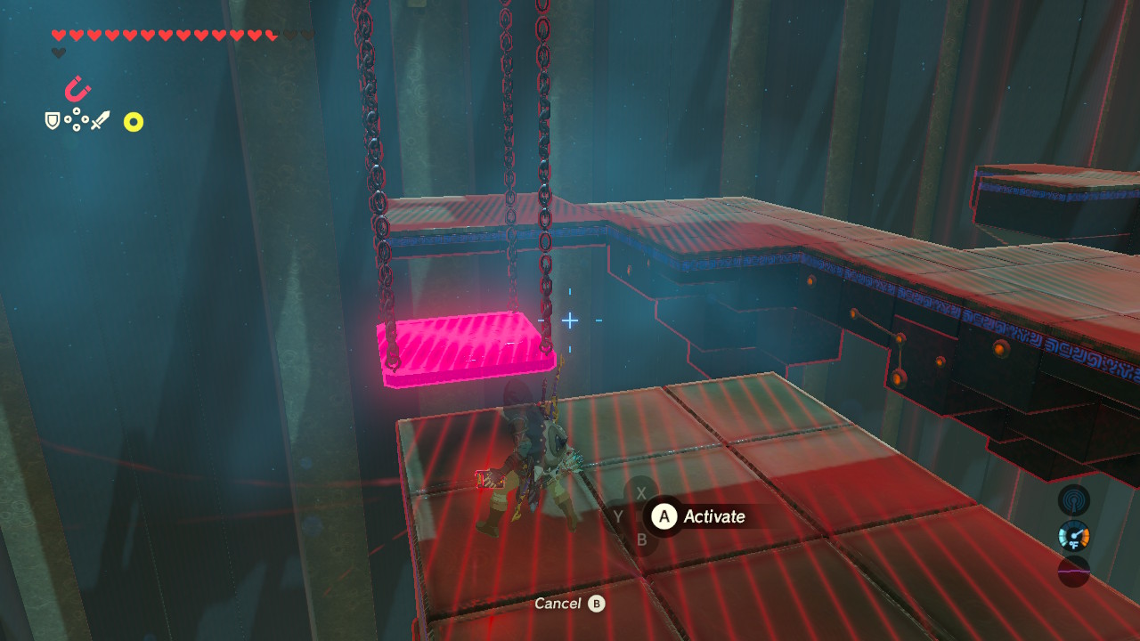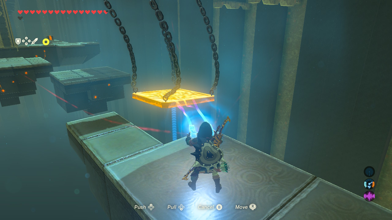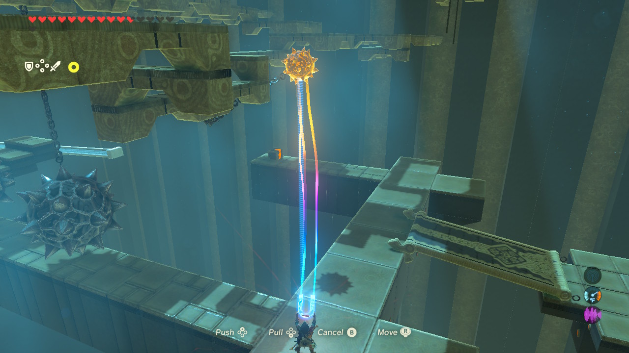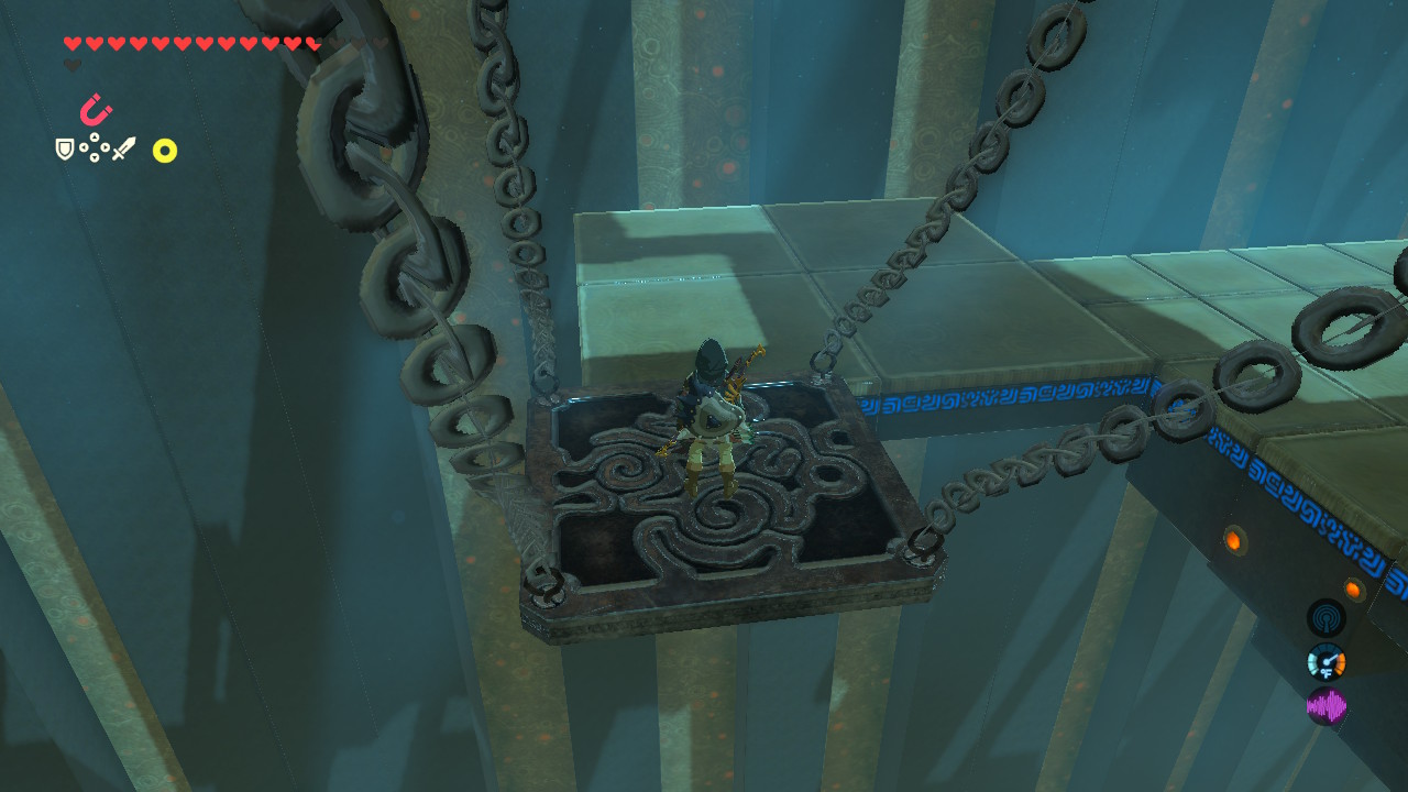 There’s a unique gimmick in this shrine — swinging platforms hanging by chains. Grab the platforms with Magnesis, then draw the platform back using the [Up / Down D-Pad] buttons.
