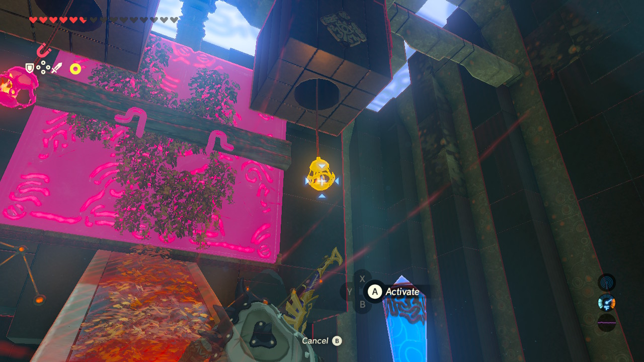 Climb up the metal block steps and you’ll have two options — shoot the moss with a fire arrow or hit the switch to produce two hanging lanterns. Use Magnesis to get the lanterns swinging, then shoot the rope with an arrow to drop the lantern onto the moss, starting a fire that will spread to the wooden barrier.