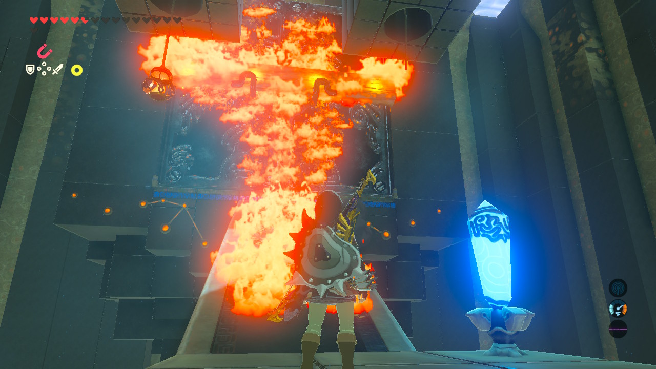 When the fire goes out, use Magnesis one more time to pull the large metal doors open.