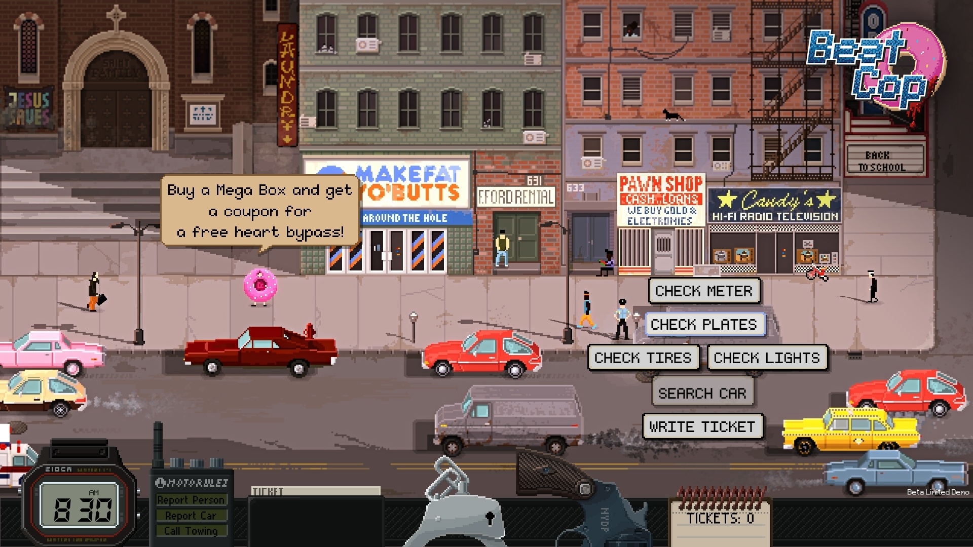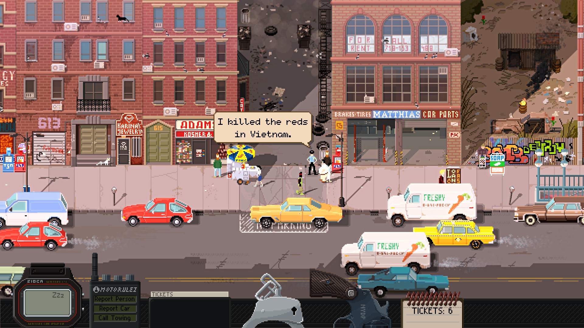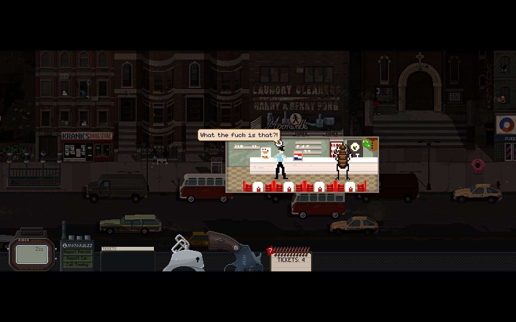 Beat Cop’s setting steals the show. A pixel neighborhood block bustling with cars, cats, and people becomes your new home away from home as you fill the shoes of a detective recently dropped to the lower ranks of being a street cop after a sordid scandal. Storefronts with neon lights enthrall you. The city is alive. Criminals are everywhere. Tickets must be written.