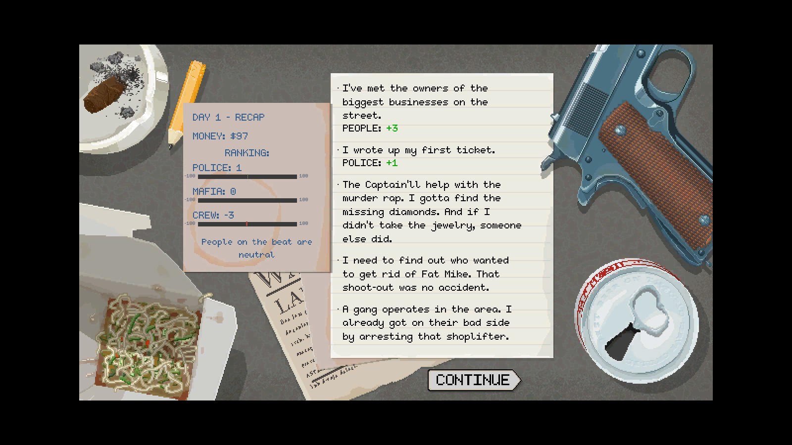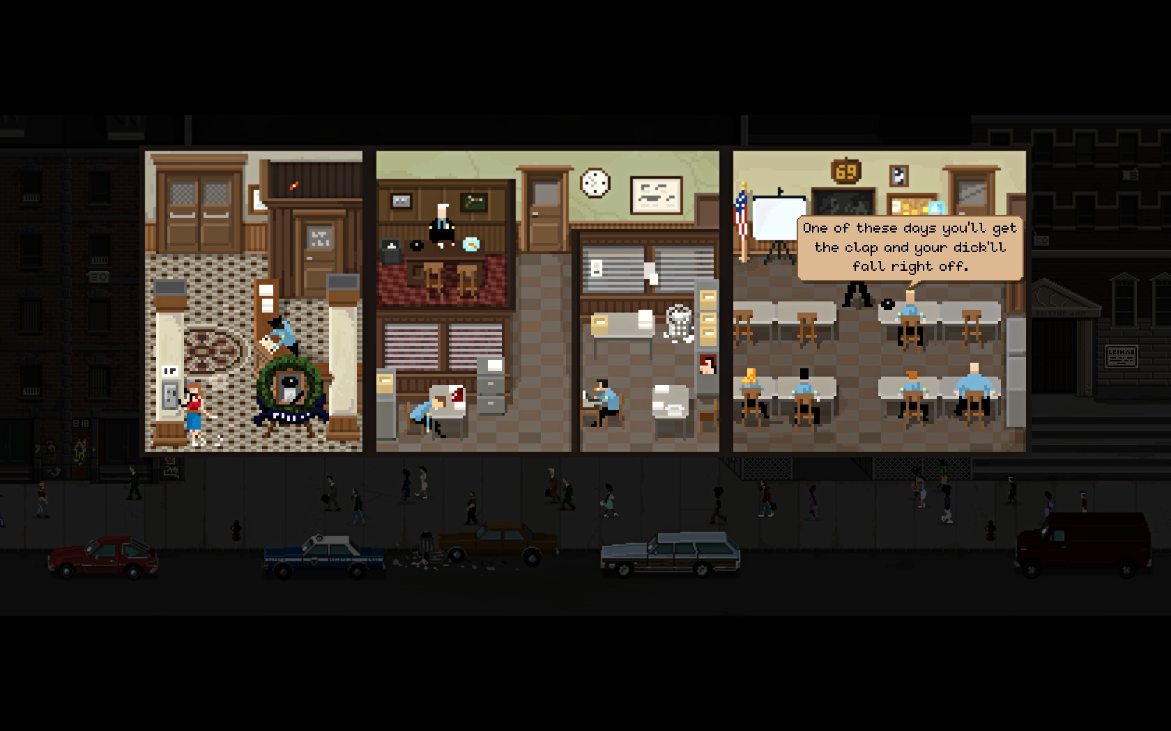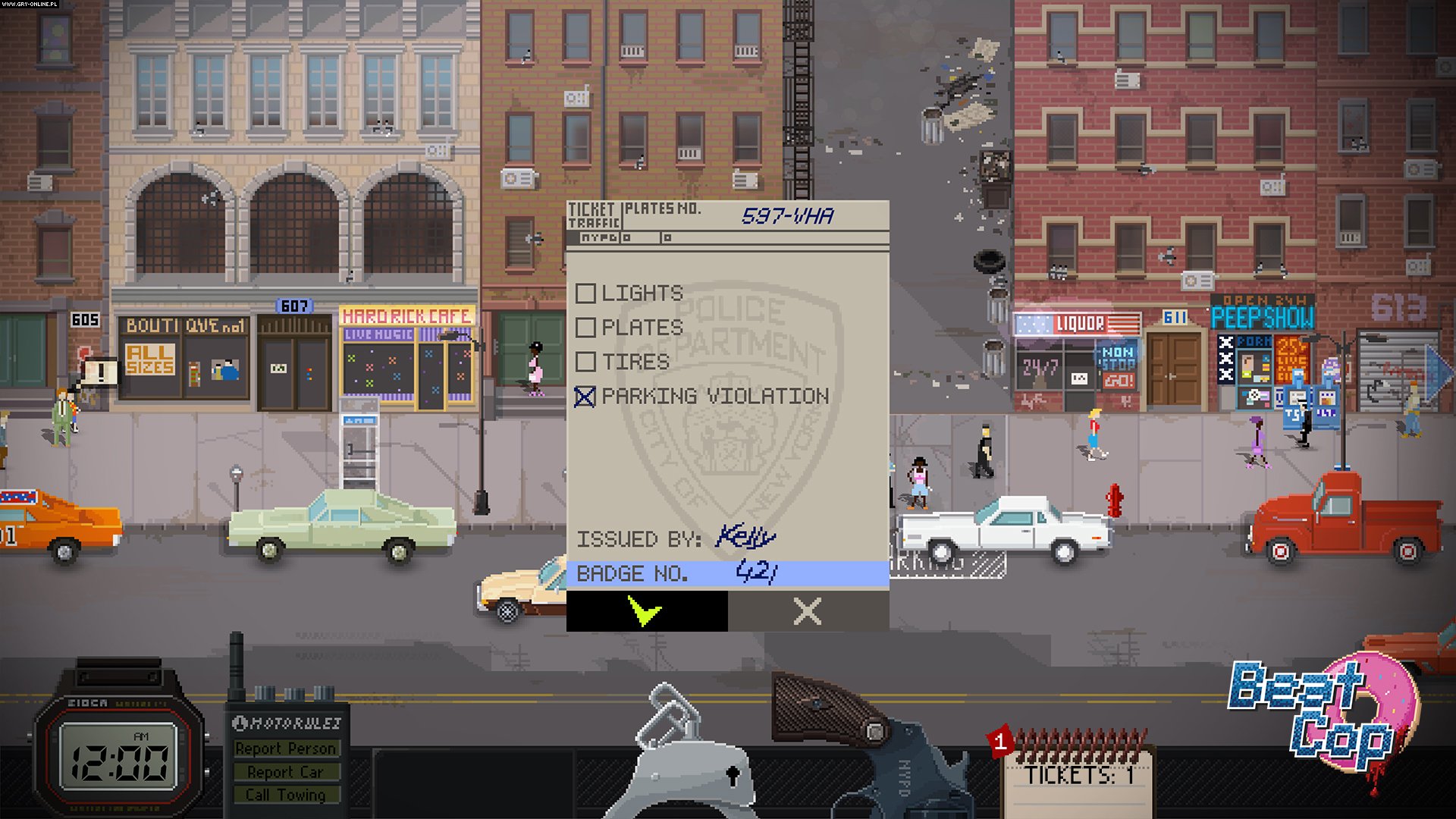 Beat Cop’s setting steals the show. A pixel neighborhood block bustling with cars, cats, and people becomes your new home away from home as you fill the shoes of a detective recently dropped to the lower ranks of being a street cop after a sordid scandal. Storefronts with neon lights enthrall you. The city is alive. Criminals are everywhere. Tickets must be written.