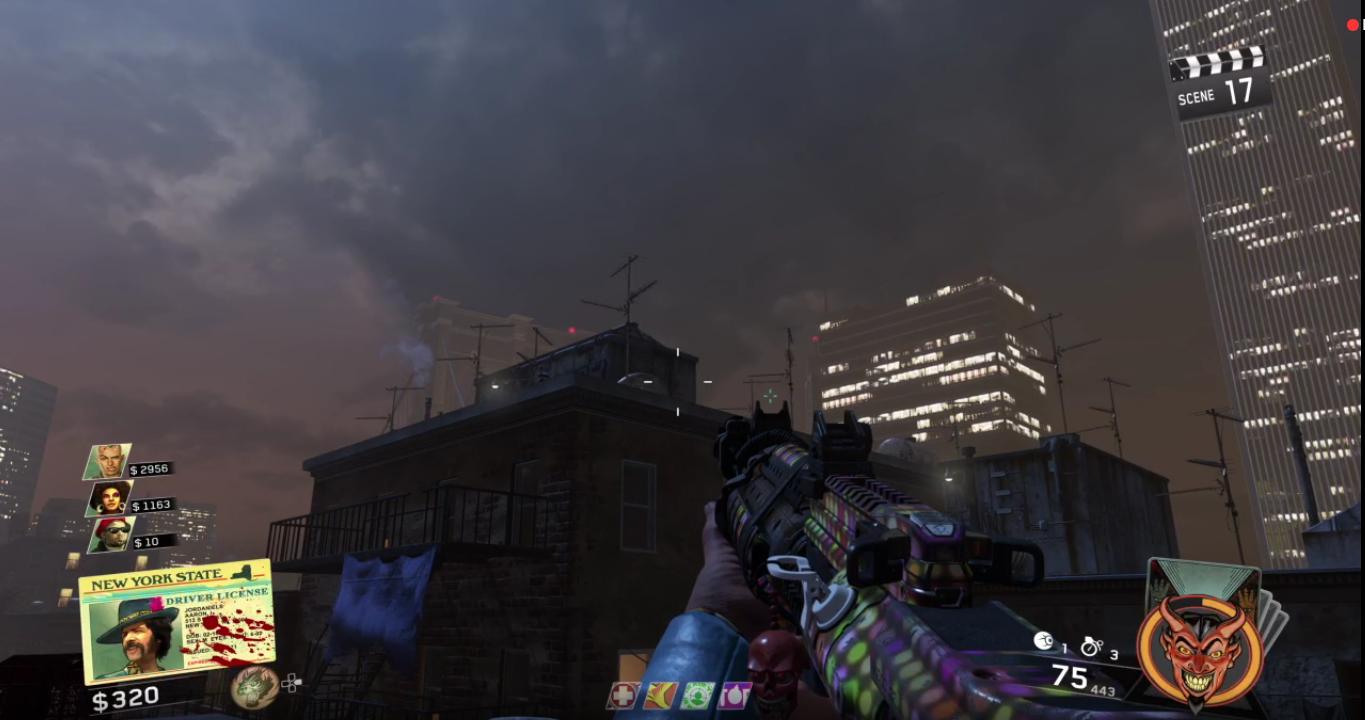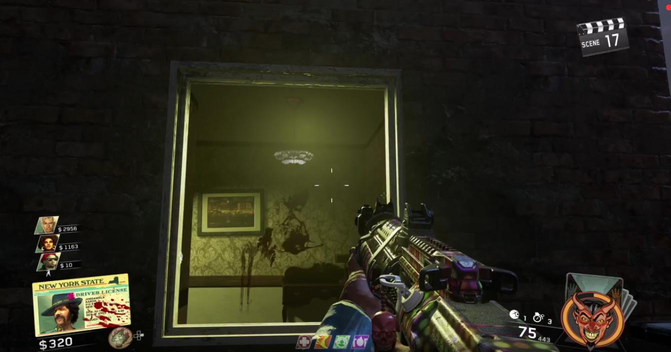 There’s another symbol to shoot to start the next sequence of events. Go to the Mule Munchies Perk Machine alleyway and climb the ladder. Look for an open window and shoot the symbol inside a building across the way.