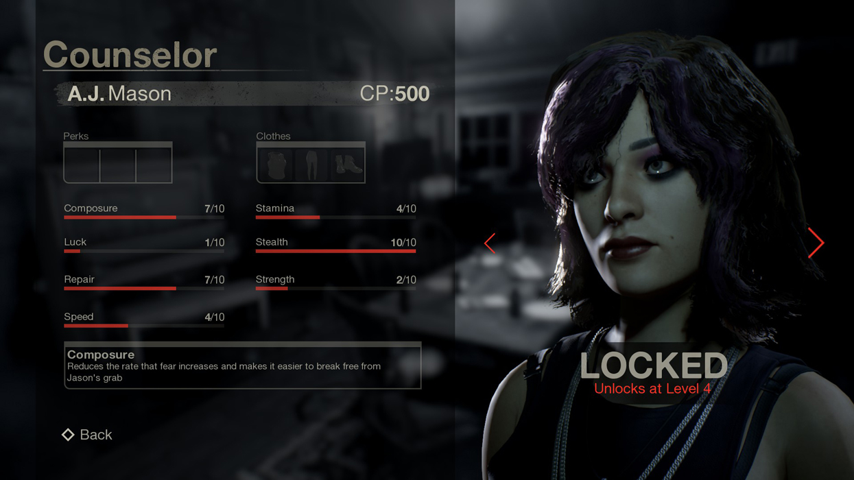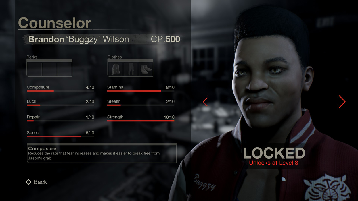 Composure: Reduces the rate that fear increases and makes it easier to break free from Jason’s grab.