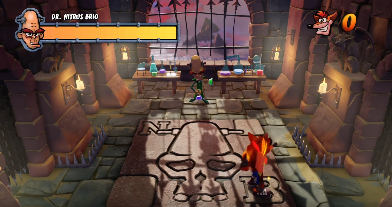 You’re just one boss away from the final boss when you reach Dr. Nitrus Brio. This fight can be tricky and may keep you on your toes. Dr. Nitrus Brio will have chemical vials to use as an attack during the first section of the fight.