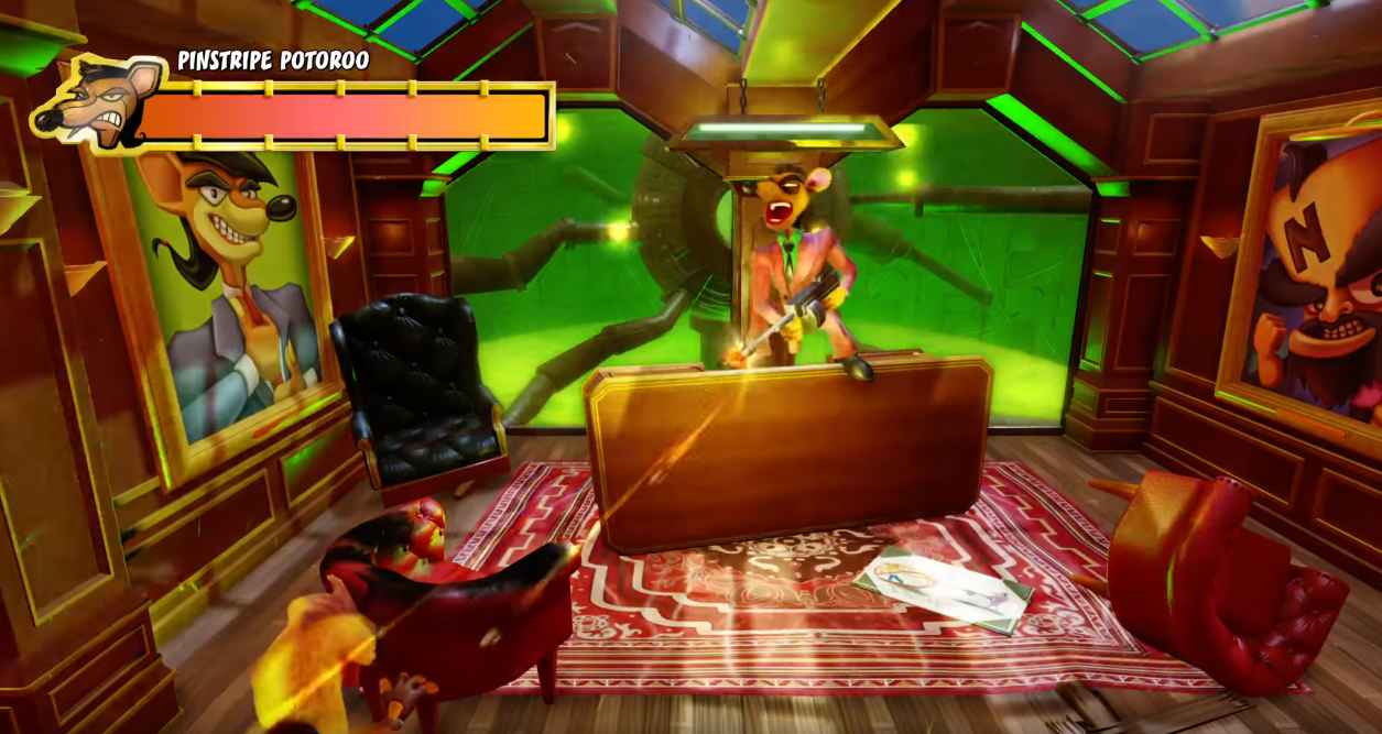 Pinstripe Potoroo is a shady business man who will use a machine gun against Crash Bandicoot. Don’t get greedy and try to rush Pinstripe Potoroo. Instead, coward behind a chair for safety until Potoroo finishes his round of firing. This is when you leap out from cover and spin attack the thug.