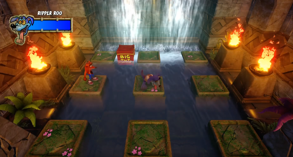 This may take some time but keep track of the pattern and have a total of three TNT crates go off next to Ripper Roo. After being hit three times by the TNT explosions, Ripper Roo will be defeated.