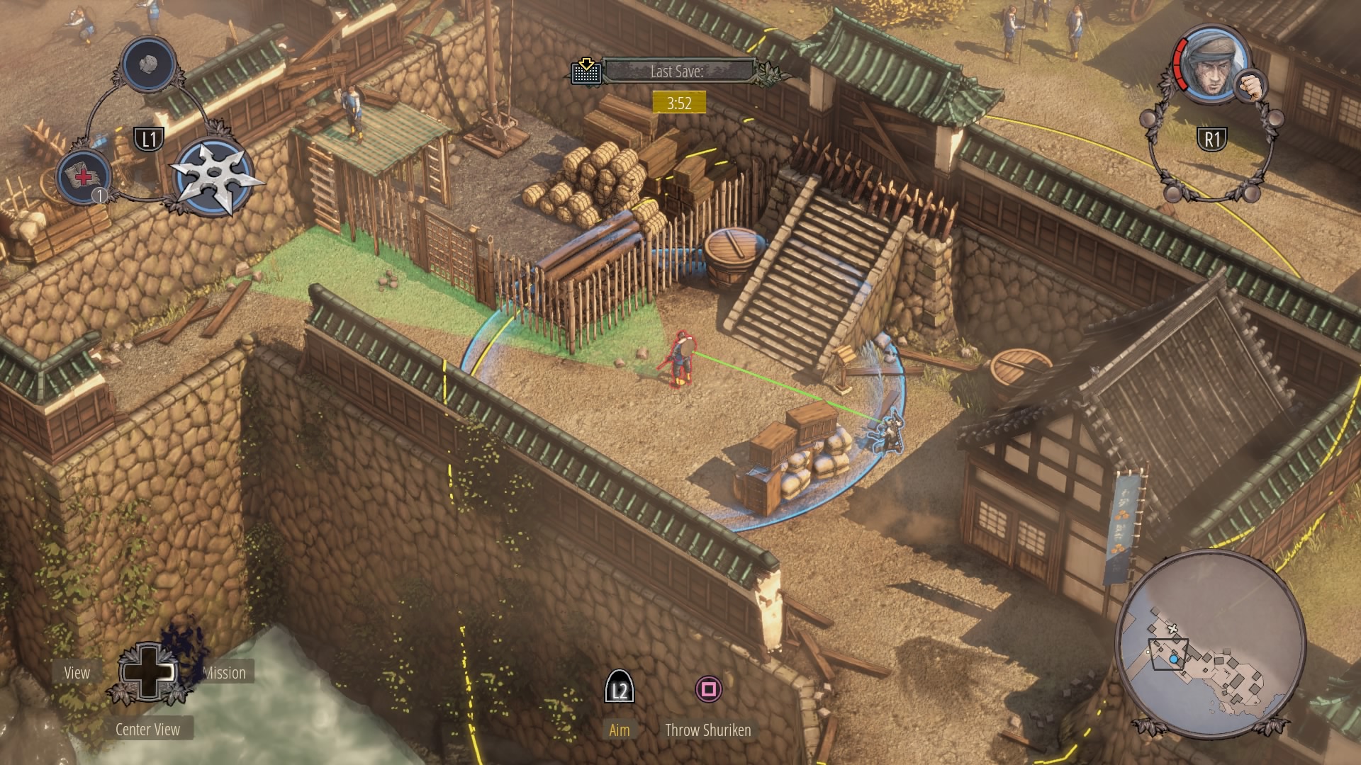 Dropping down, you’ll meet Mugen. He’s a hot-blooded samurai warrior, and he’s Hayato’s best bet to clear the goons protecting the front gates of the castle. Move out of cover and try using Hayato’s shuriken – it’s a one-hit kill, but can only be used at medium range. Kill the guard and hide his body in one of the barrels, then take care of the second guard on the scaffolding next to the bridge where Mugen is hiding. Don’t forget to collect your shuriken!