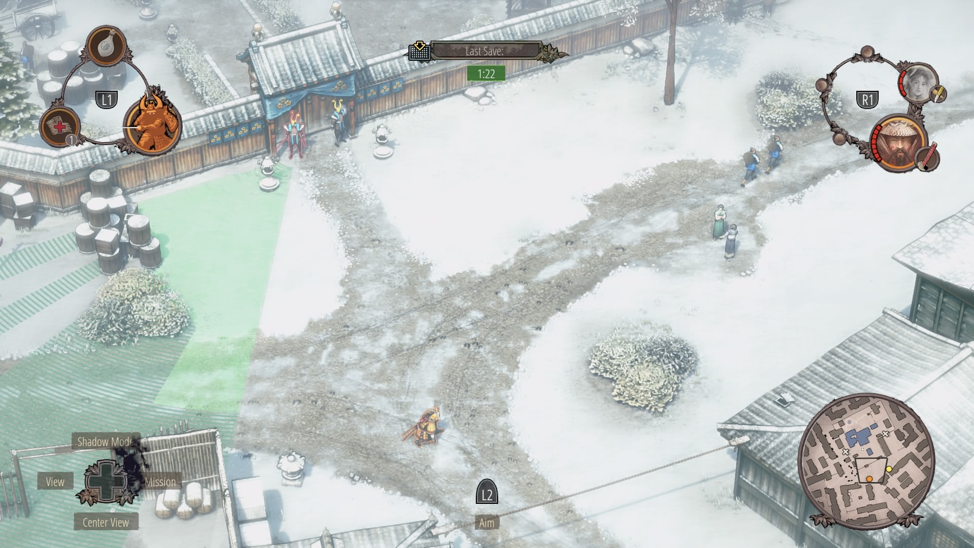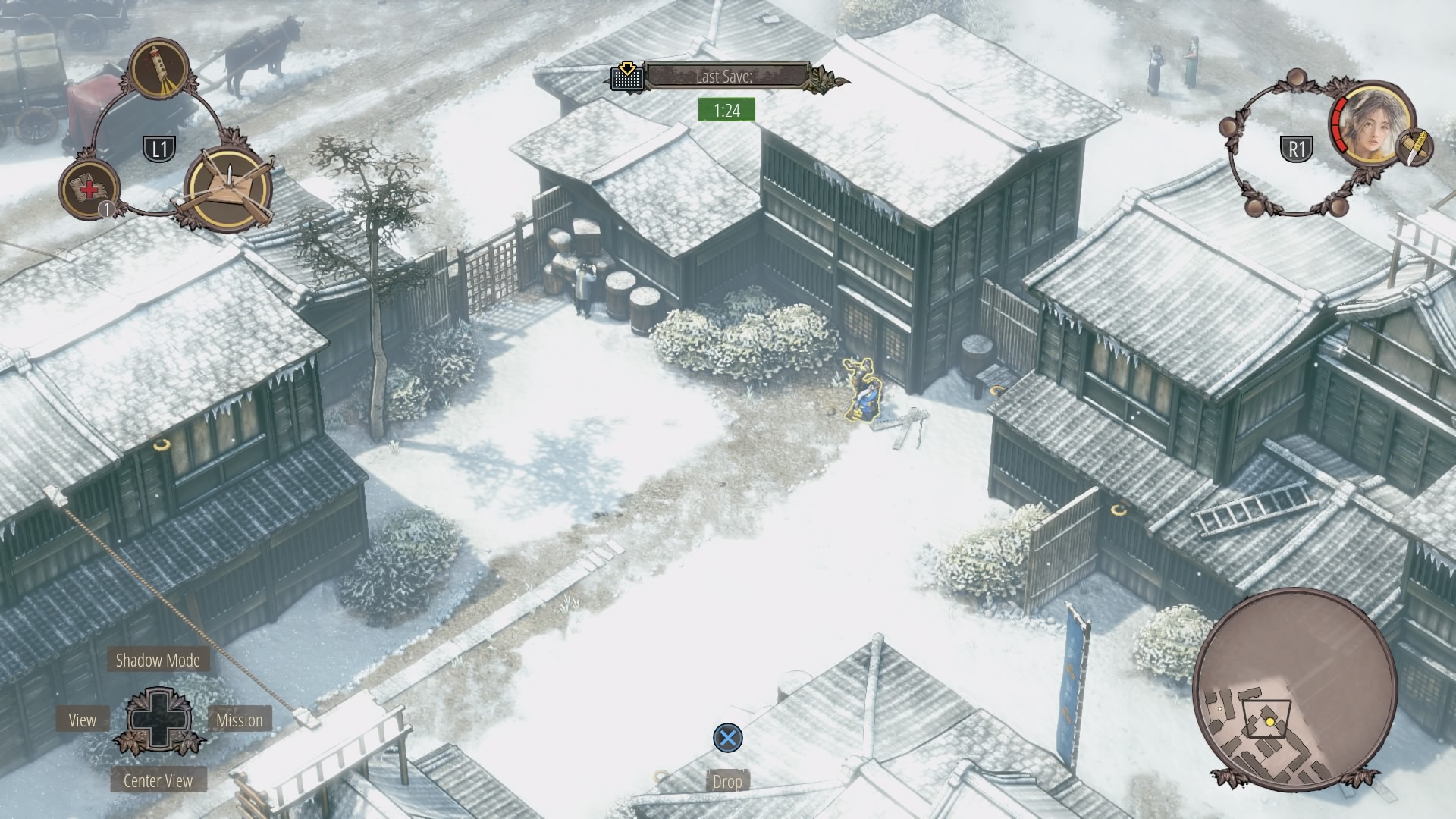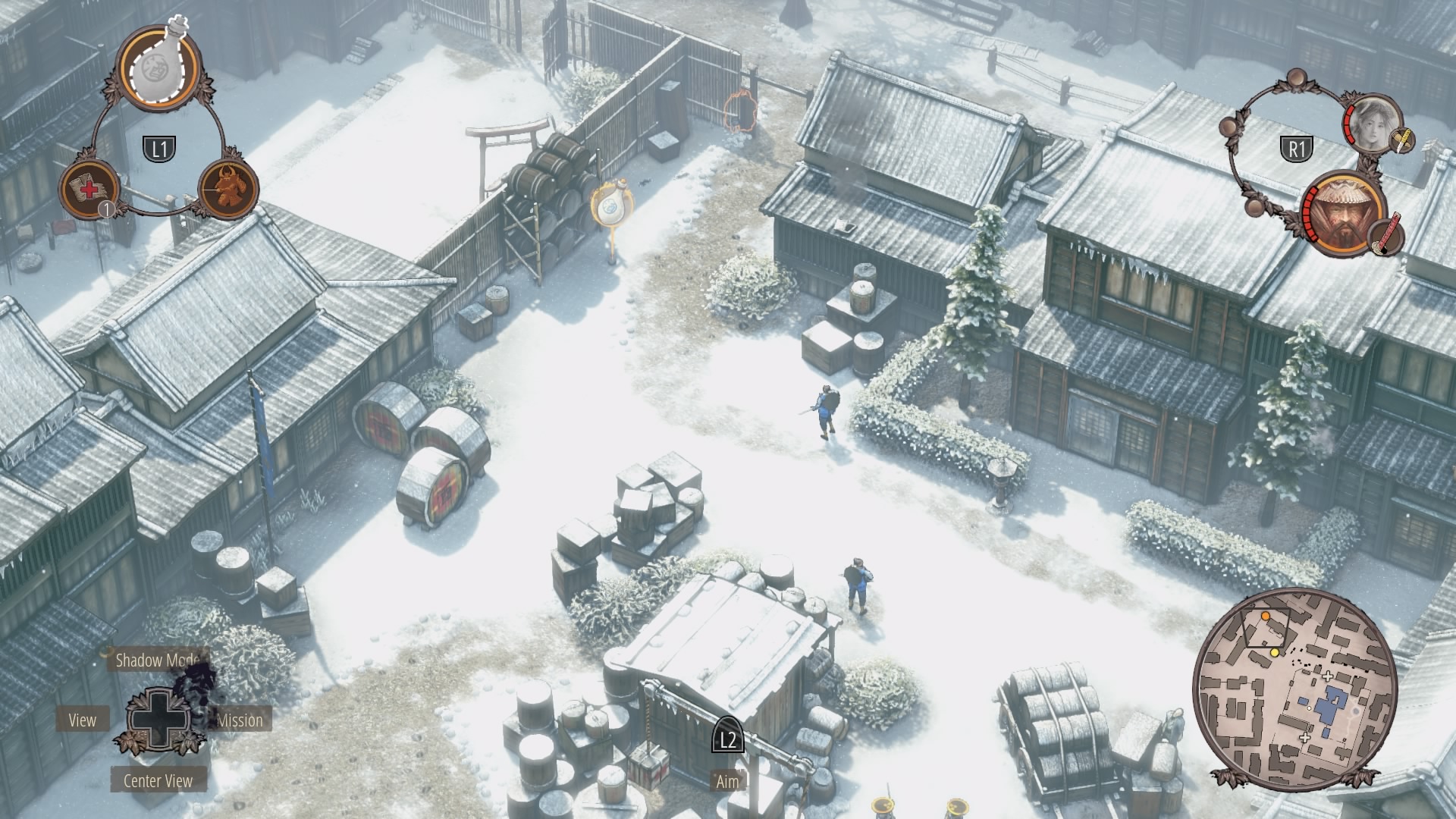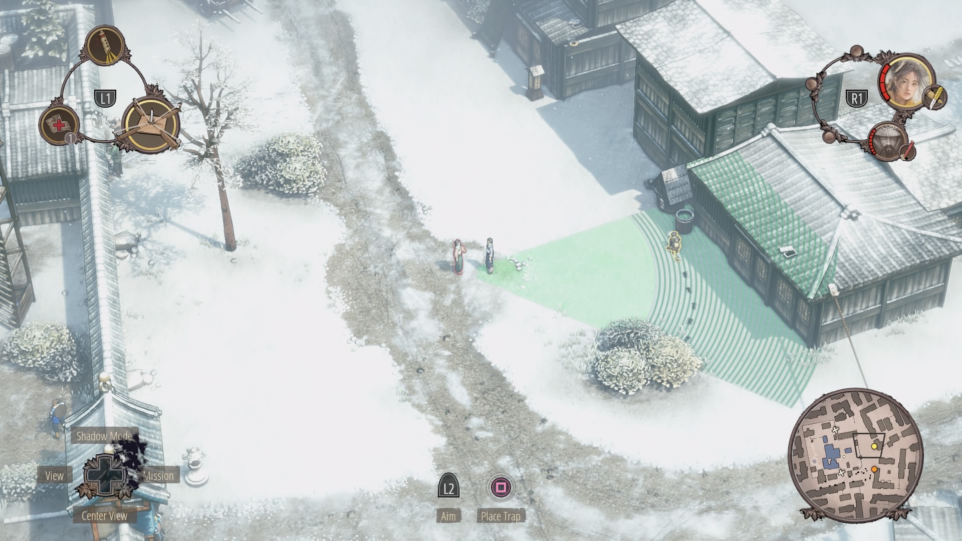 This mission puts you in control of Mugen and Yuki in the snowy village of Imai. At the start, you only have Yuki – our first objective is to meet with Mugen. He’s waiting in a courtyard to the northwest of Yuki’s position.