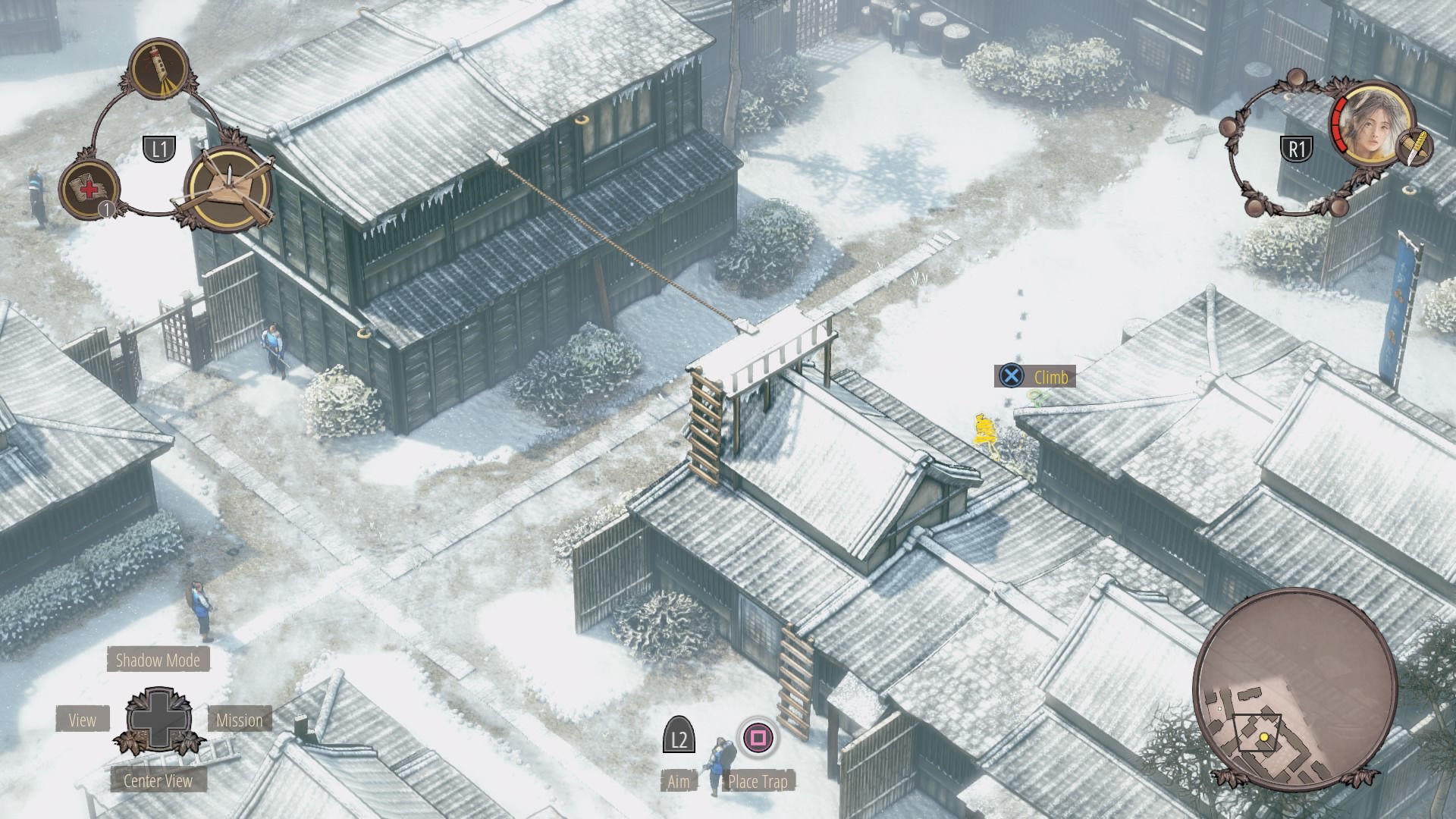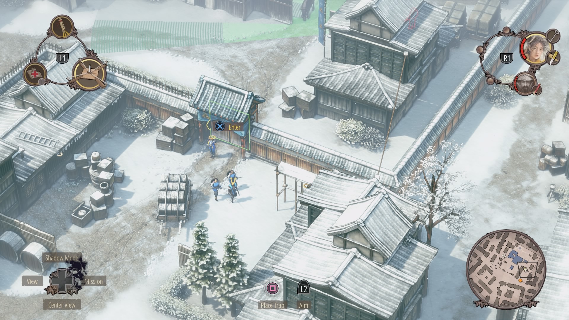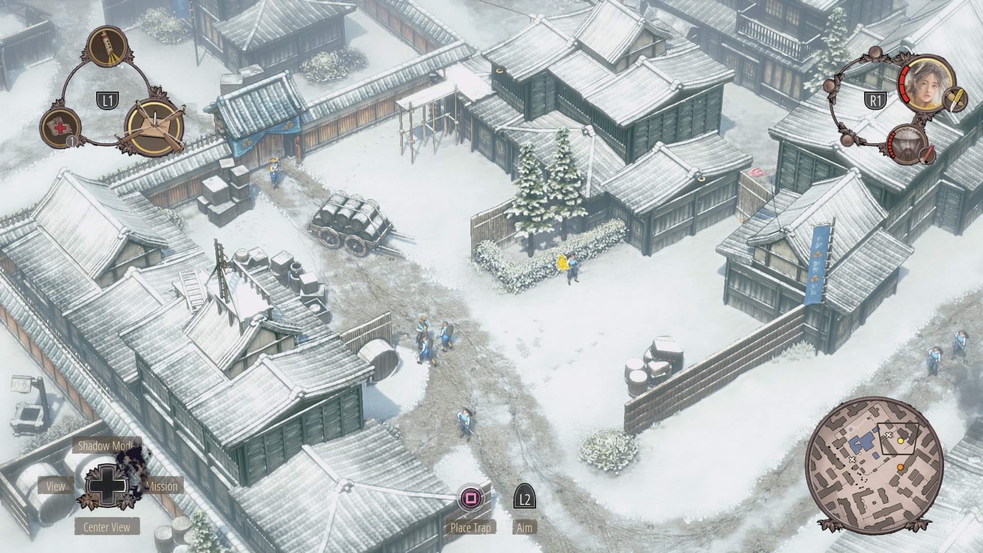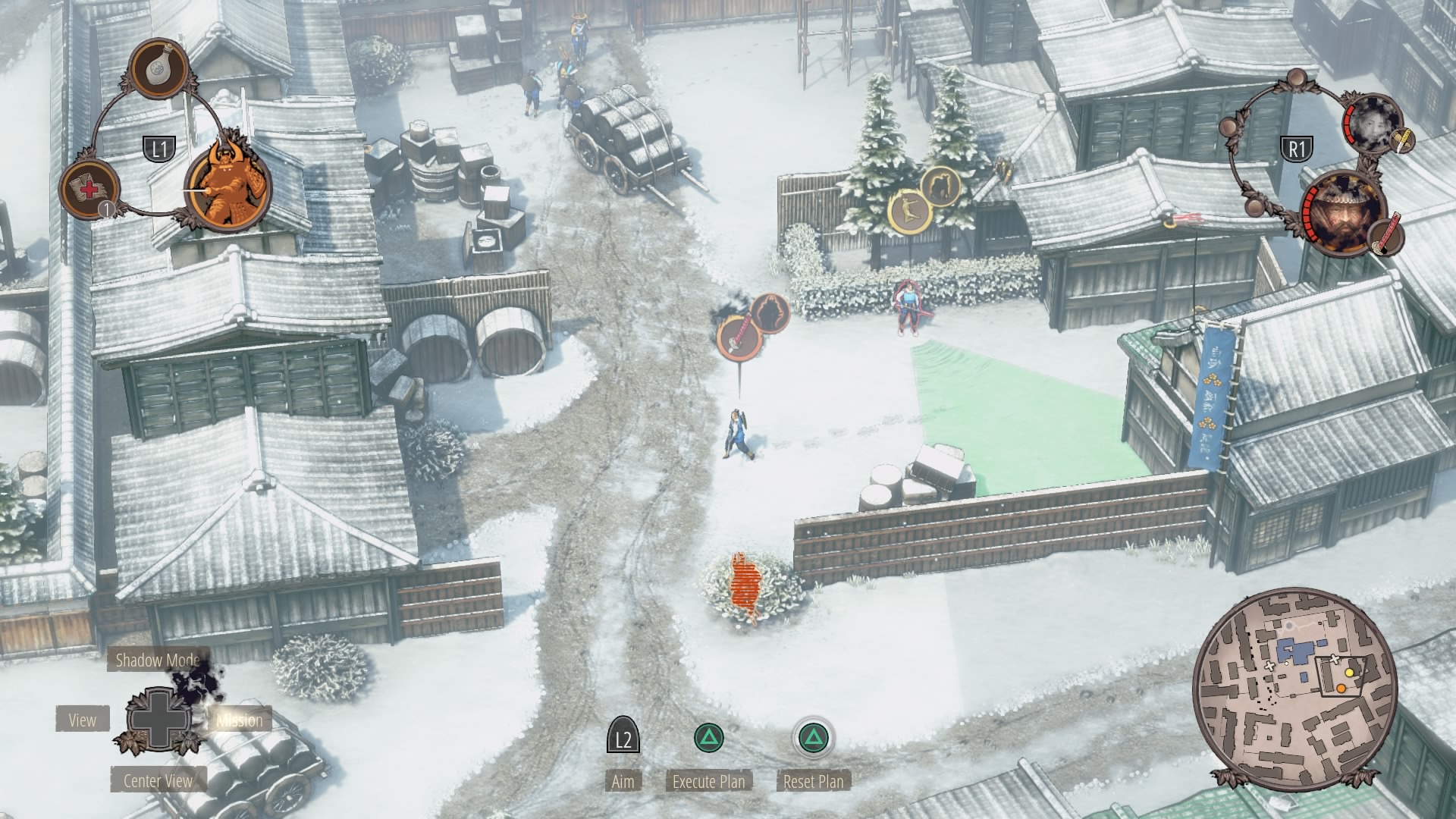 This mission puts you in control of Mugen and Yuki in the snowy village of Imai. At the start, you only have Yuki – our first objective is to meet with Mugen. He’s waiting in a courtyard to the northwest of Yuki’s position.