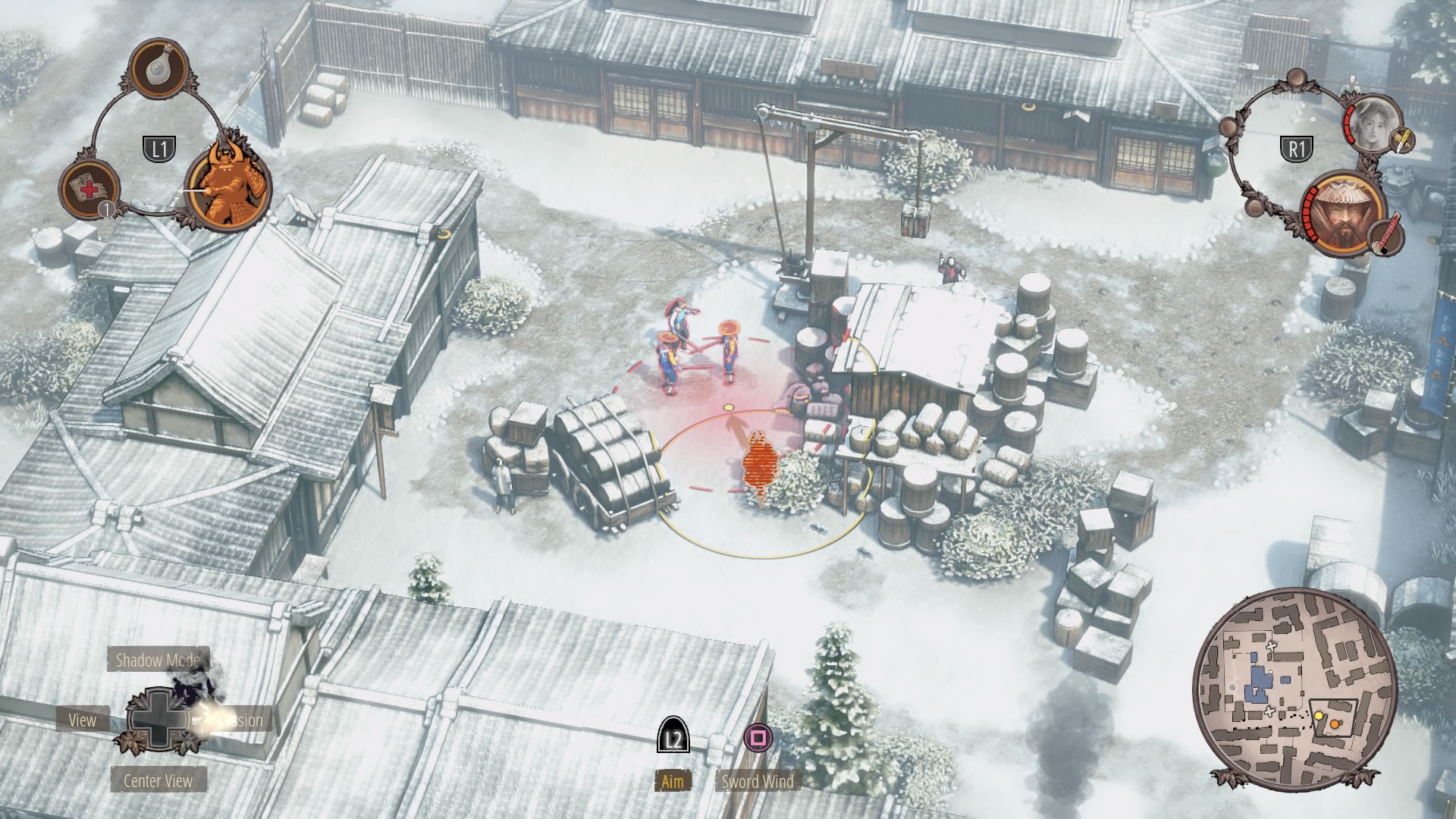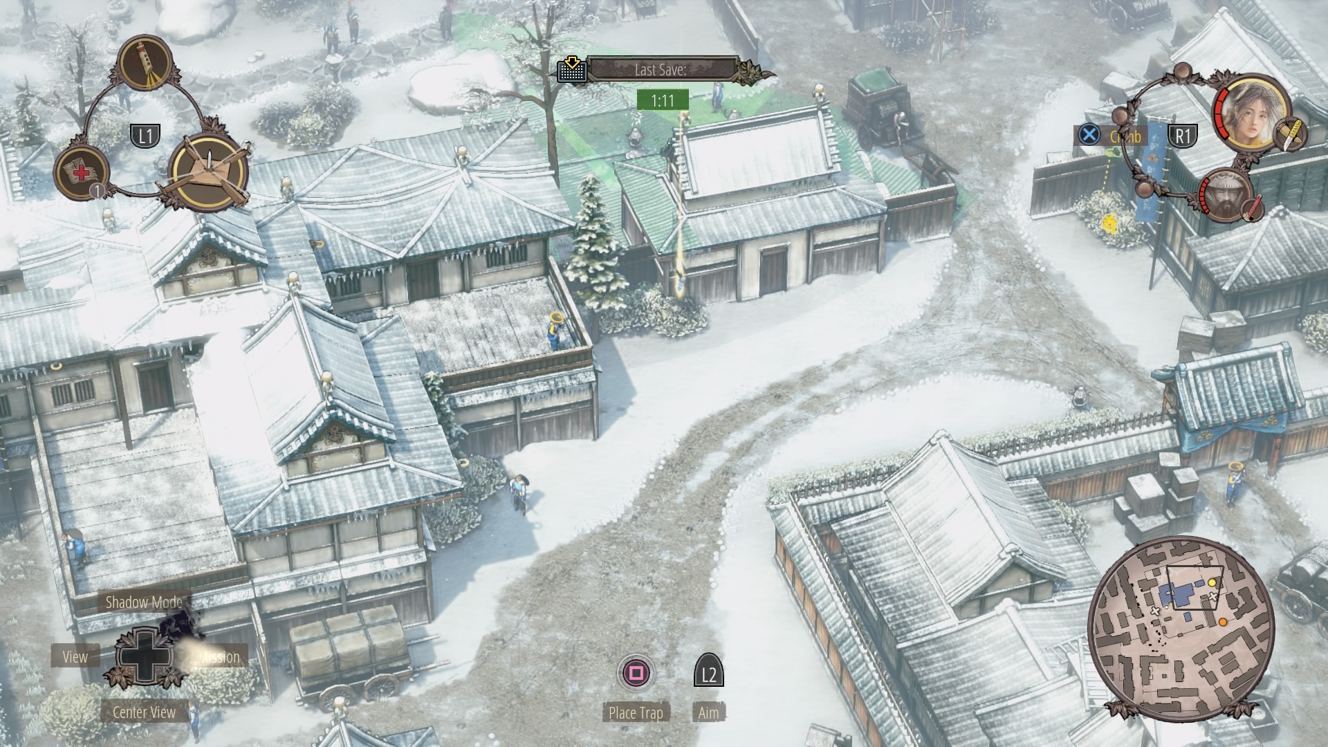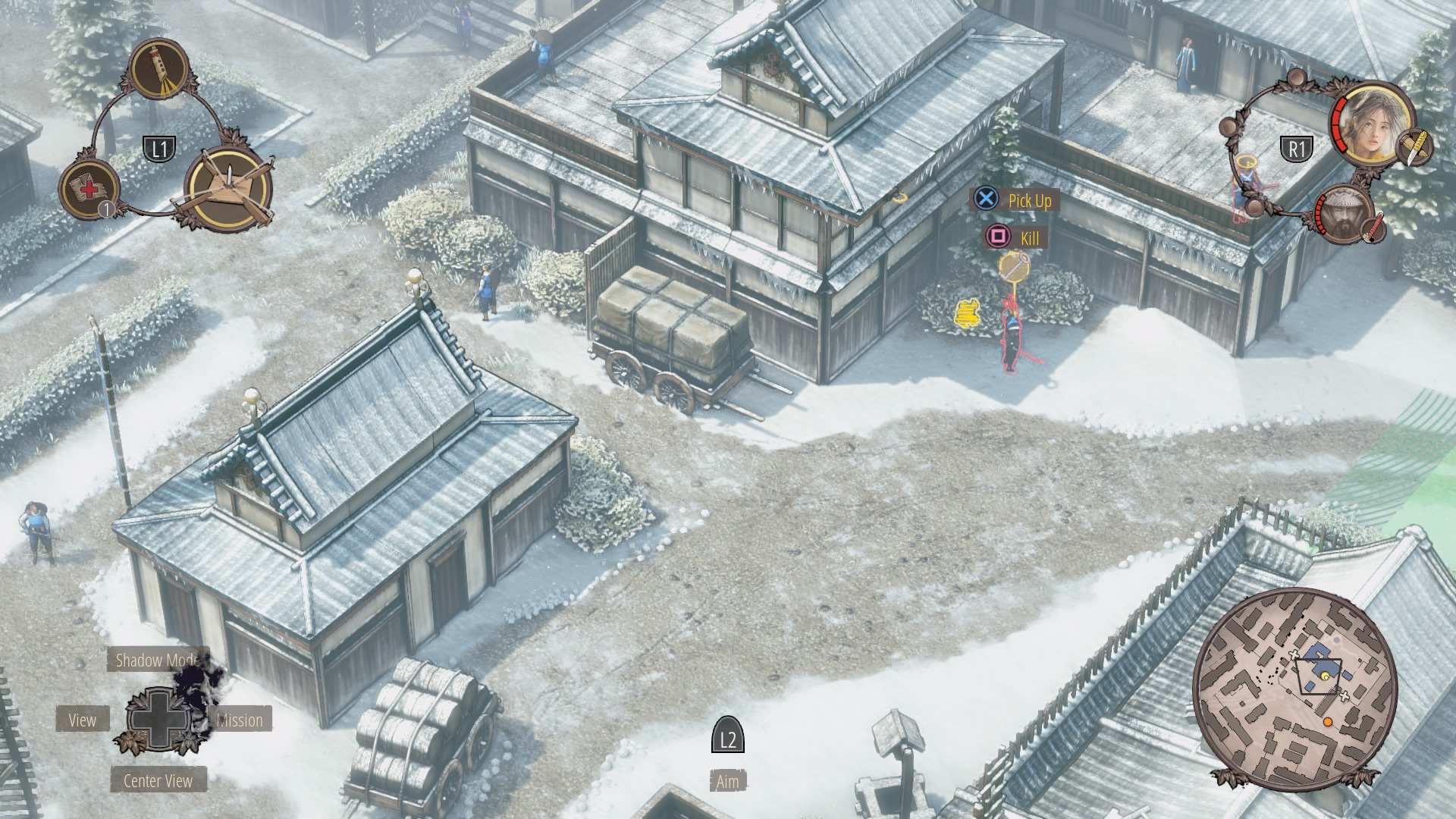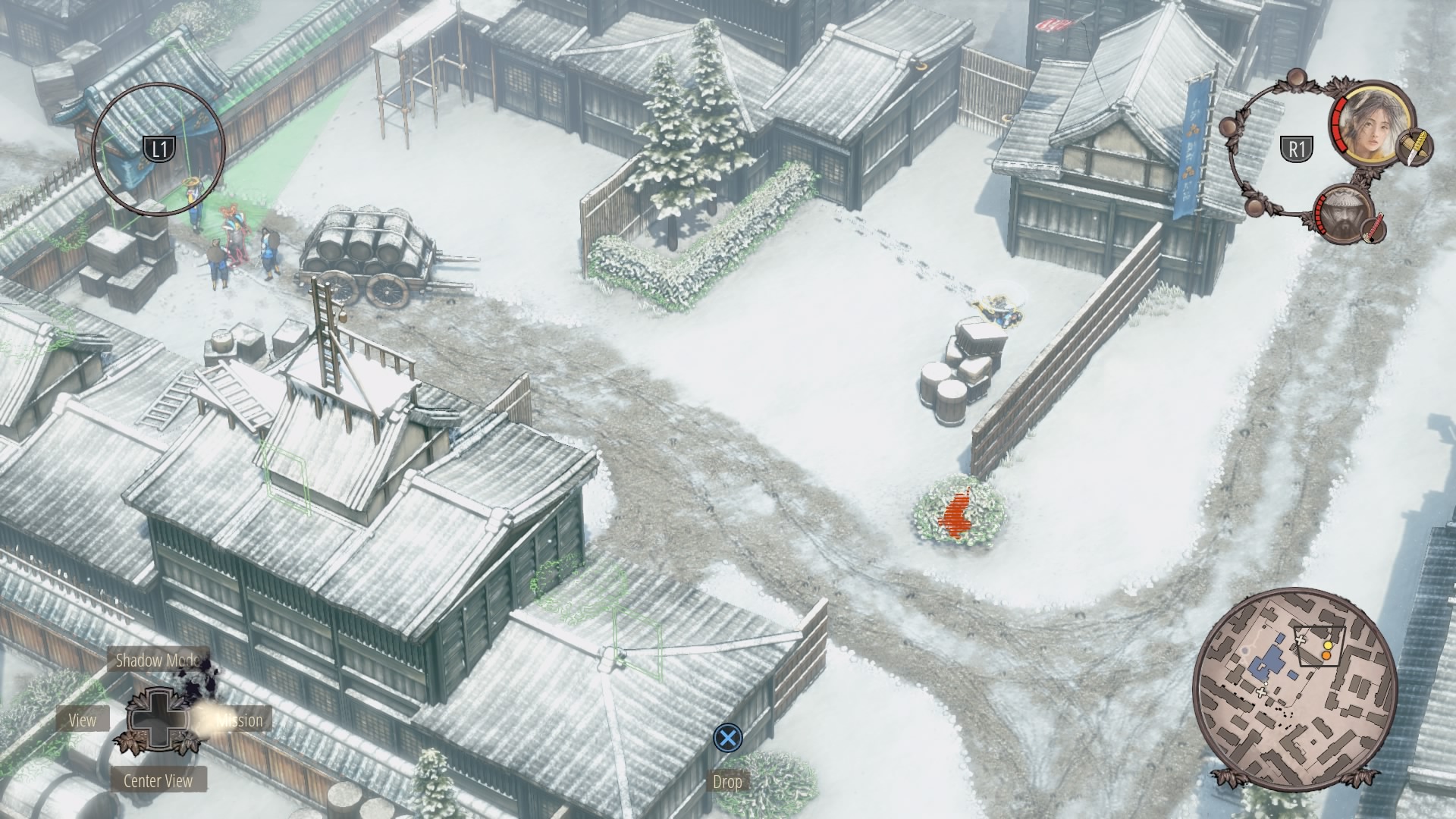 This mission puts you in control of Mugen and Yuki in the snowy village of Imai. At the start, you only have Yuki – our first objective is to meet with Mugen. He’s waiting in a courtyard to the northwest of Yuki’s position.