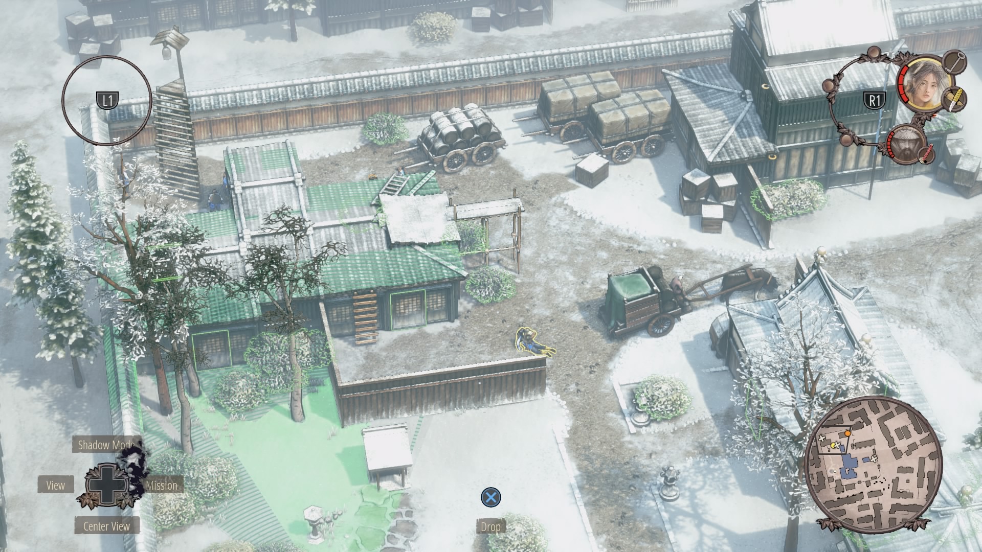 On the main road outside the compound, watch for the sake delivery cart that moves around the area. From the back curtain, Yuki can jump in and ride the cart to the north corner of the map. It’s useful for Mugen too – stand behind it to block view cones.