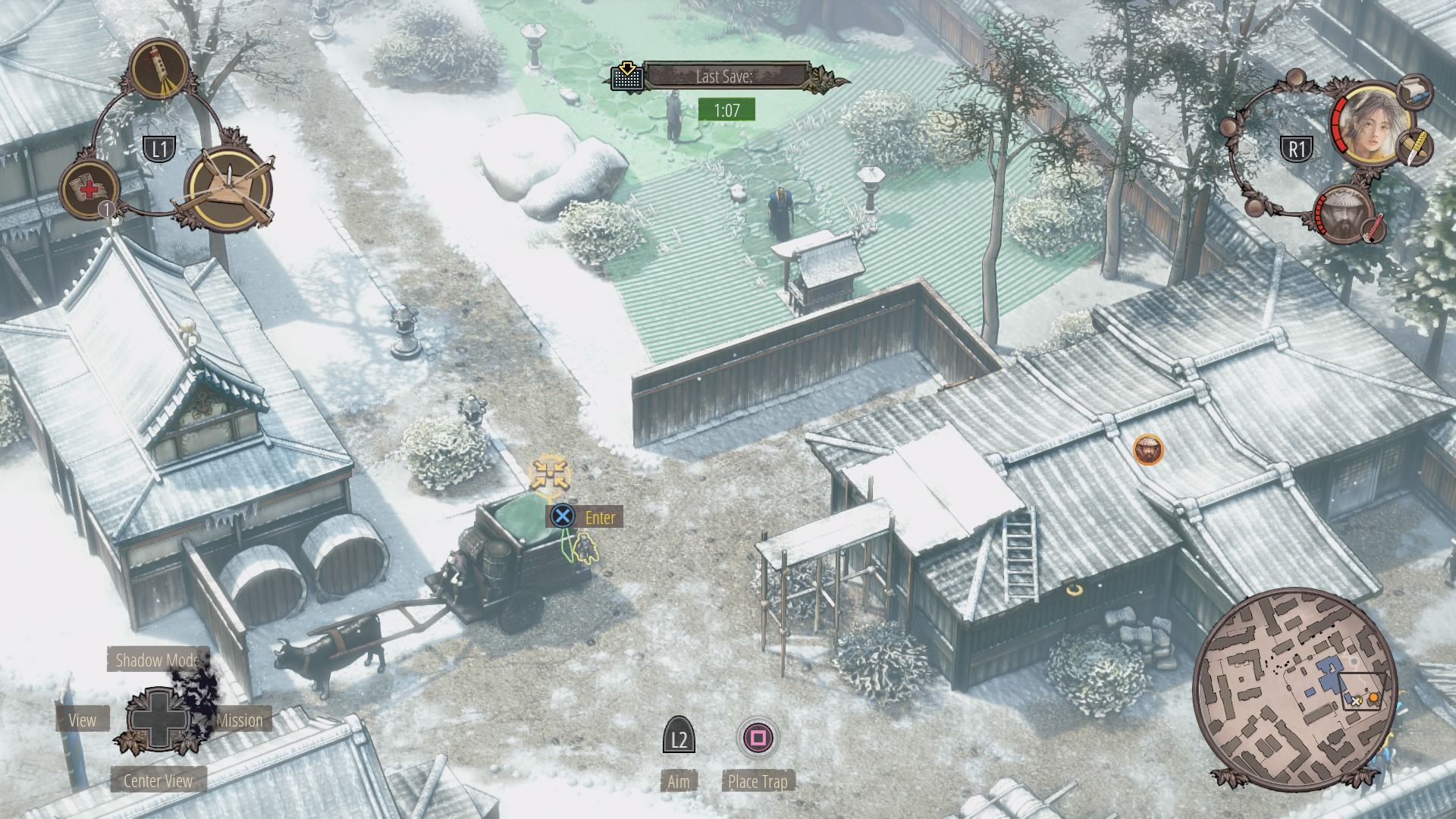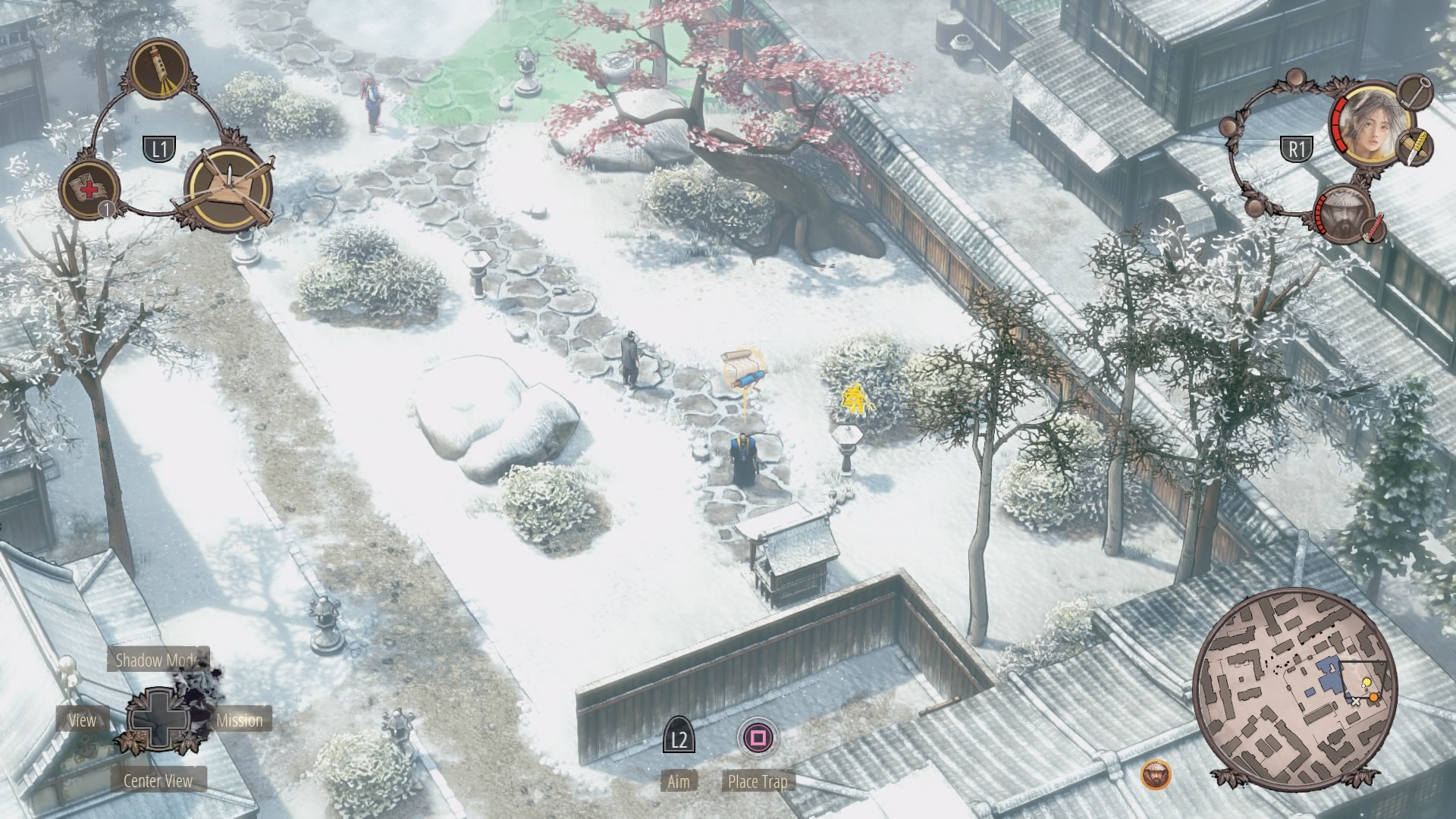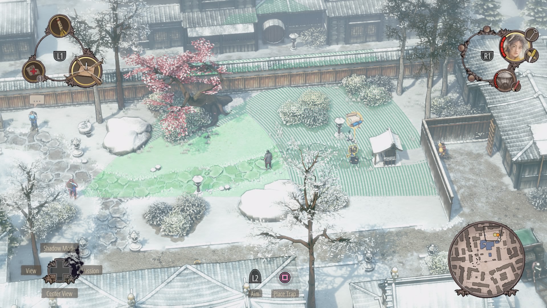 Only Yuki can steal the papers off the official in the garden. When his samurai bodyguards are gone, you can actually approach him. Let’s start from the eastern entrance to the garden, near the escape wagon.