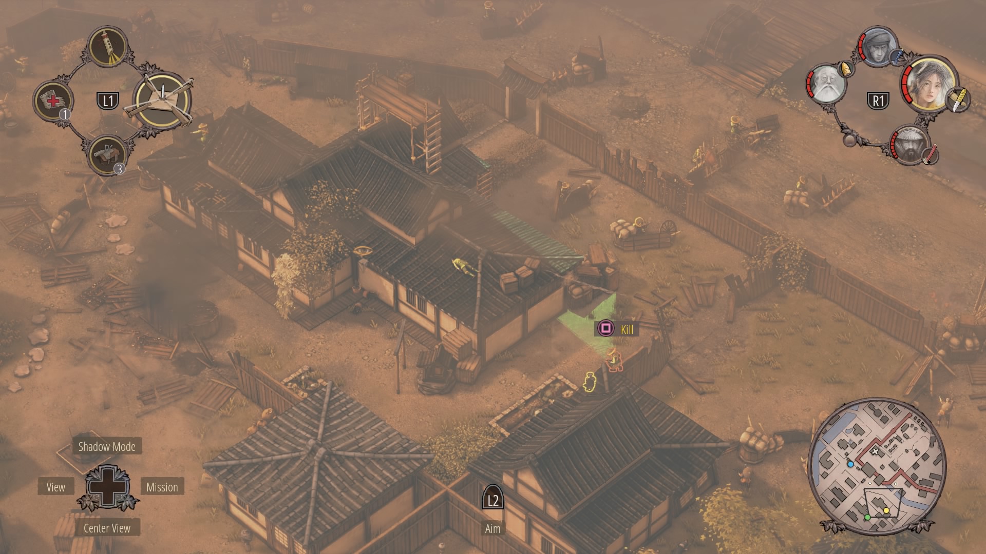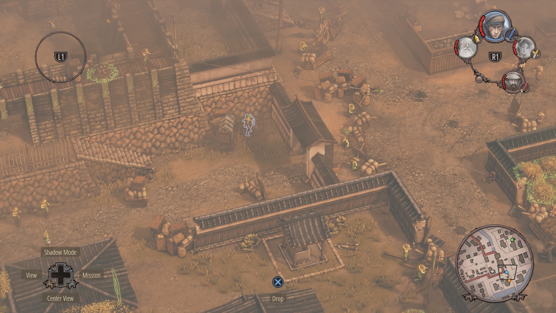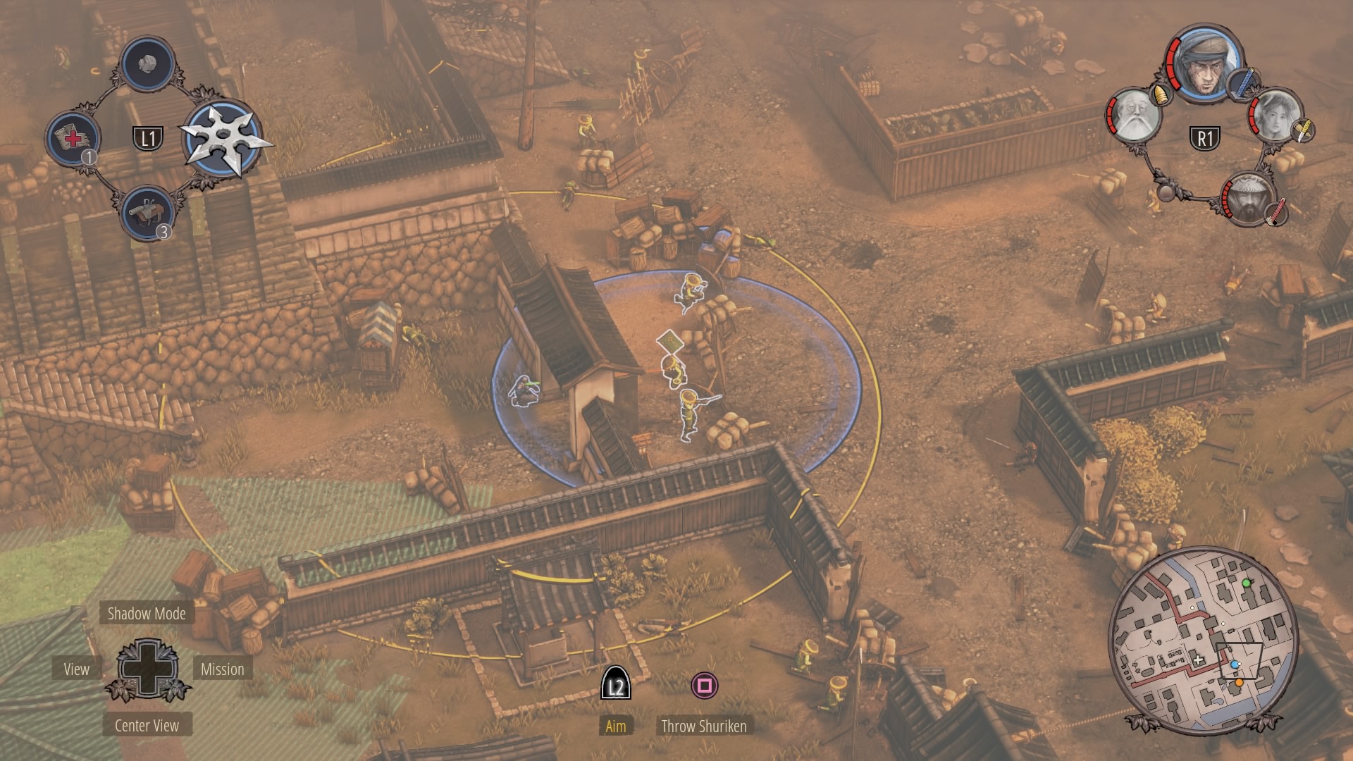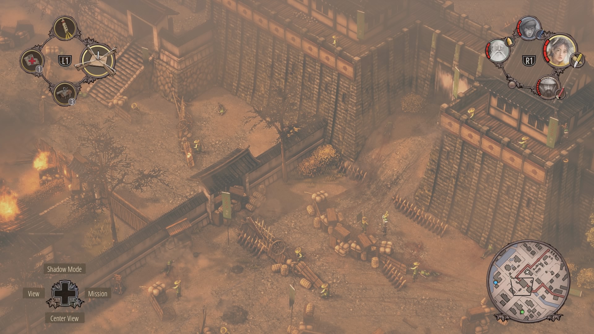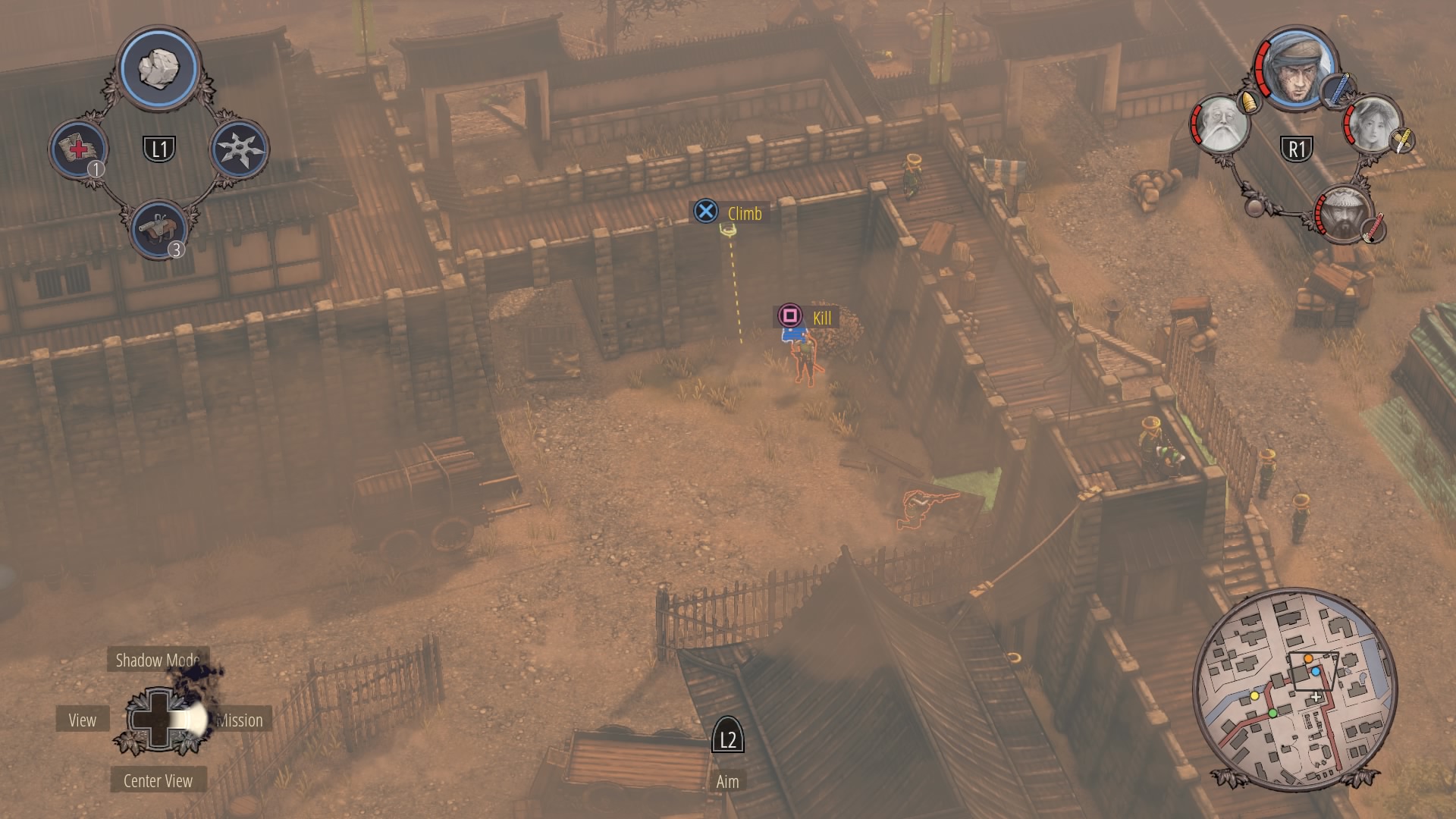 When the watchtower guard is gone, you can begin clearing the inner courtyard. Shadow Mode kill the two soldiers talking near the supply depot, then the patrolling samurai, and finally wipe out the soldiers at the prisoner pens. Use Mugen to kill the samurai on the walls.