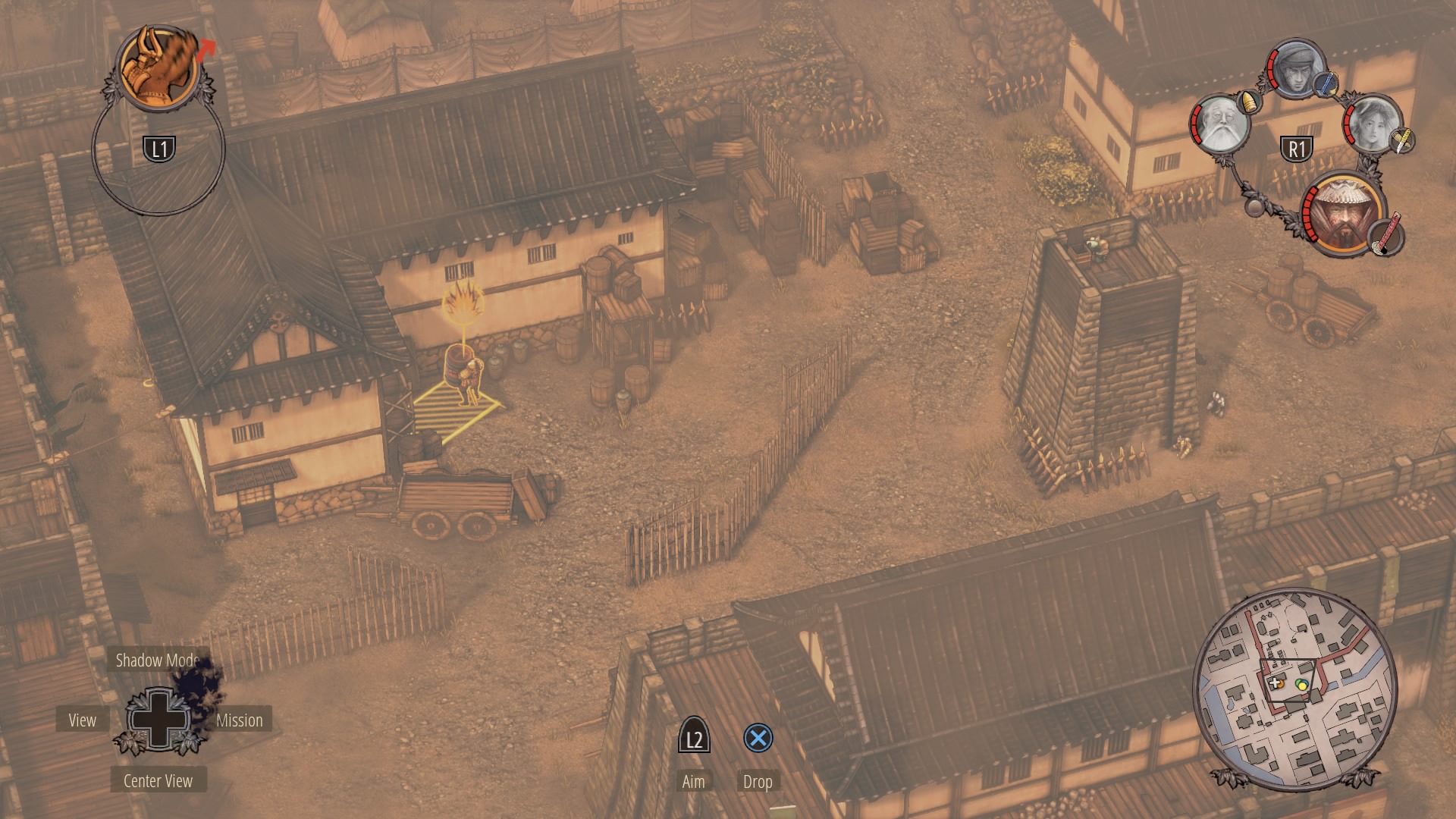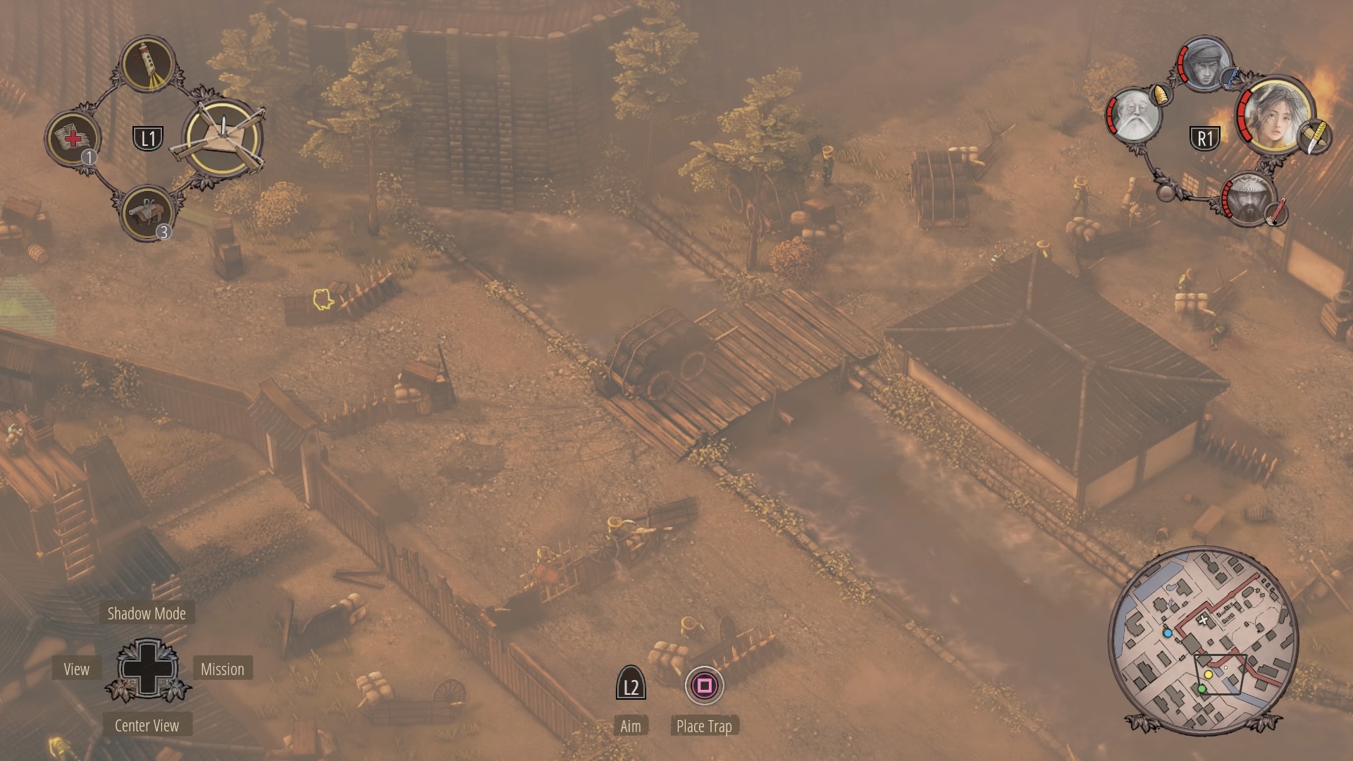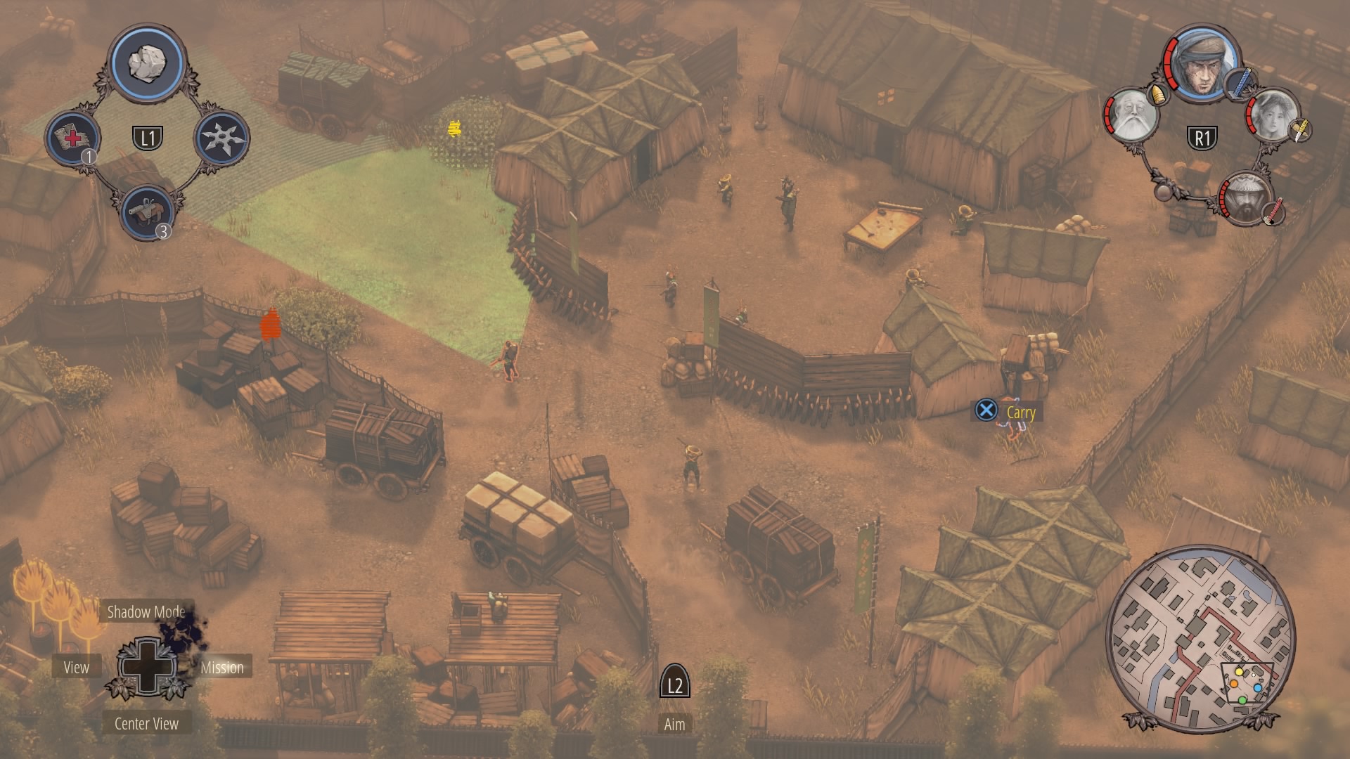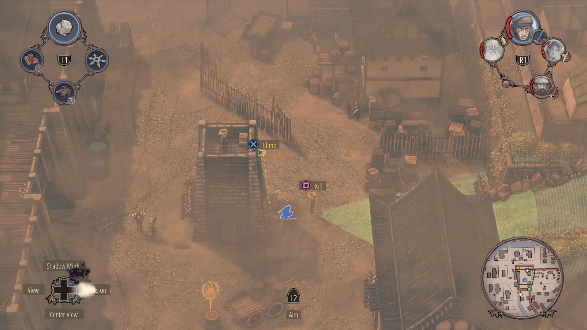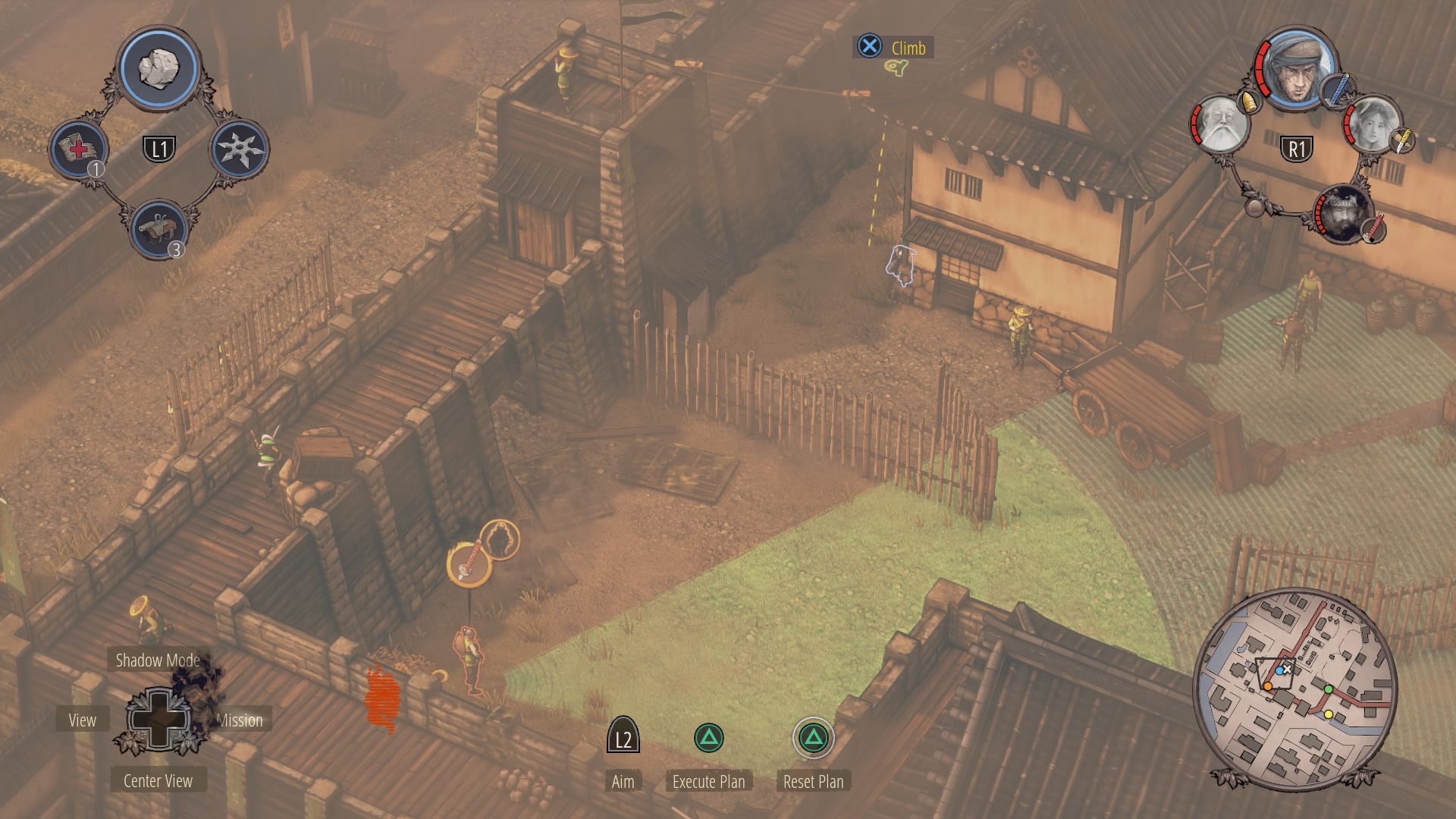 When the watchtower guard is gone, you can begin clearing the inner courtyard. Shadow Mode kill the two soldiers talking near the supply depot, then the patrolling samurai, and finally wipe out the soldiers at the prisoner pens. Use Mugen to kill the samurai on the walls.