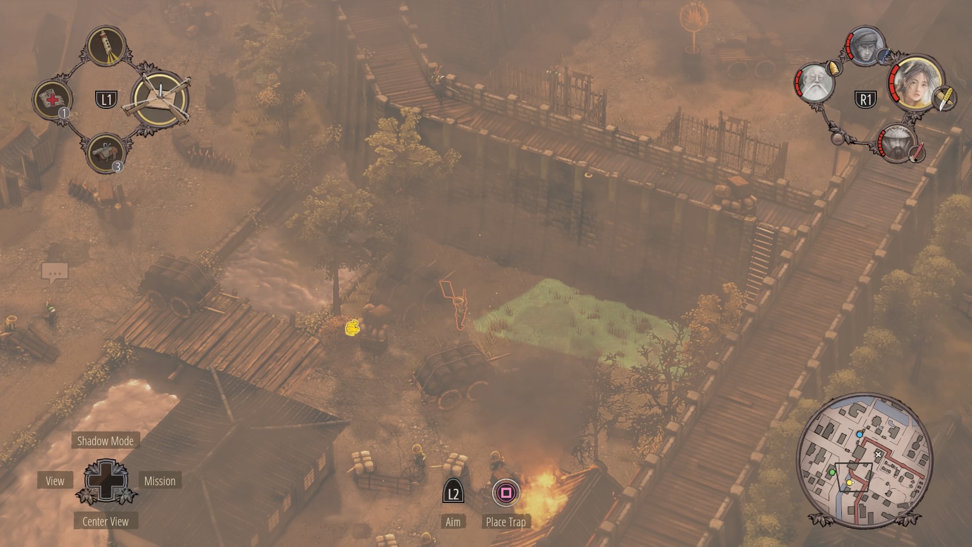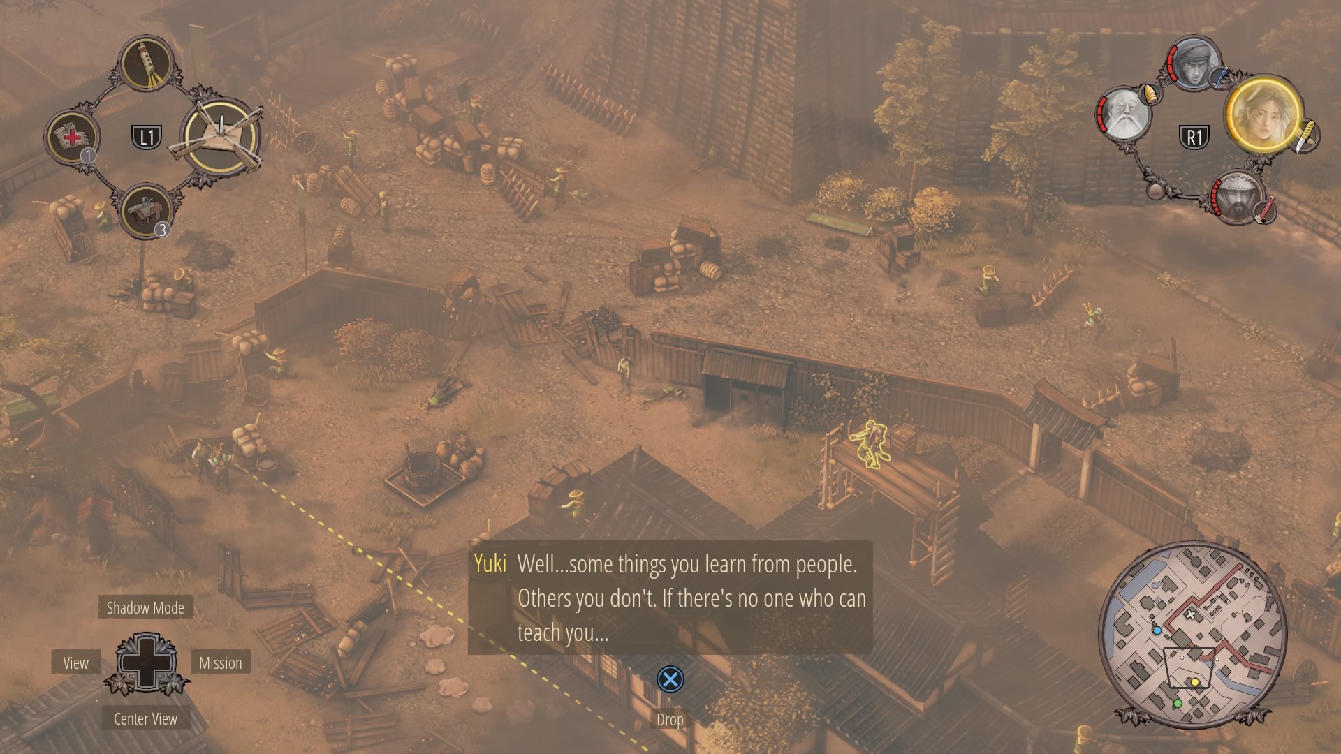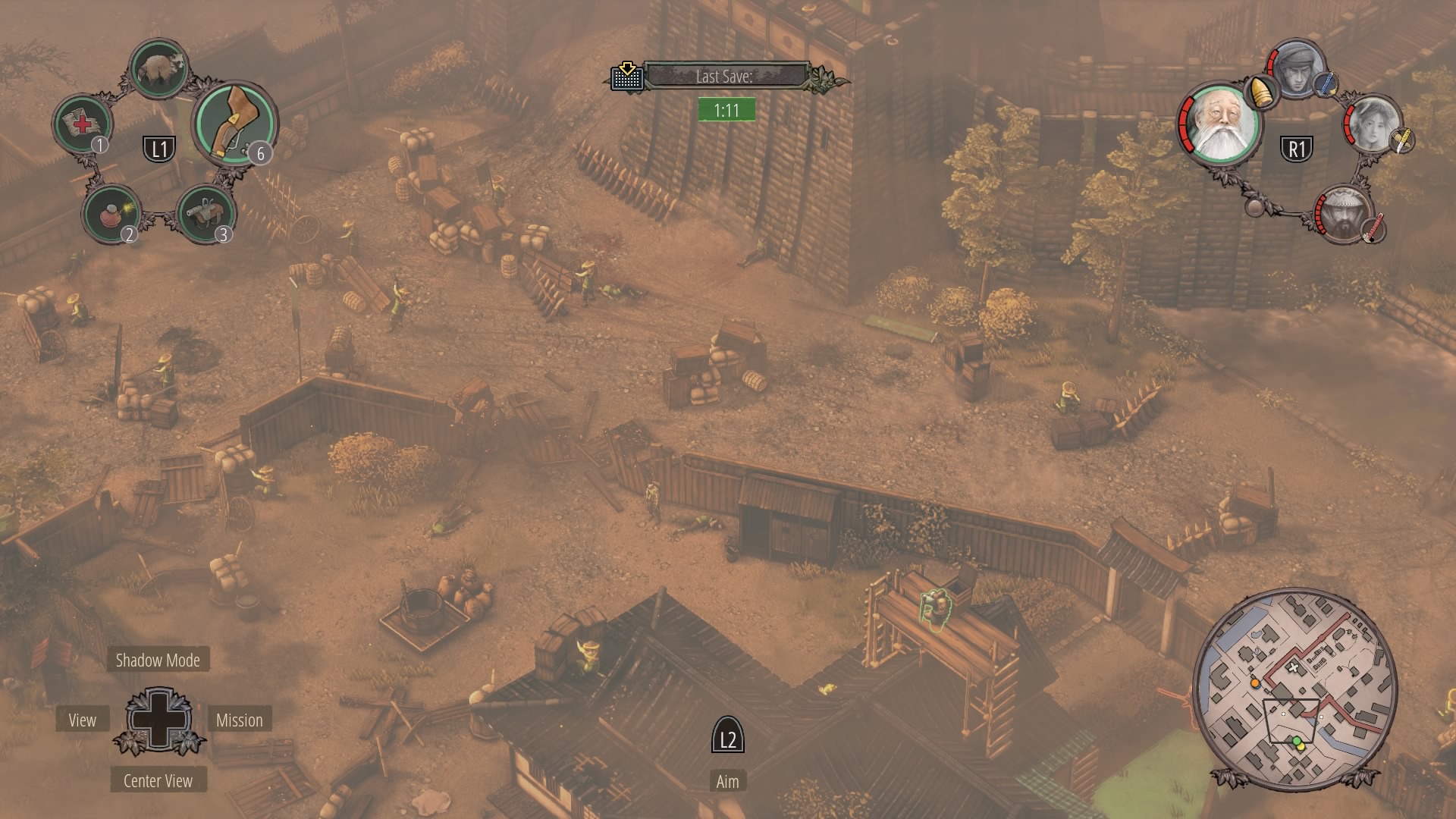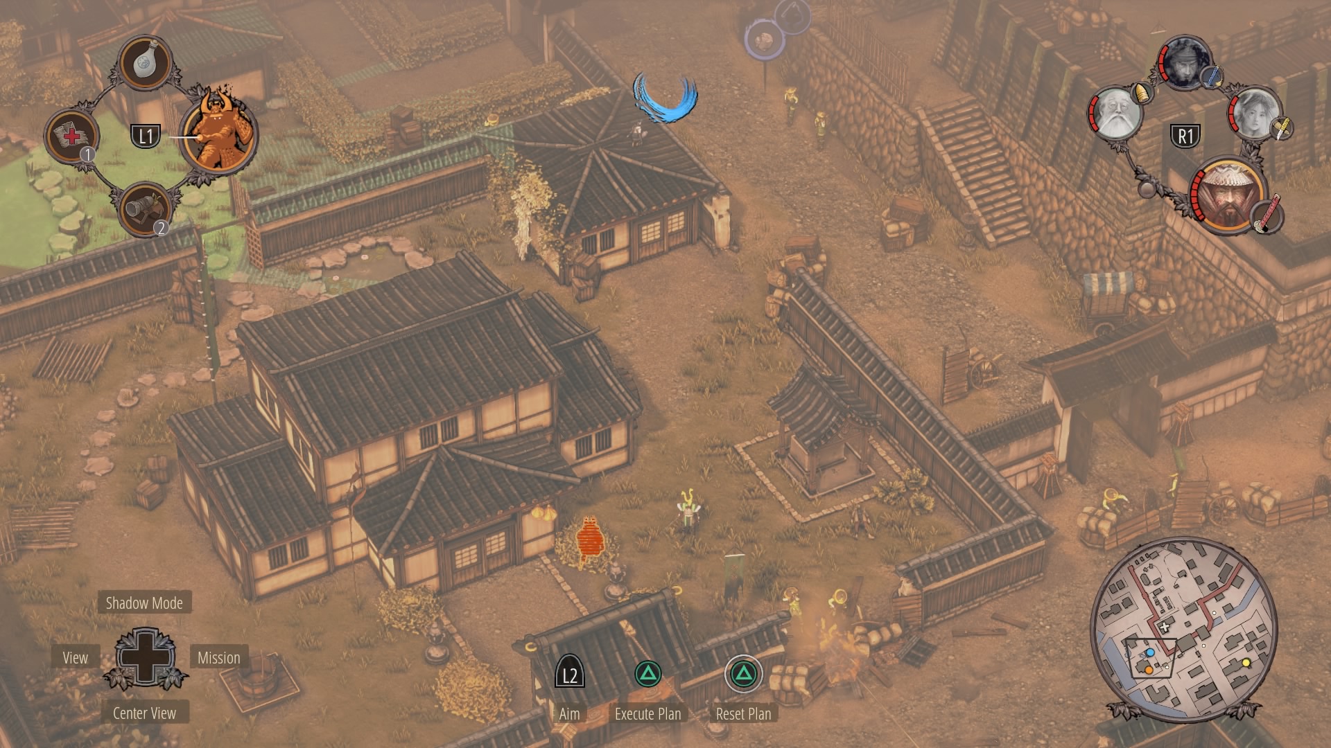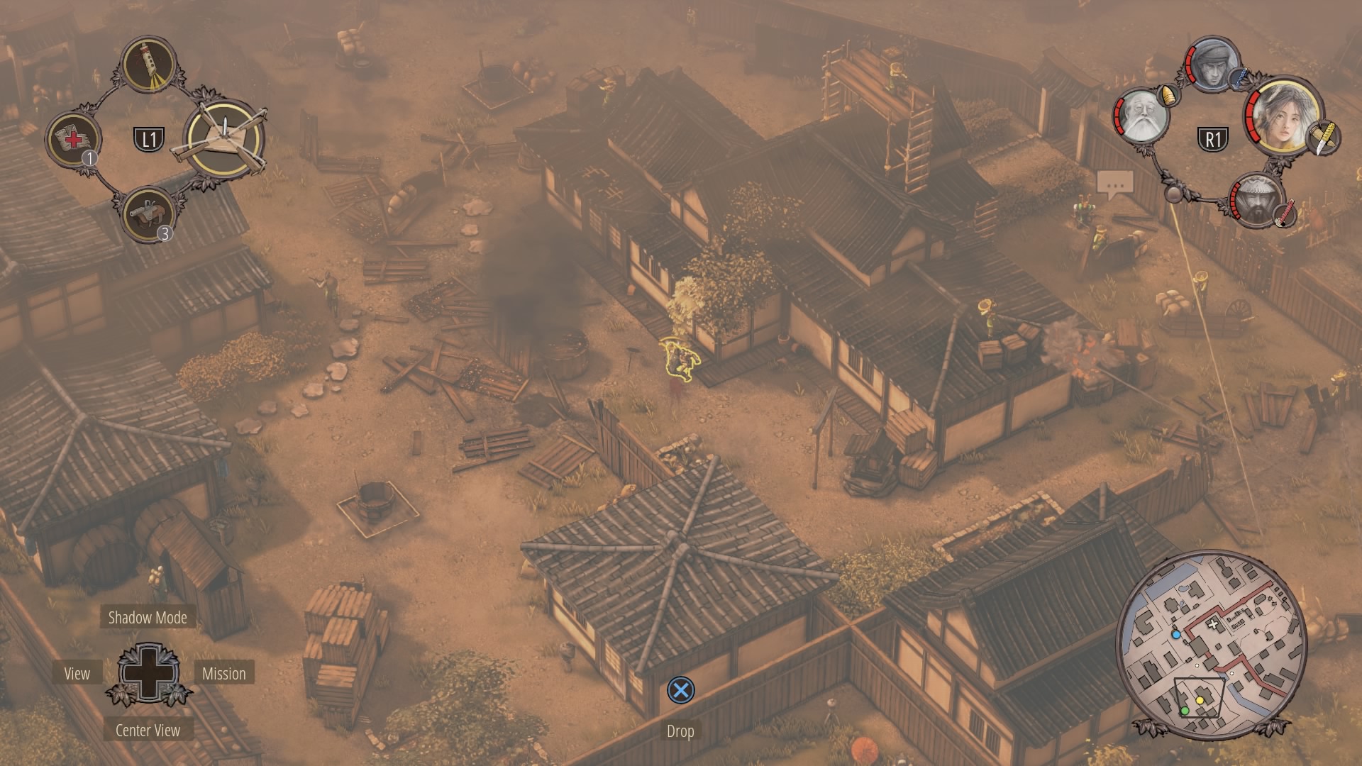 When the watchtower guard is gone, you can begin clearing the inner courtyard. Shadow Mode kill the two soldiers talking near the supply depot, then the patrolling samurai, and finally wipe out the soldiers at the prisoner pens. Use Mugen to kill the samurai on the walls.