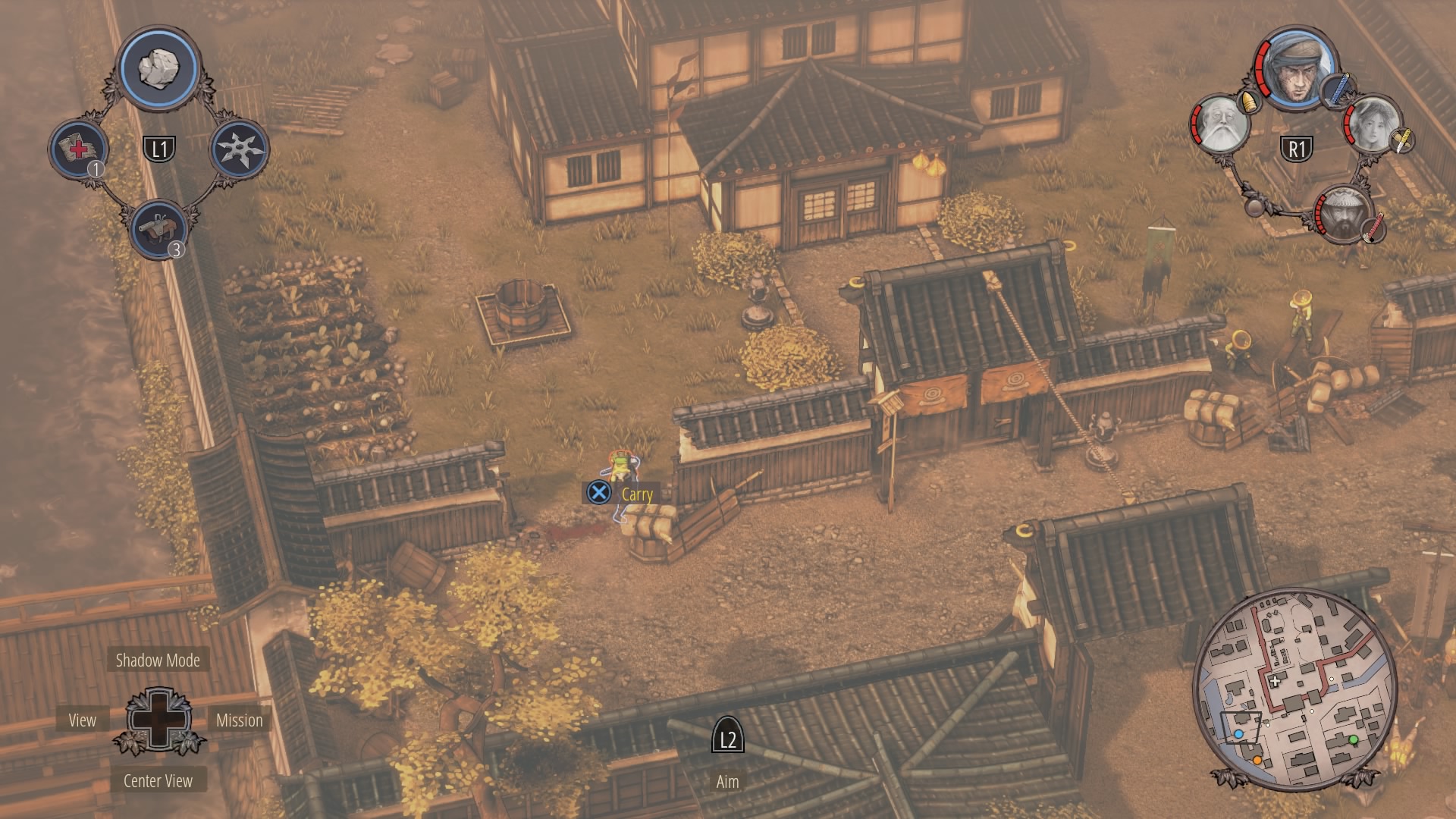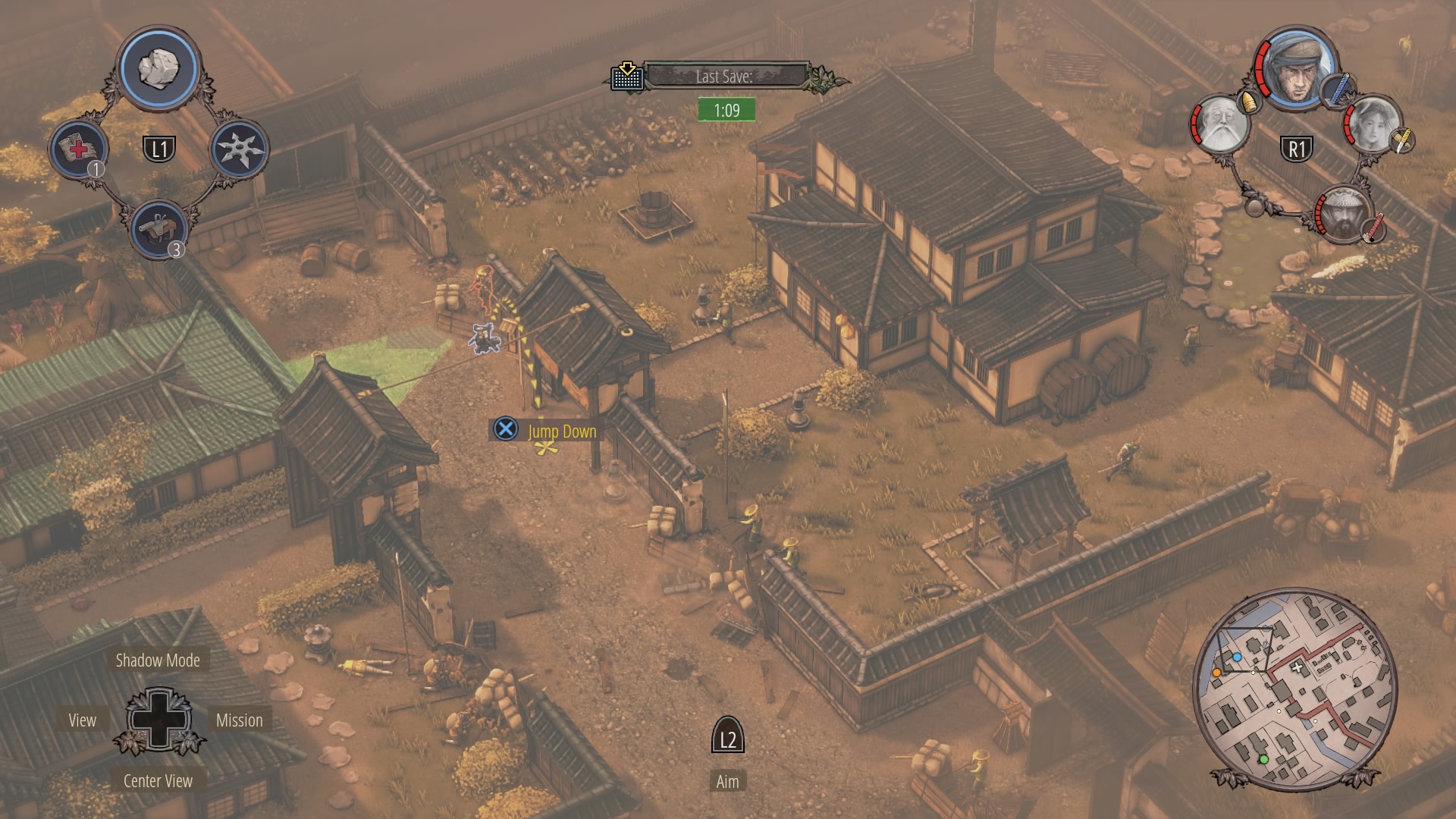 Kill and hide as many guards as you can – Hayato can reach the supply depot rooftop from the wall. Up here, use Shadow Mode to simultaneously kill the single Straw Hat at the base of the supply depot while Mugen kills the guard near the bush in the castle corner – watch out for the straw hat in the stone tower in the center of the inner castle.