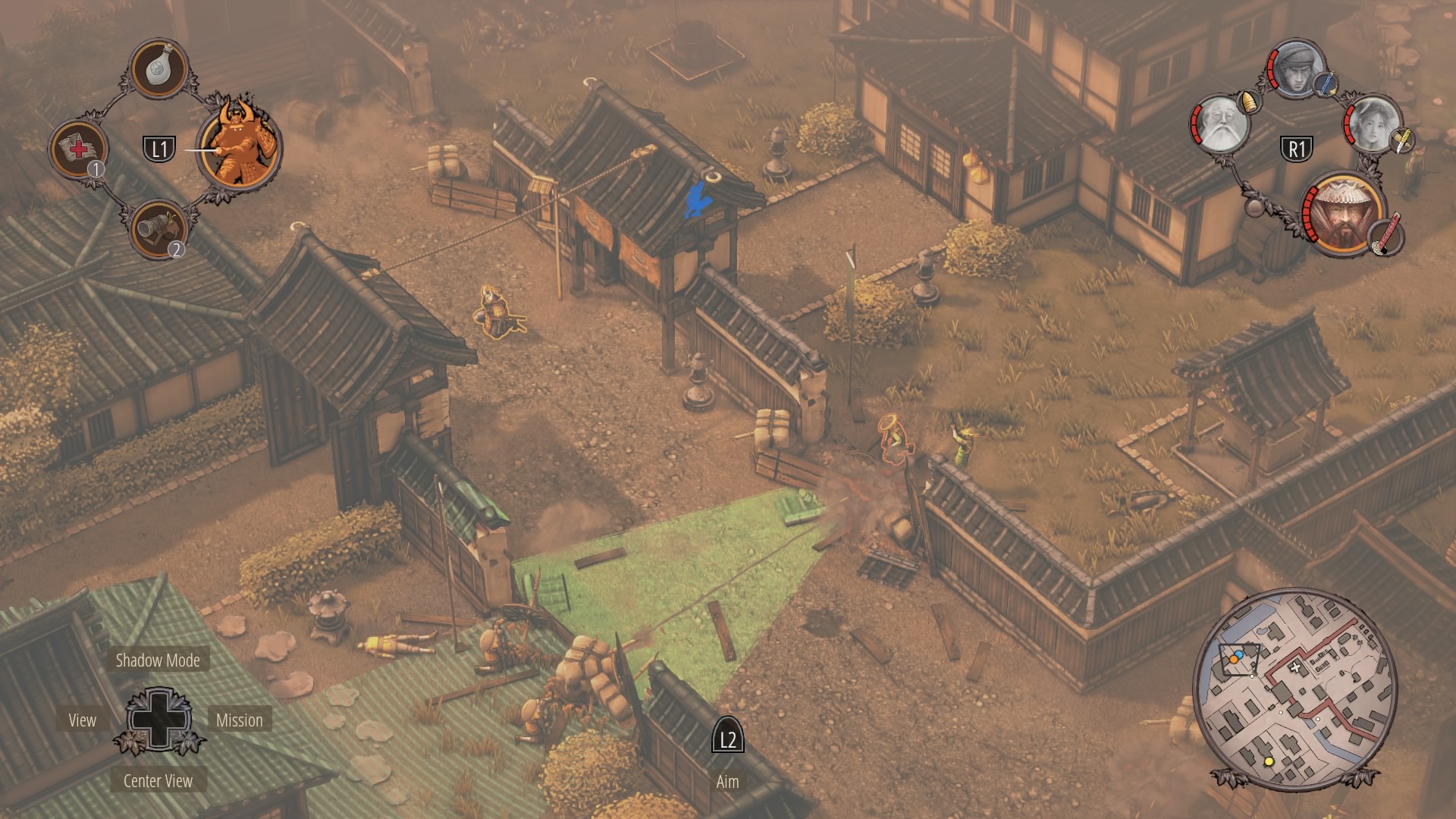 Starting with Hayato, climb onto the roof of the building where you start and reach the rope to sneak across the alley the Straw Hats are watching from their barricades. Drop into the bushes and kill the runner that splits time between a samurai and a straw hat at the end of the path. Kill the Straw Hat looking at the alley in the top corner after the samurai stops searching – now Mugen can cross the street and take care of that samurai.