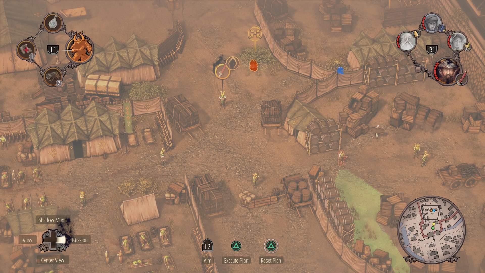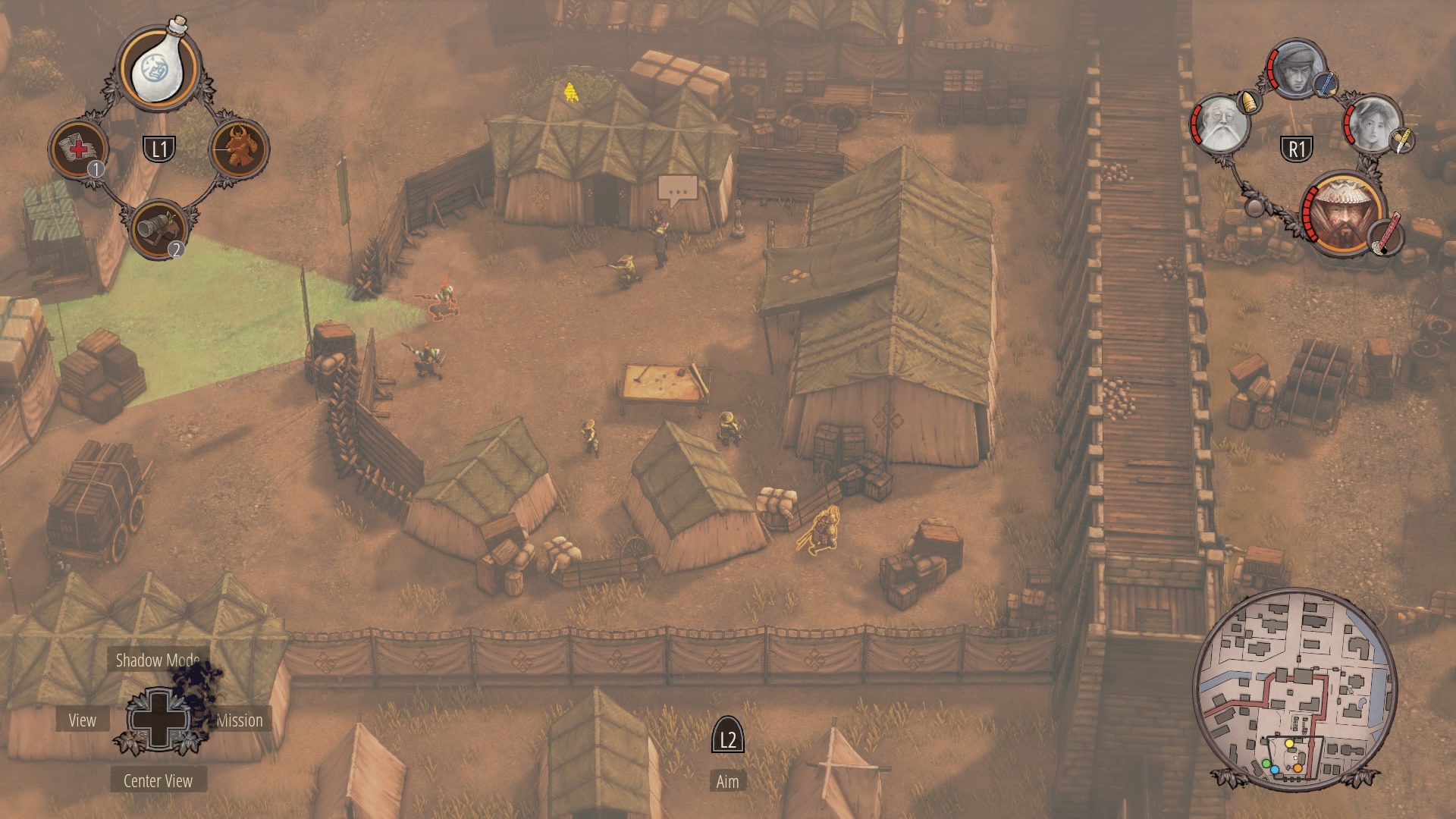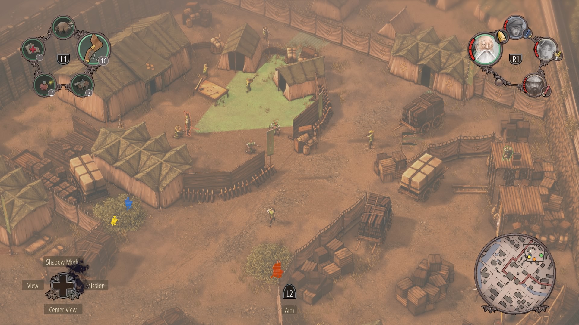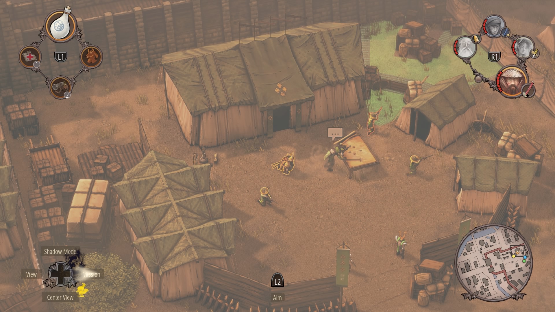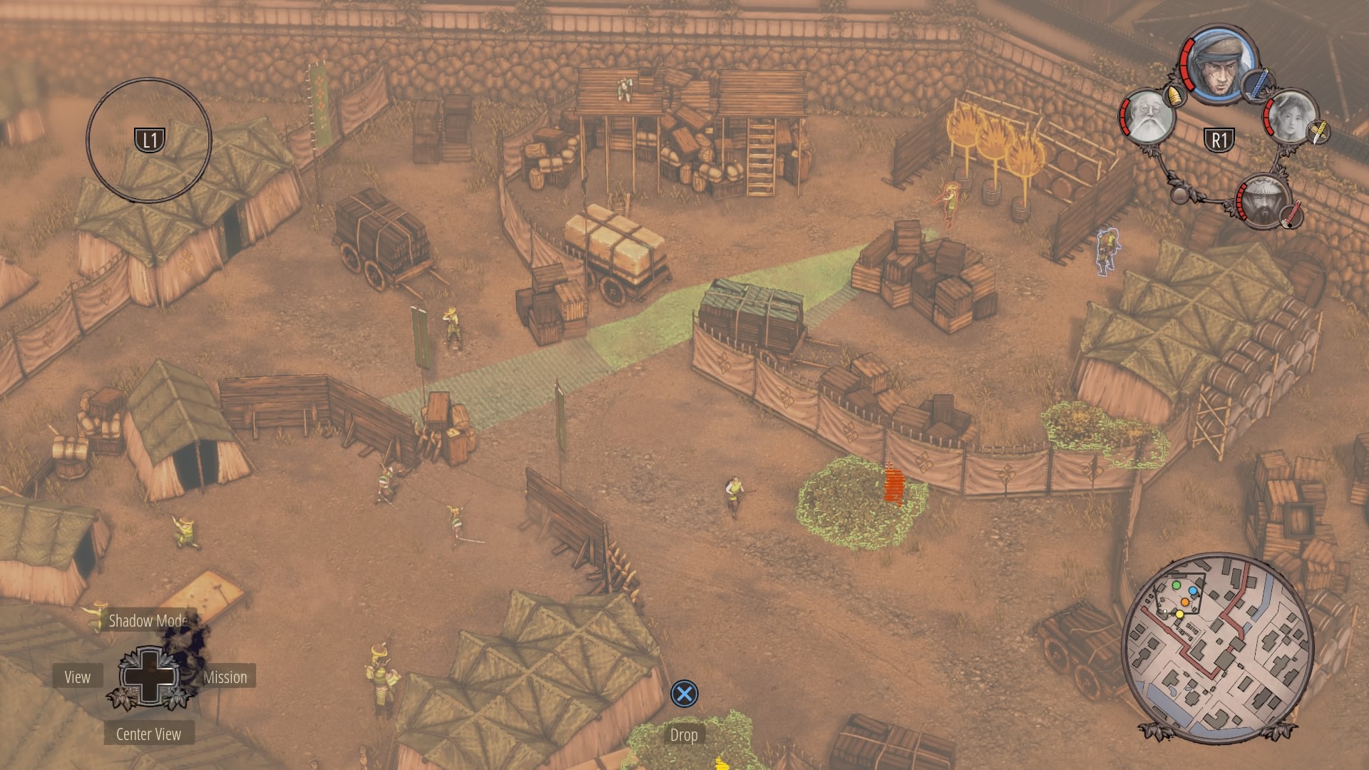 All four characters should now be together in the castle courtyard. Next, you’ll need to regroup with everyone in a bush near General Okkoto’s tent in the army camp. The ramp to the camp is blocked by a single Straw Hat. Wait for him to look away, then sprint into the bushes flanking the ramp — the bushes near the supply area. Ninjas can cut through the canvas walls.