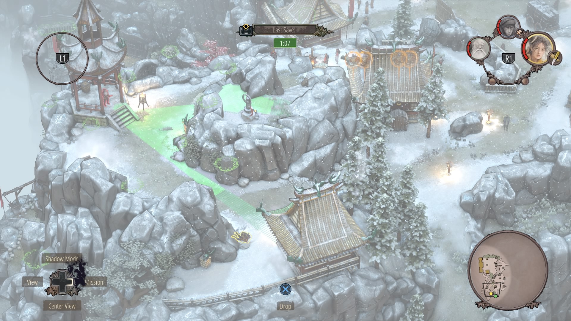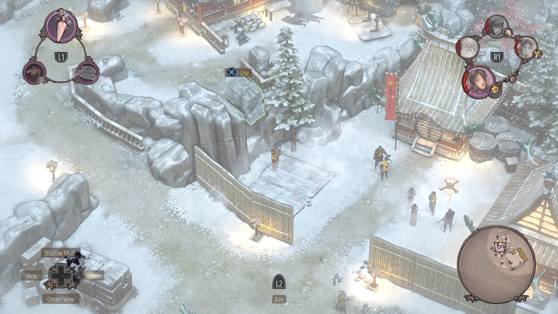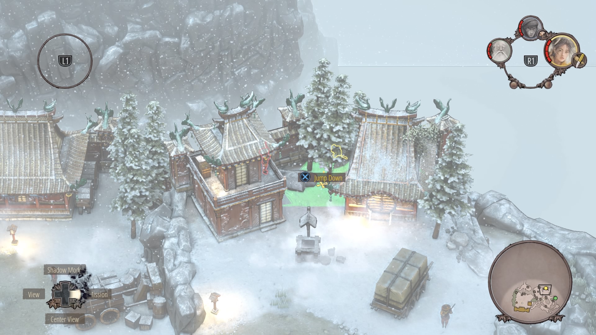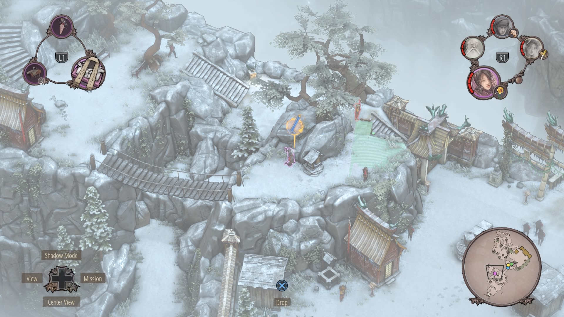 Clearing the Village: To save Aiko, you’ll need to enter the peak village. It’s well-guarded, but there is a way through – on the ramp from the bridge (with the eagle statue) there’s a ledge Yuki / Hayato can jump down to, allowing them to get behind the first Straw Hat watching guard at the village entrance path.