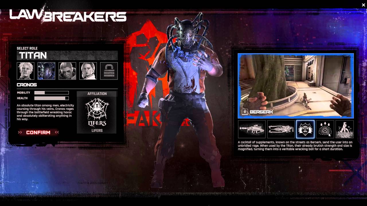 The roster for the Titan class is Cronos and Bomchelle. Cronos is the Breaker character who was able to withstand the electric chair which ran 2,000 volts of electricity through his body. Now he won’t let the Law stop him as he reigns terror.