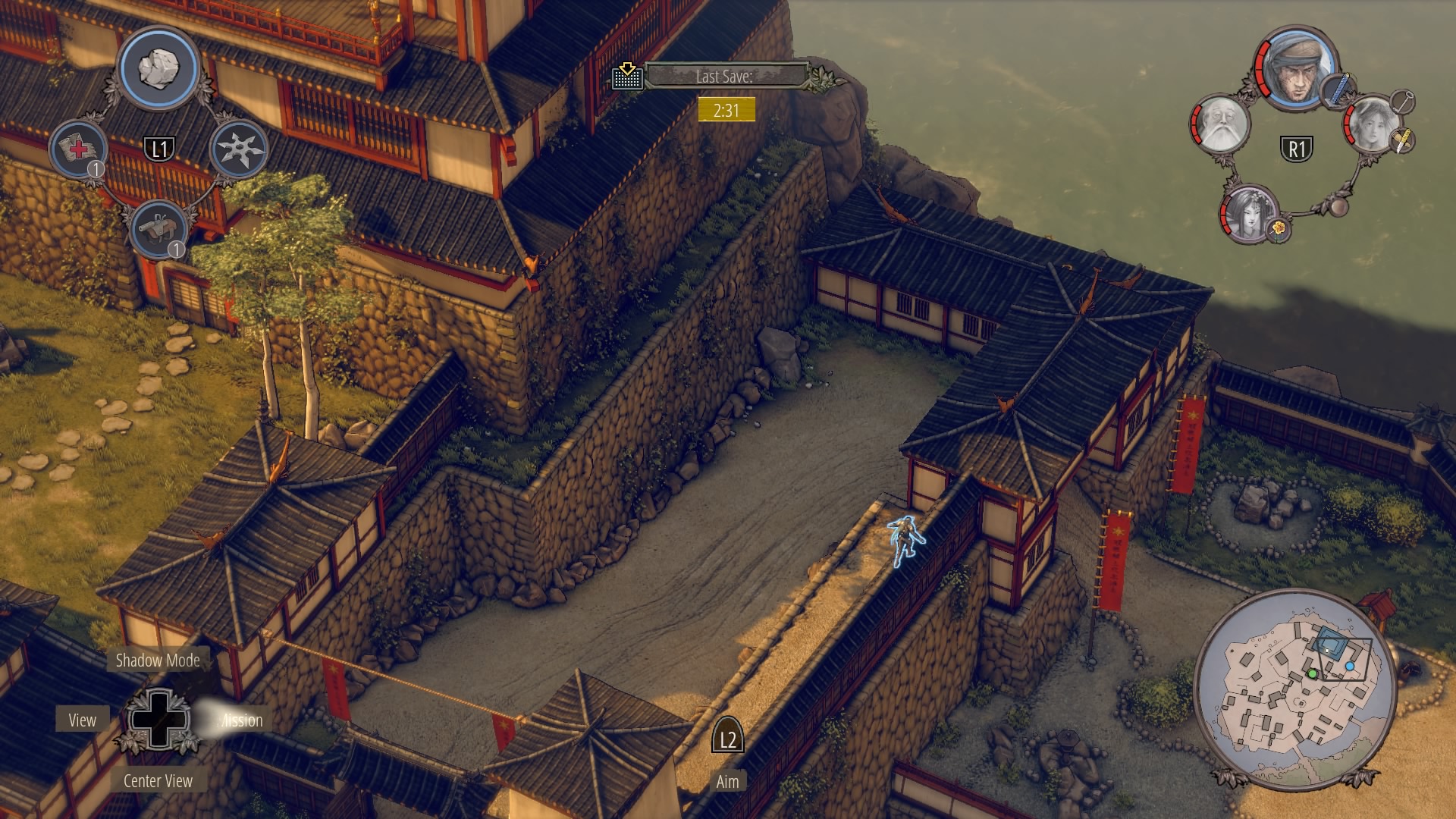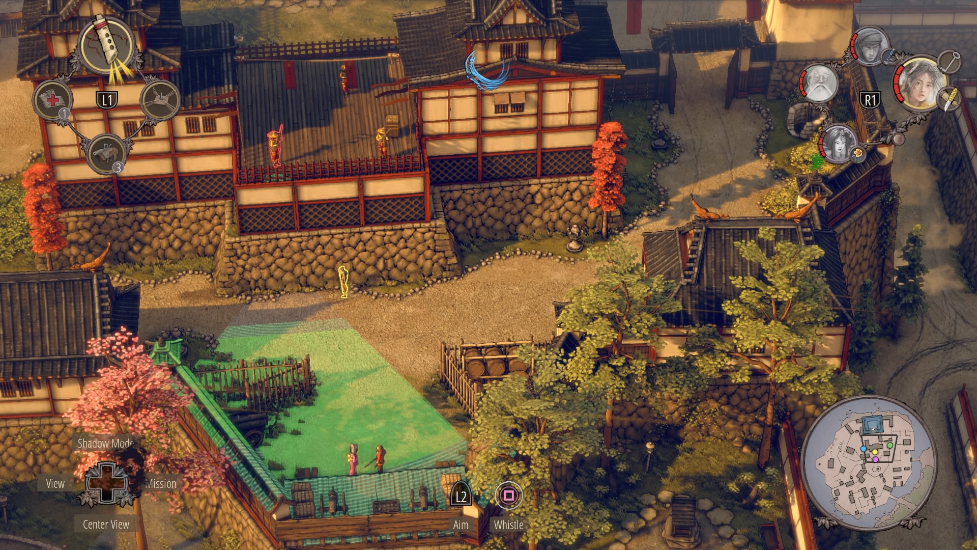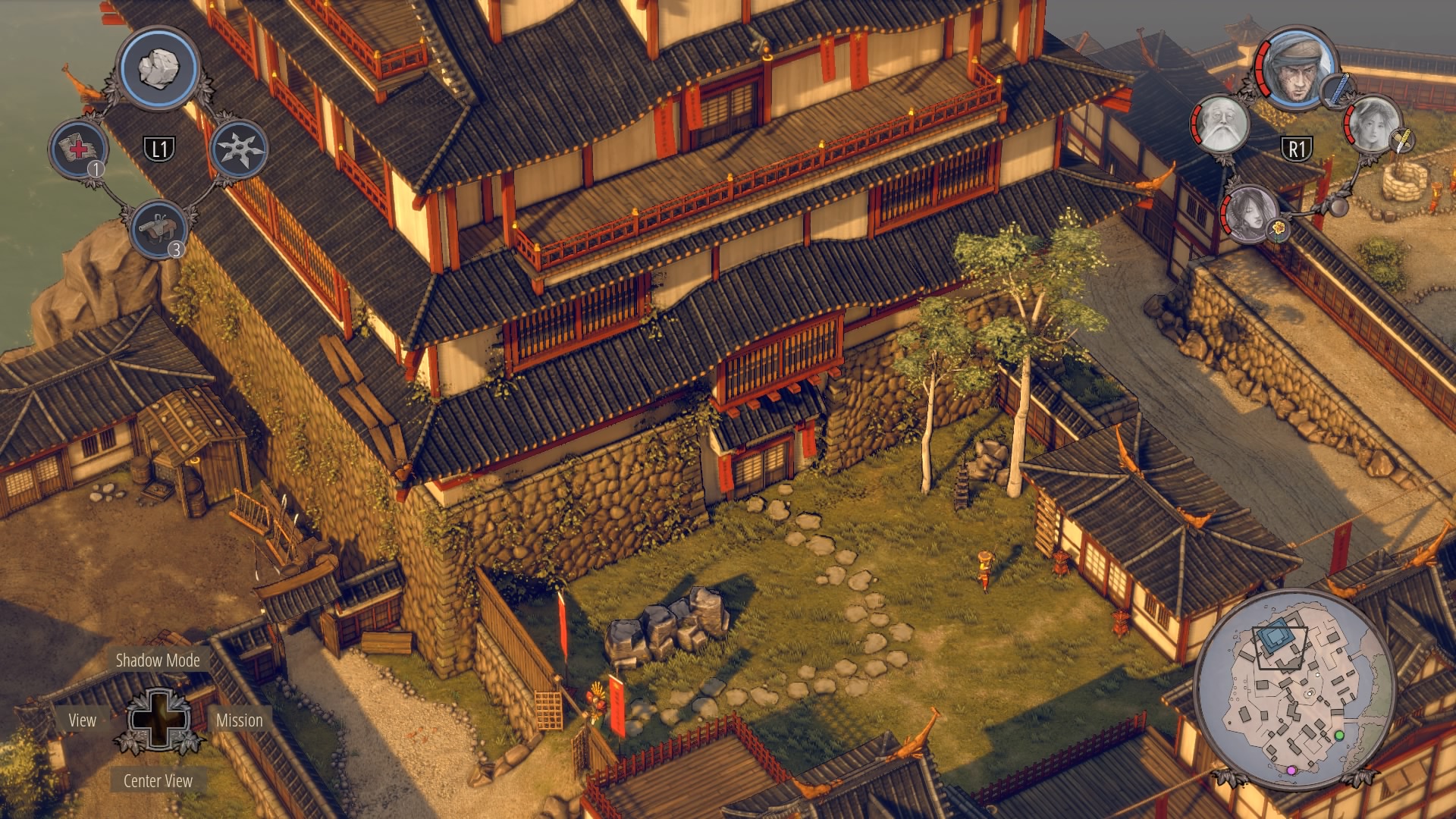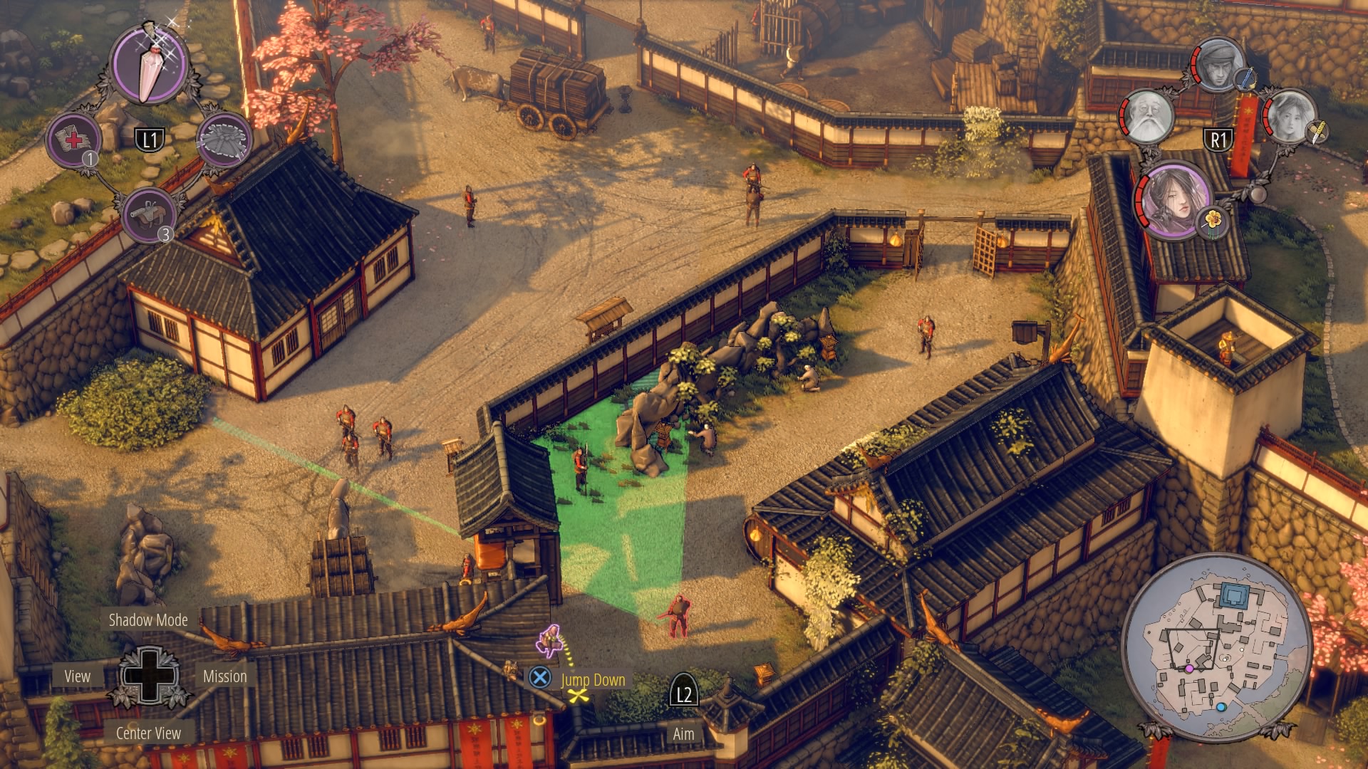 Through the Small Garden: From the top of the large gate house, there’s a garden where several civilians are tending small trees on the rocks. Hop down from the gate and climb onto the rooftop to reach the open north gate. Use sneezing powder to make this area easier to stealth through – powder the guard watching the vines as you climb with Yuki / Aiko.