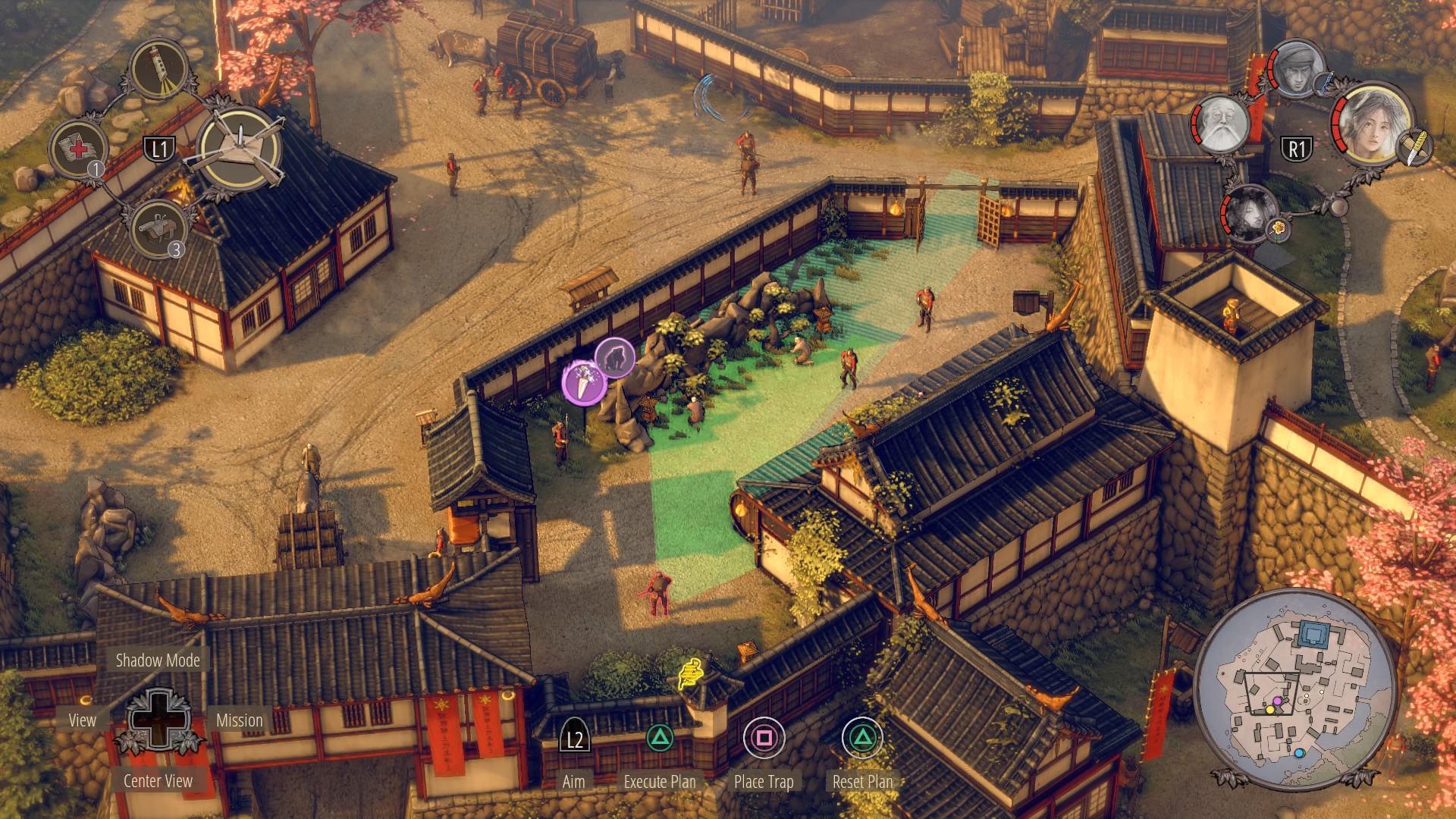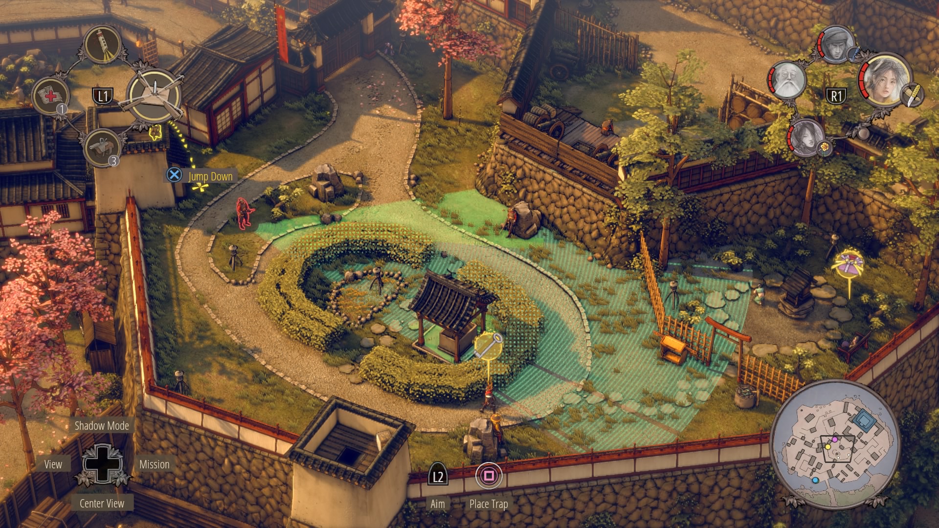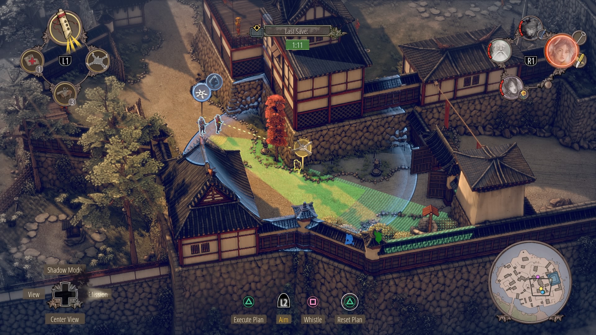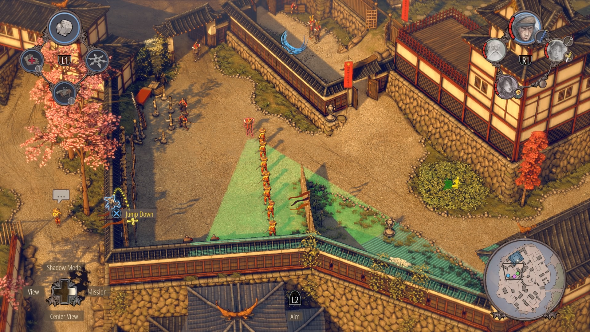 Through the Small Garden: From the top of the large gate house, there’s a garden where several civilians are tending small trees on the rocks. Hop down from the gate and climb onto the rooftop to reach the open north gate. Use sneezing powder to make this area easier to stealth through – powder the guard watching the vines as you climb with Yuki / Aiko.