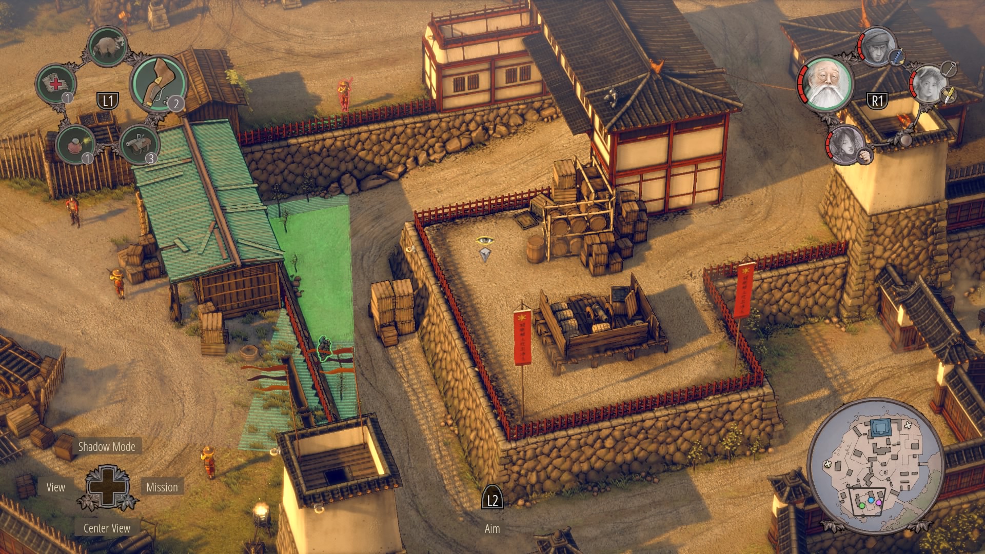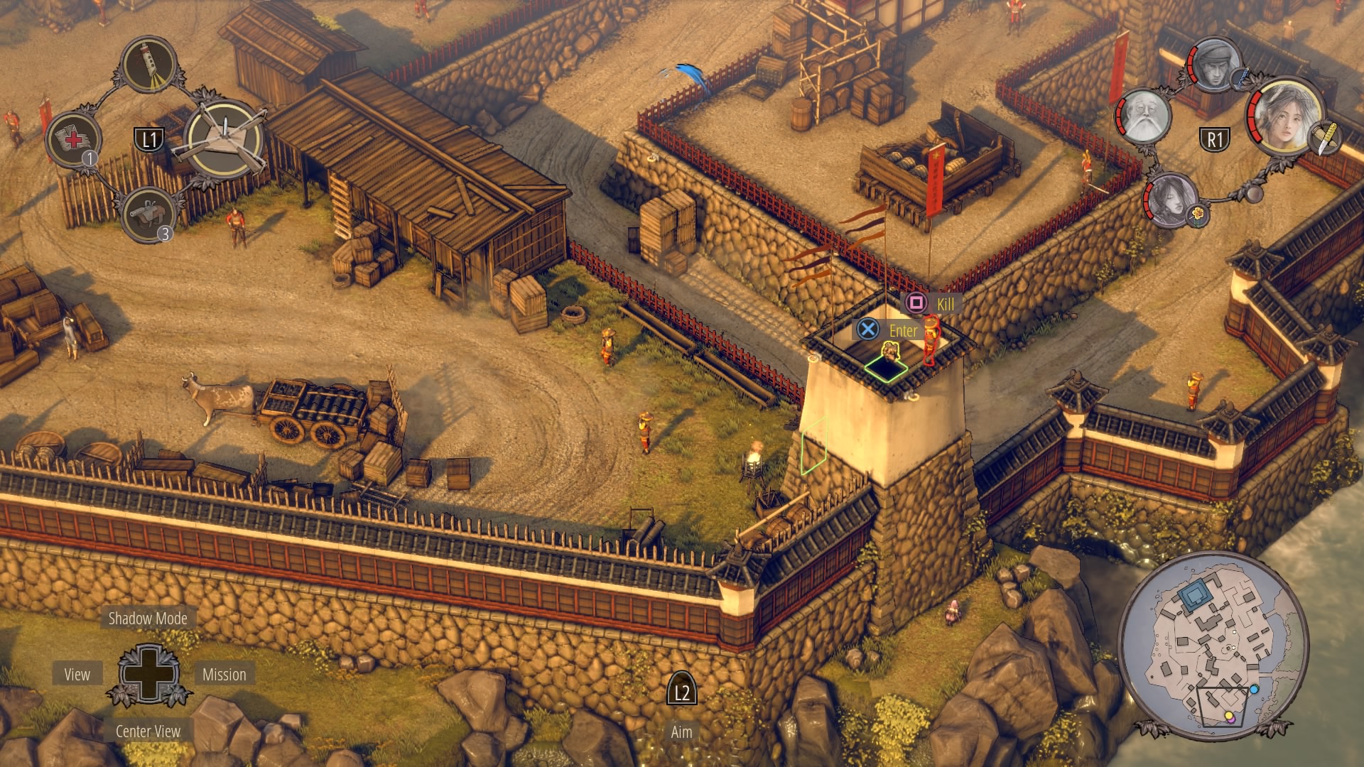 To kill the two samurai – use Aiko to stab the Straw Hat watching the main causeway gatehouse, then shoot / stab the samurai standing still. You’ll need to use sneezing powder on the Straw Hat in the causeway to block his vision. Then you can precisely time the patrolling samurai near the crates in the upper-left corner of his patrol, when the two patrolling guards aren’t looking toward the causeway.