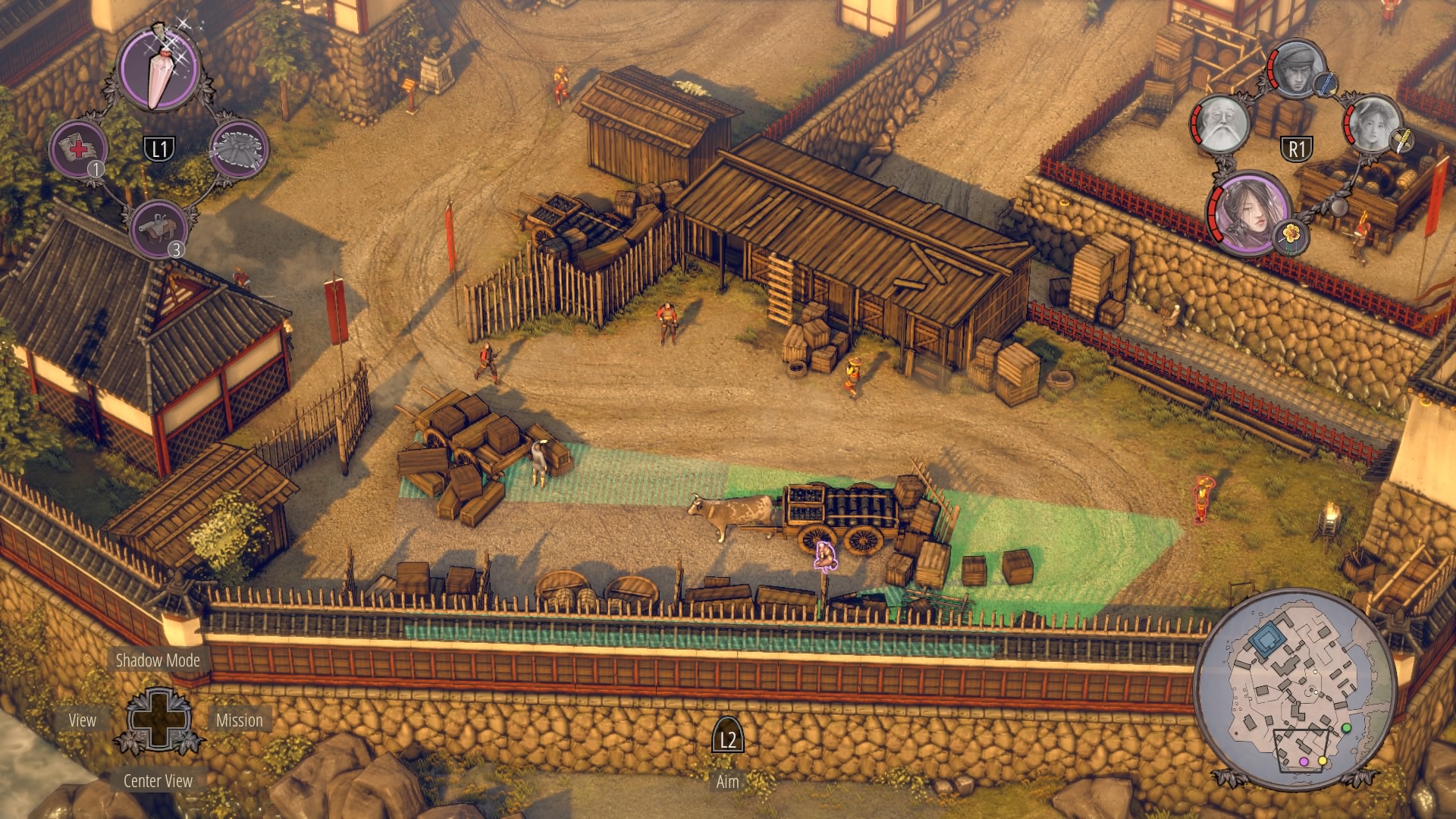 The Storage Area: The storage area with the ox-drawn cart is your first obstacle. The guards here have good coverage – there’s no one you can kill from the tower using stealth. Time your run right, and you can slip by the standing straw hat near the tower – use sneezing powder to reach the cart. From the cart, continue left to the vines to climb over the wall and leave the storage area.