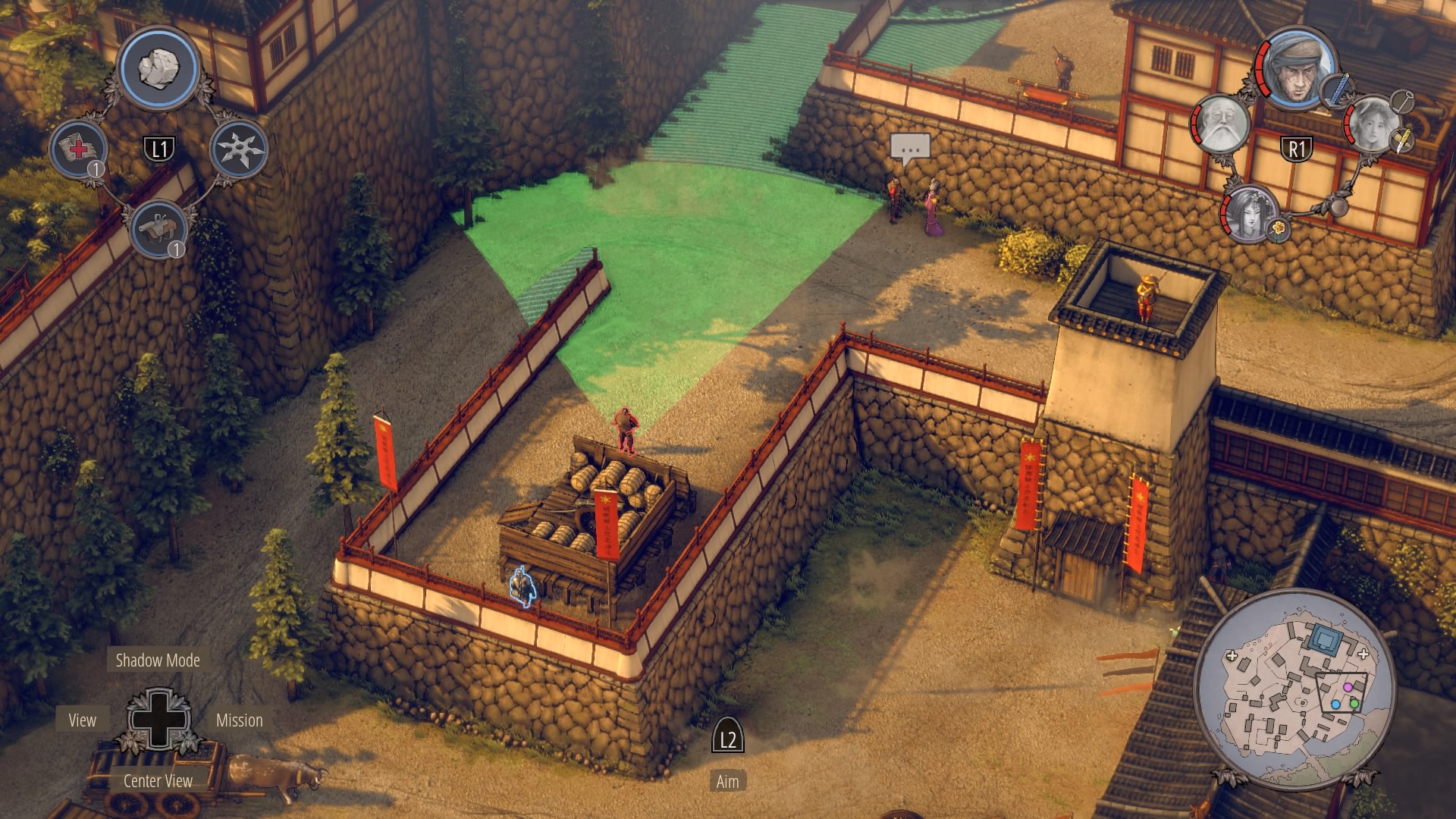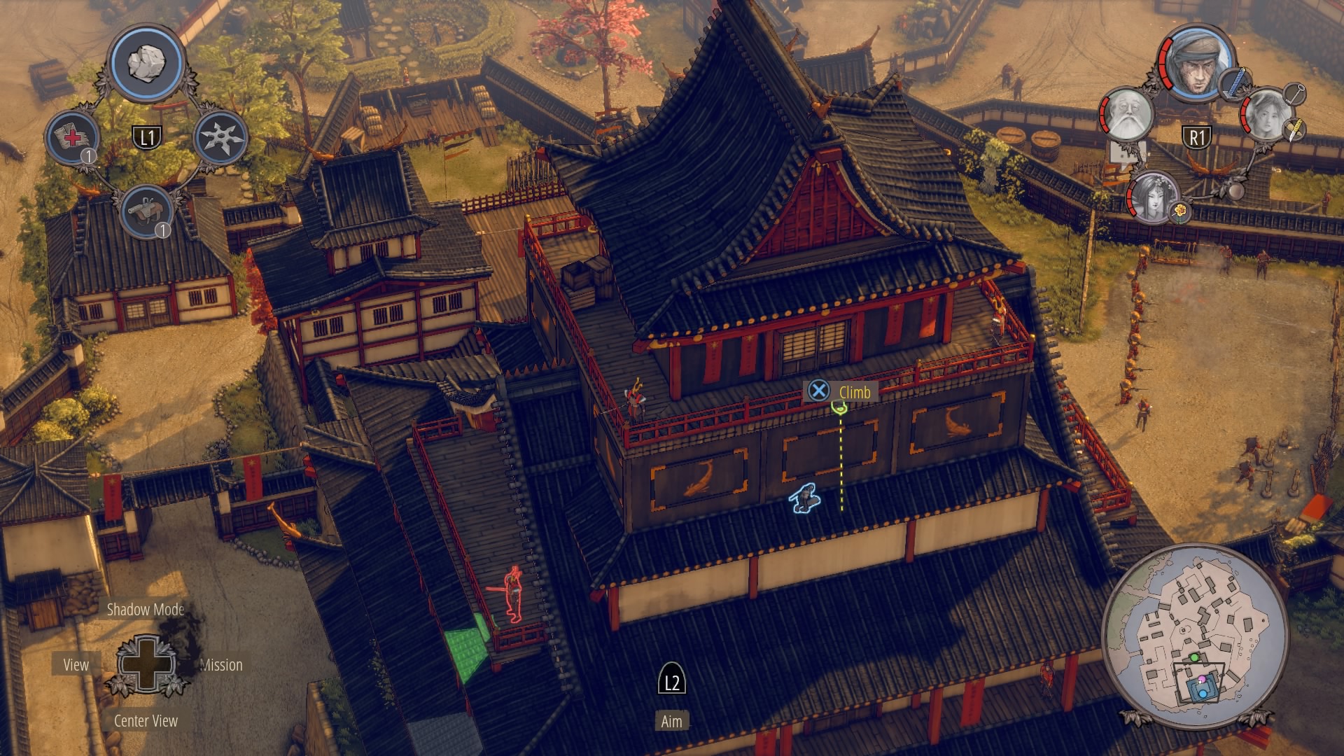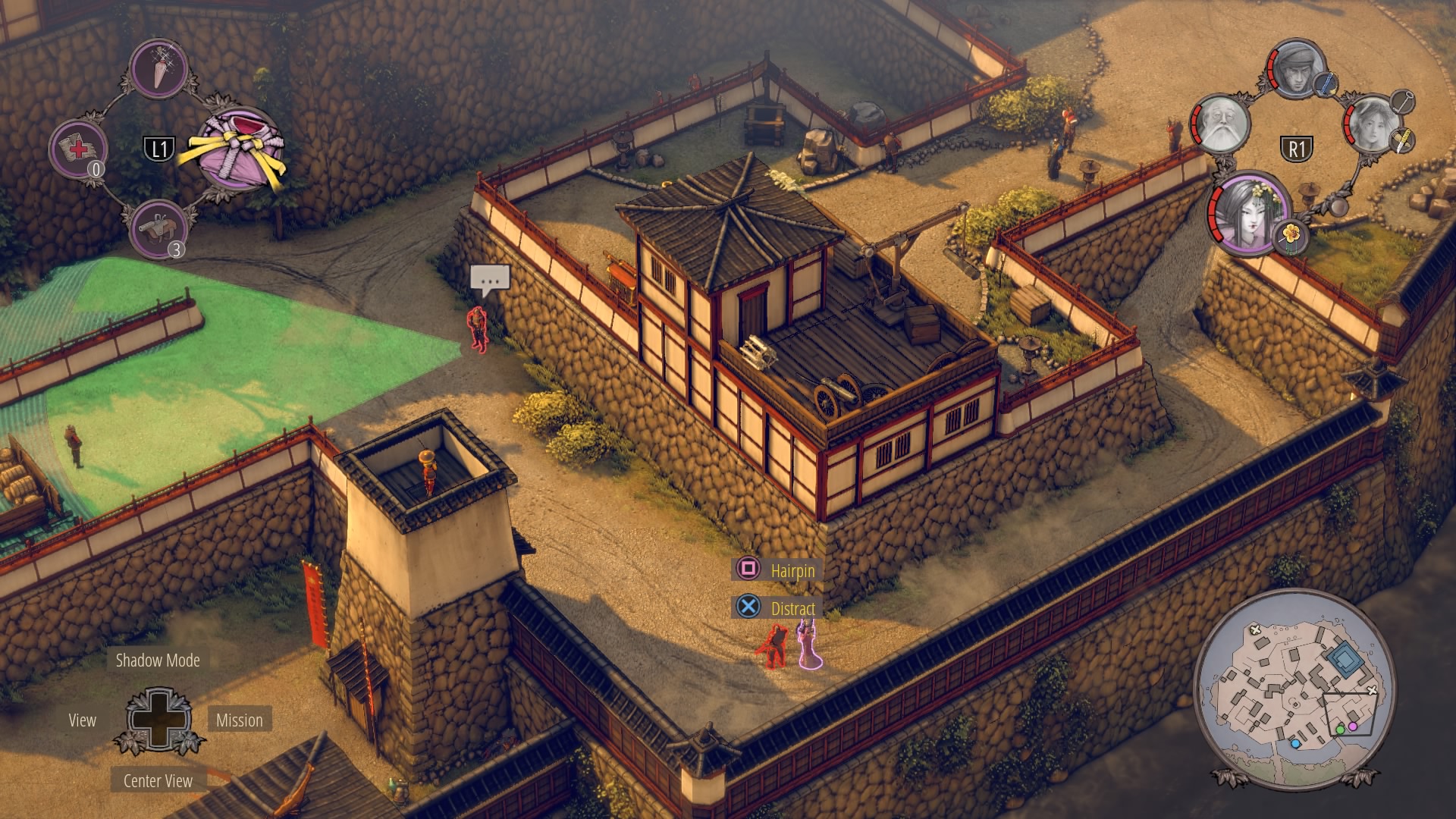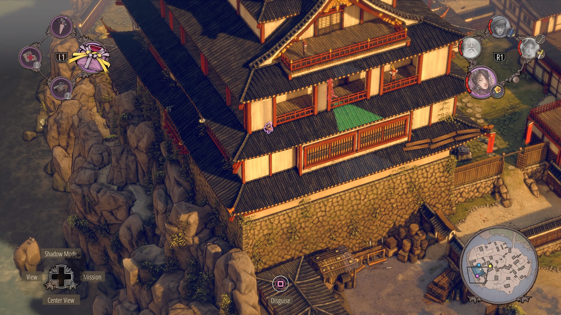 Infiltrating Noboru’s Keep: To begin climbing up the keep, you’ll need to cross through the courtyard at the base of the pagoda. Enter with Aiko in disguise – there are no samurai here – and kill the one patrolling Straw Hat while the lower guards are distracted. Once he’s gone, you can double-kill the guards staring at each other with Shadow Mode. When they’re down, get the Straw Hats so Takuma can get the ammo crate at their position.