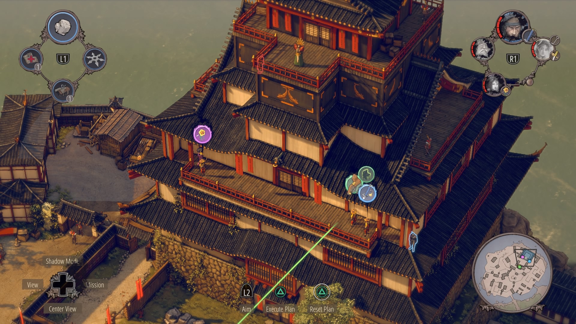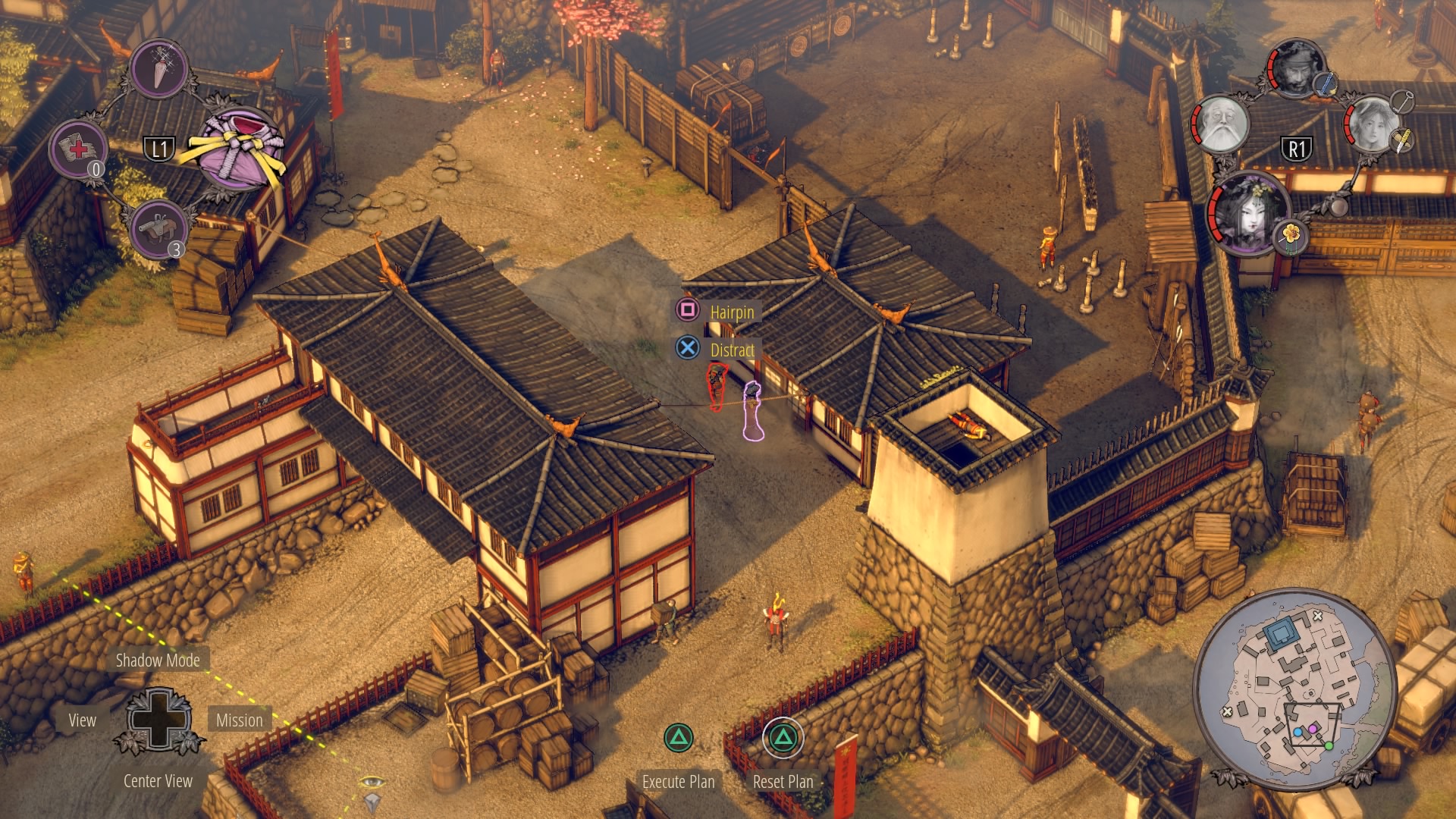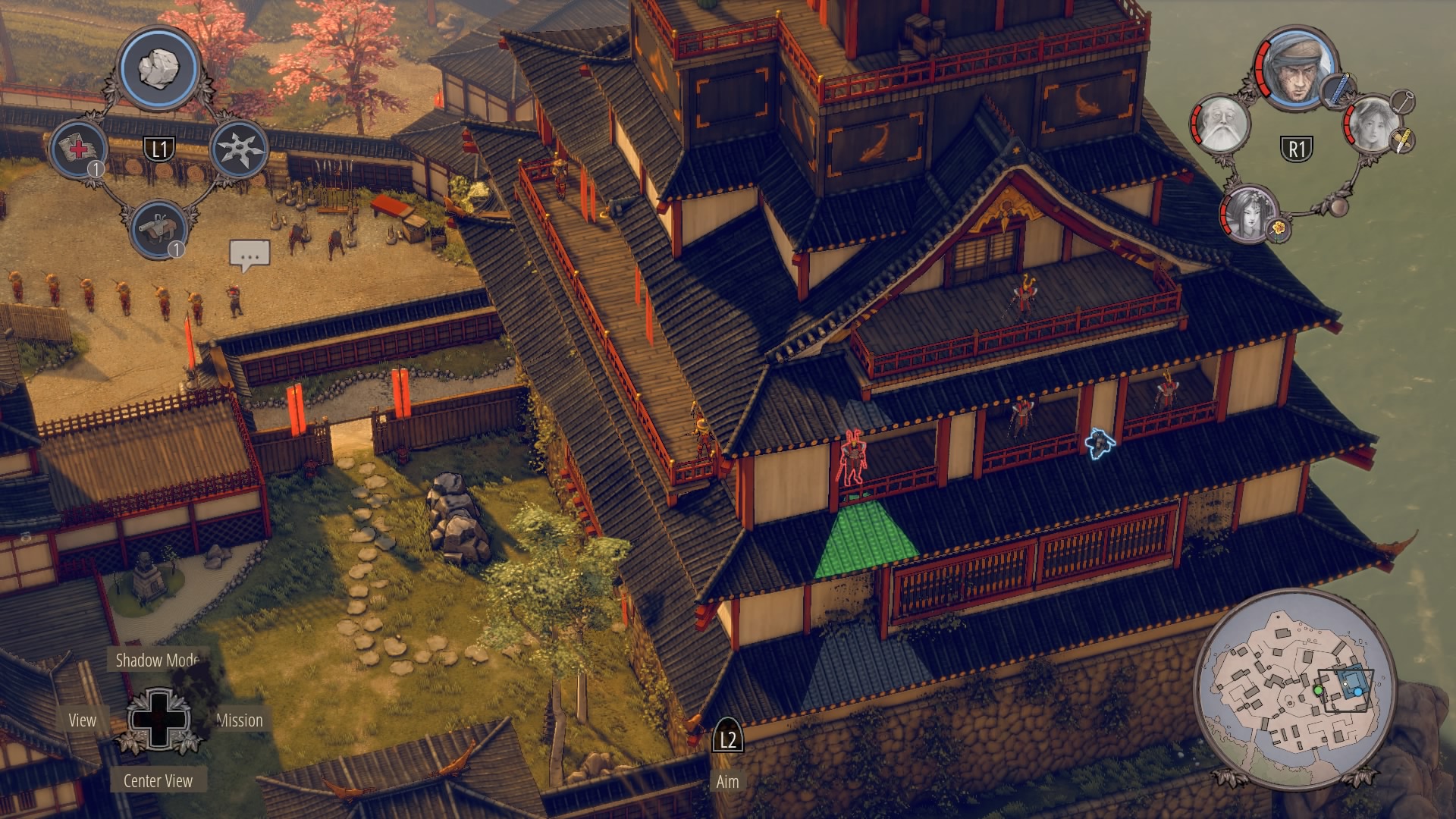 Infiltrating Noboru’s Keep: To begin climbing up the keep, you’ll need to cross through the courtyard at the base of the pagoda. Enter with Aiko in disguise – there are no samurai here – and kill the one patrolling Straw Hat while the lower guards are distracted. Once he’s gone, you can double-kill the guards staring at each other with Shadow Mode. When they’re down, get the Straw Hats so Takuma can get the ammo crate at their position.