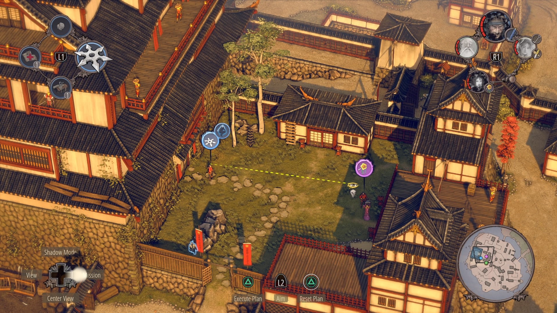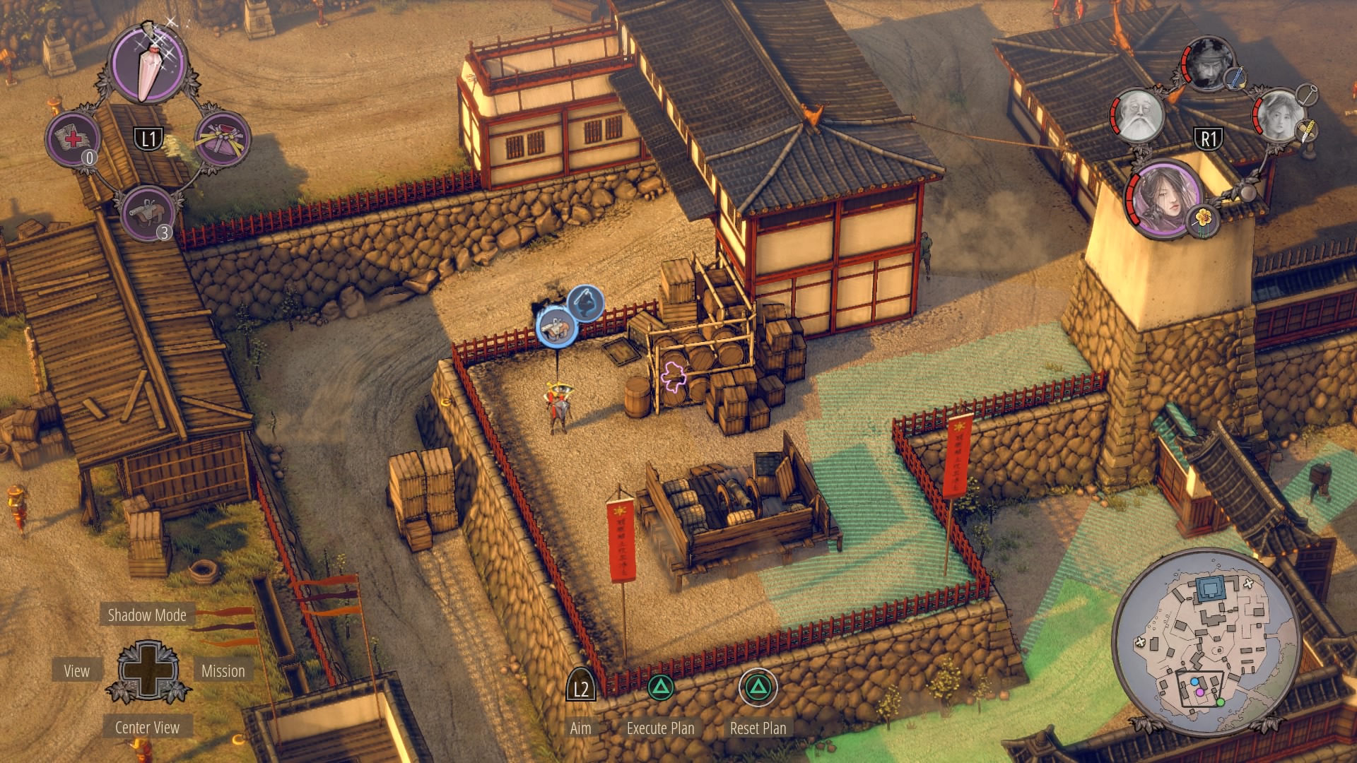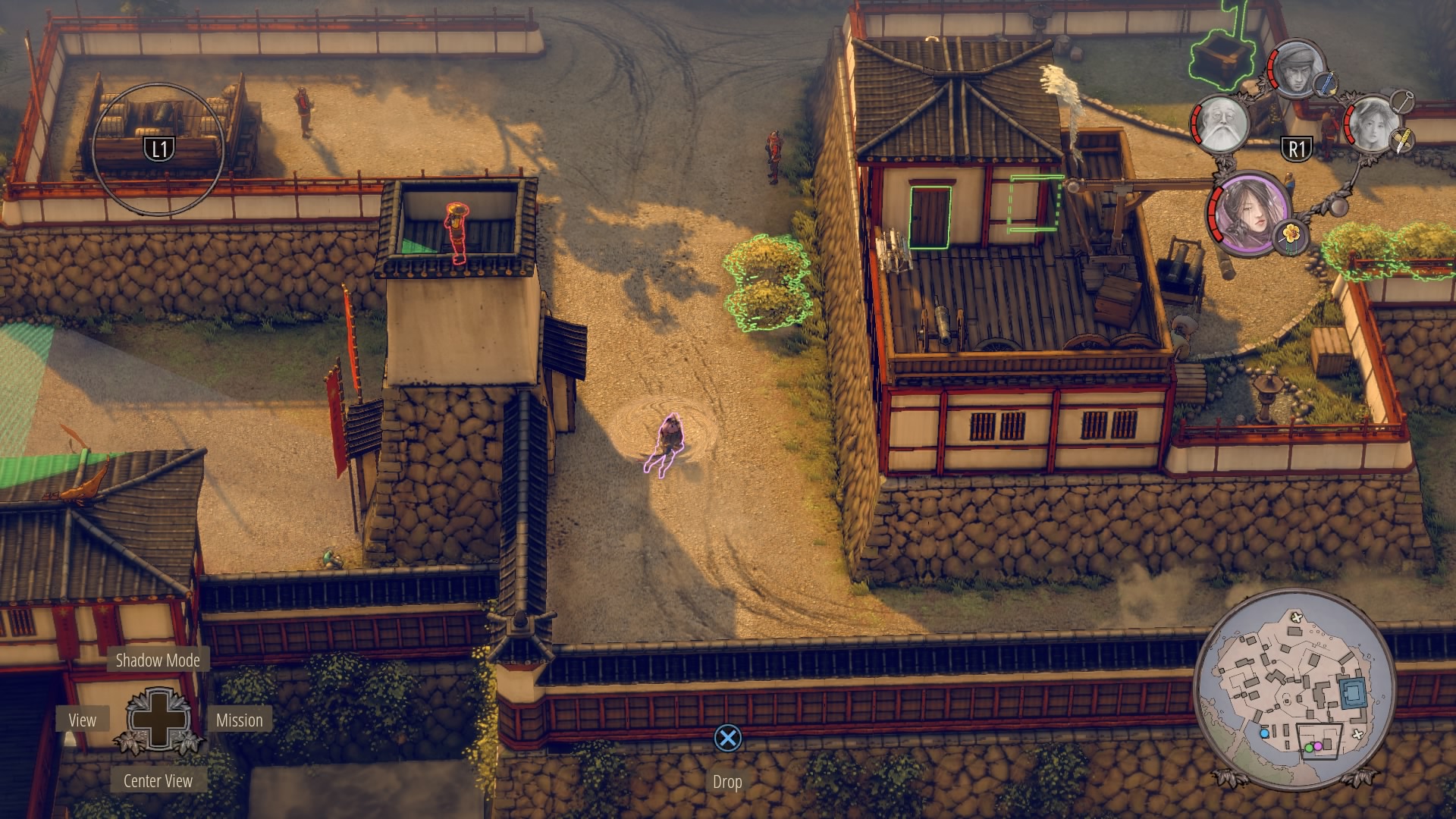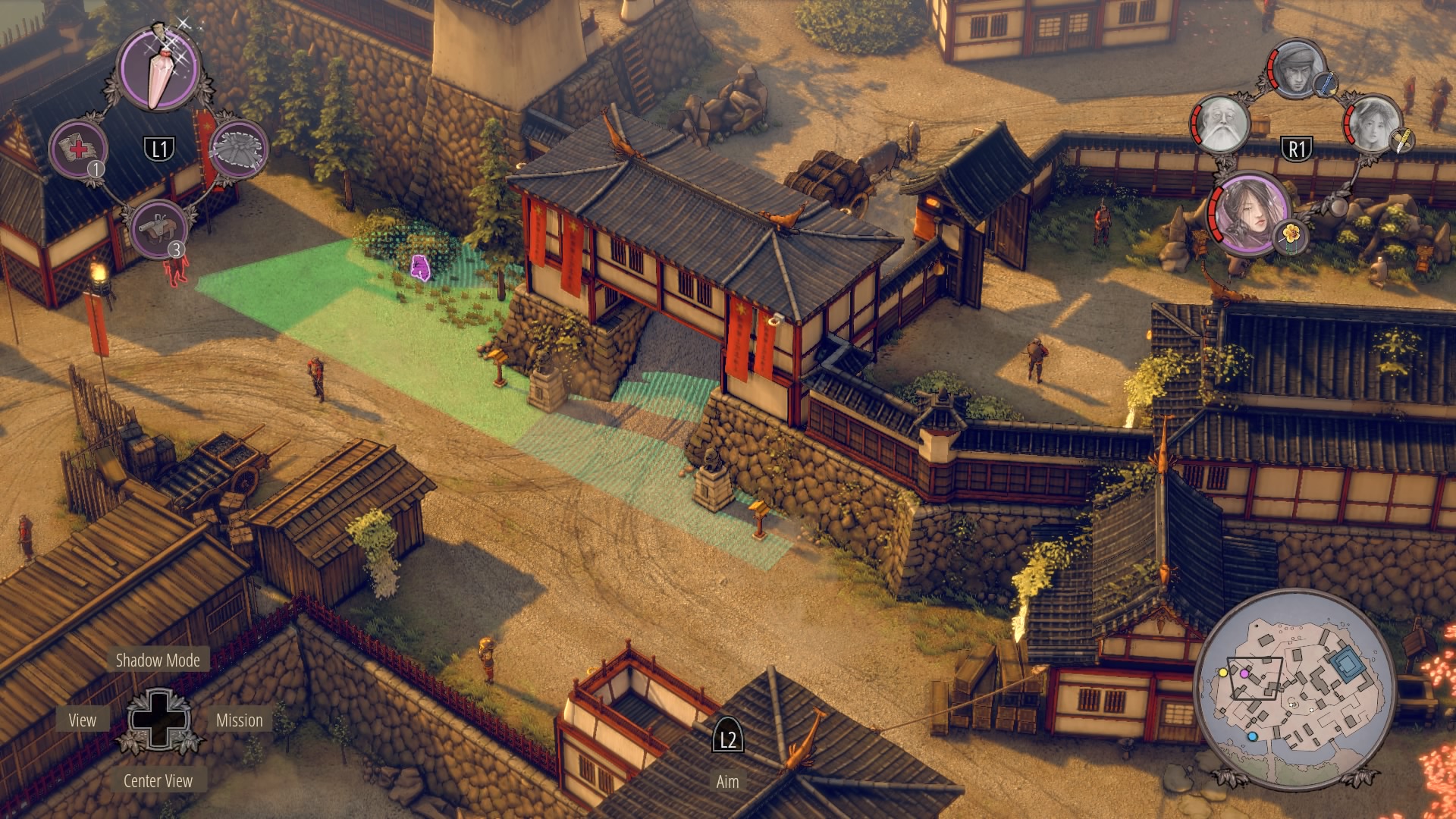 Infiltrating Noboru’s Keep: To begin climbing up the keep, you’ll need to cross through the courtyard at the base of the pagoda. Enter with Aiko in disguise – there are no samurai here – and kill the one patrolling Straw Hat while the lower guards are distracted. Once he’s gone, you can double-kill the guards staring at each other with Shadow Mode. When they’re down, get the Straw Hats so Takuma can get the ammo crate at their position.