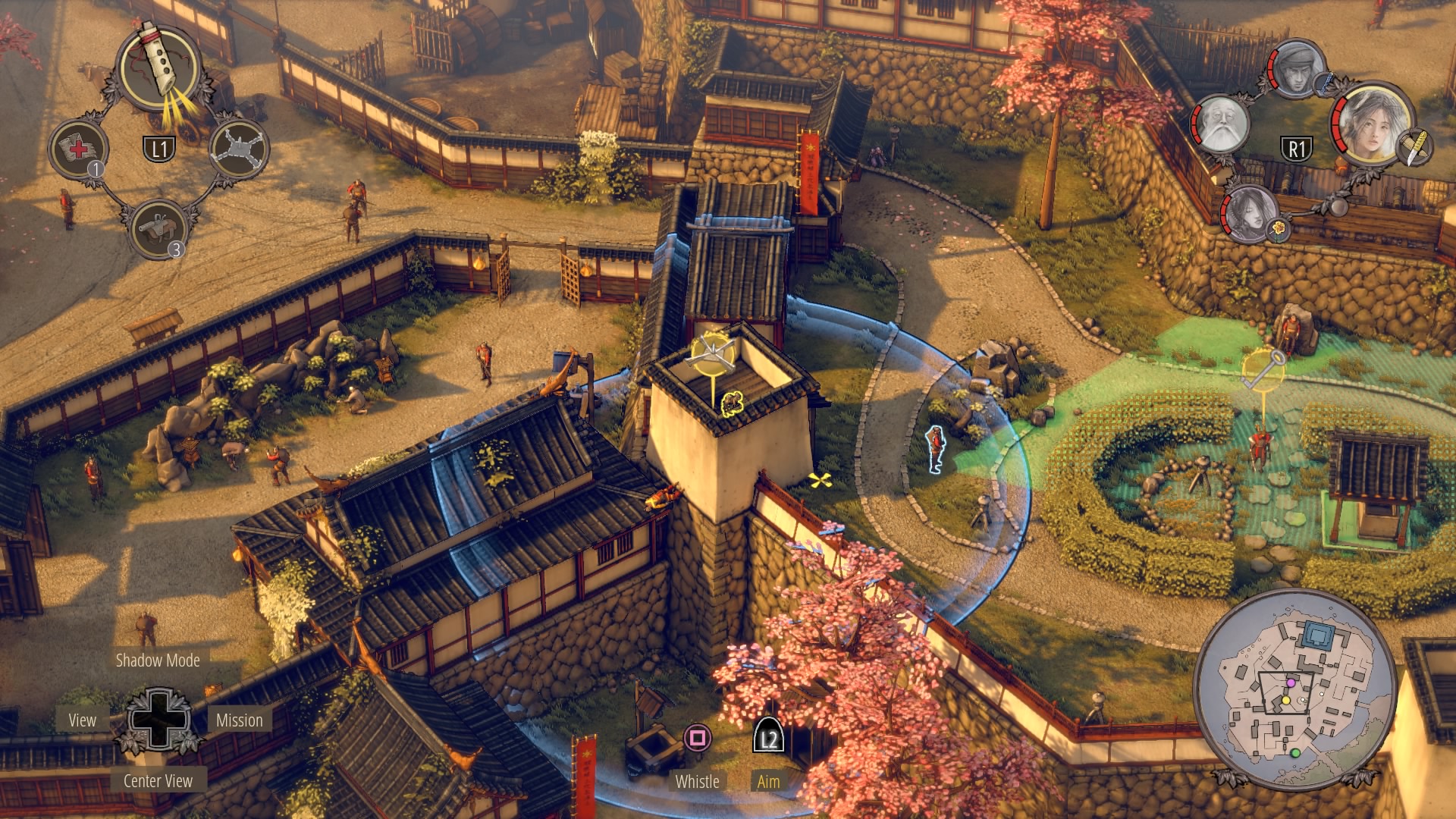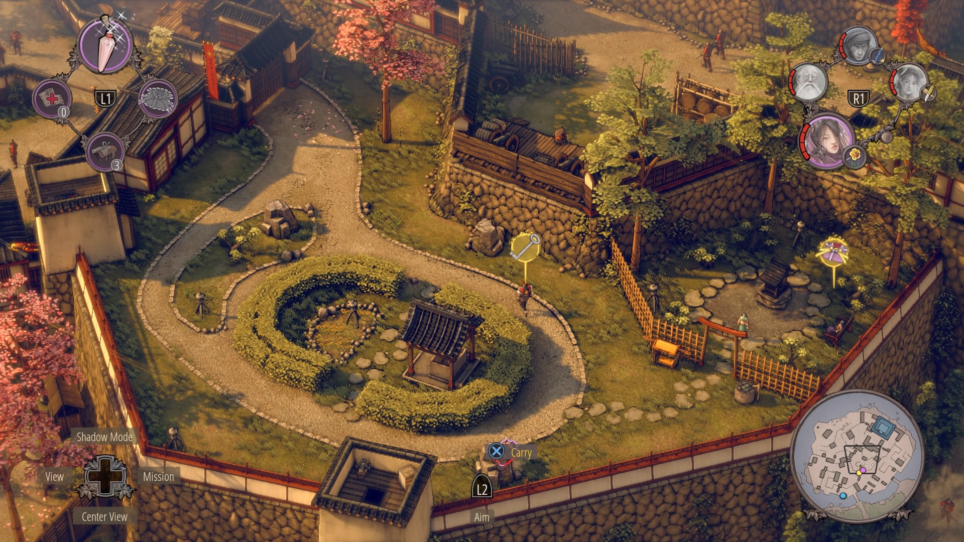 Getting the Key: There are four soldiers in the garden, and one samurai patrolling with the key. Two soldiers are standing near the towers – lure the first to the roof with a whistle and a trap to get rid of him. The other two are sitting – one faces the inner garden, the straw hat watches the civilian in the disguise Aiko needs. Use sneezing powder on the guard sitting on the rock to block his vision until the guard falls. Repeat this trick at the second tower to get rid of the next standing guard.