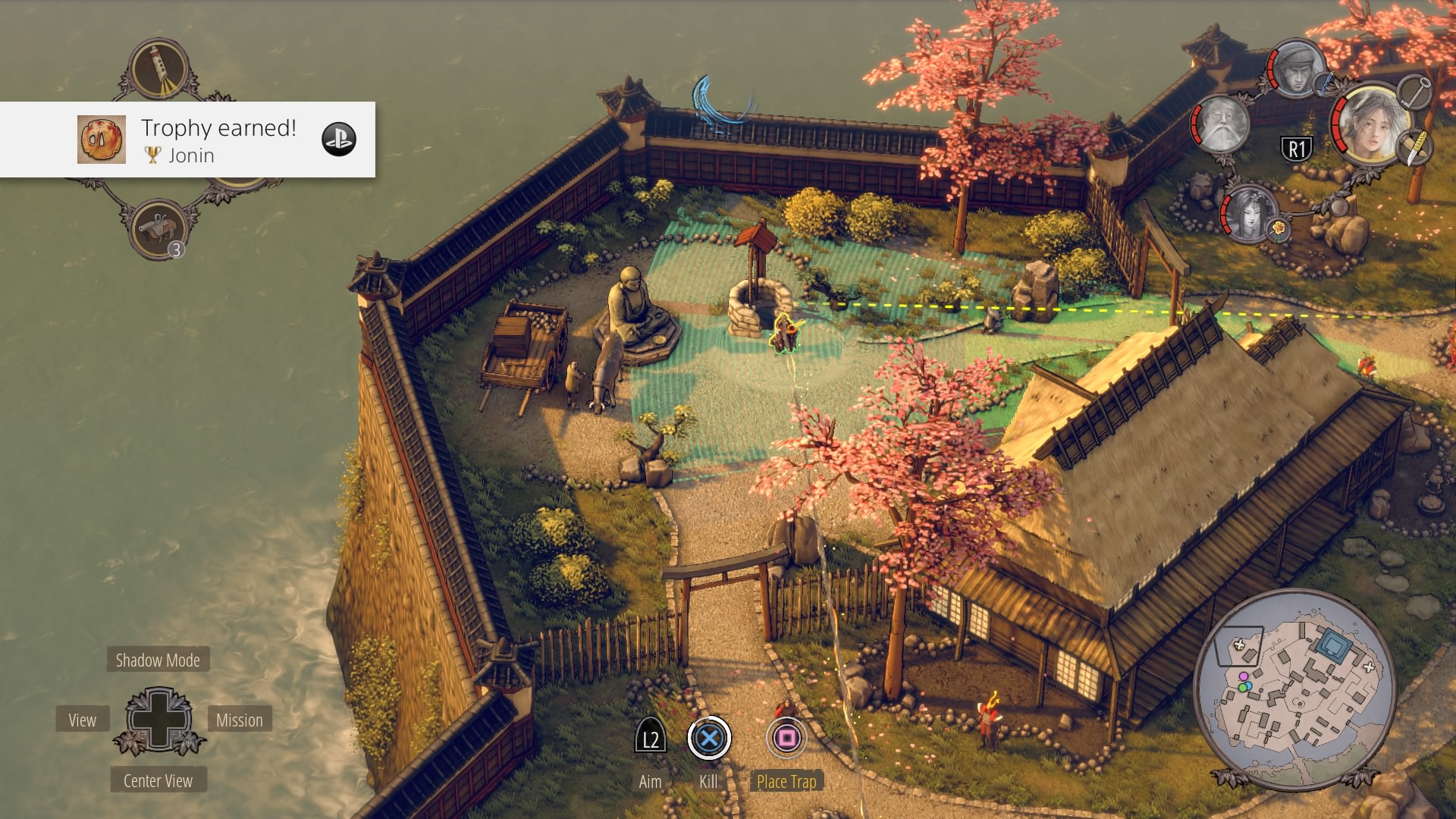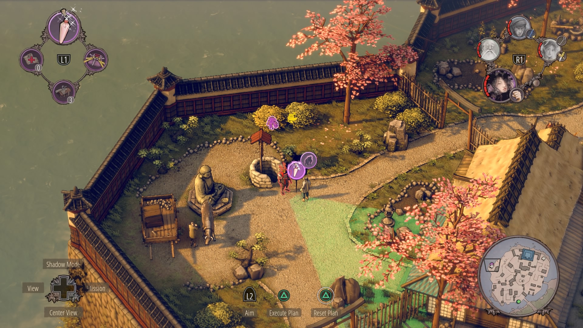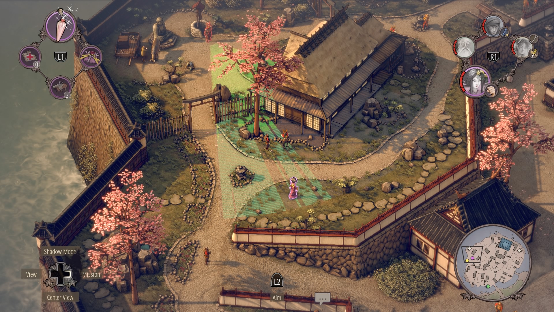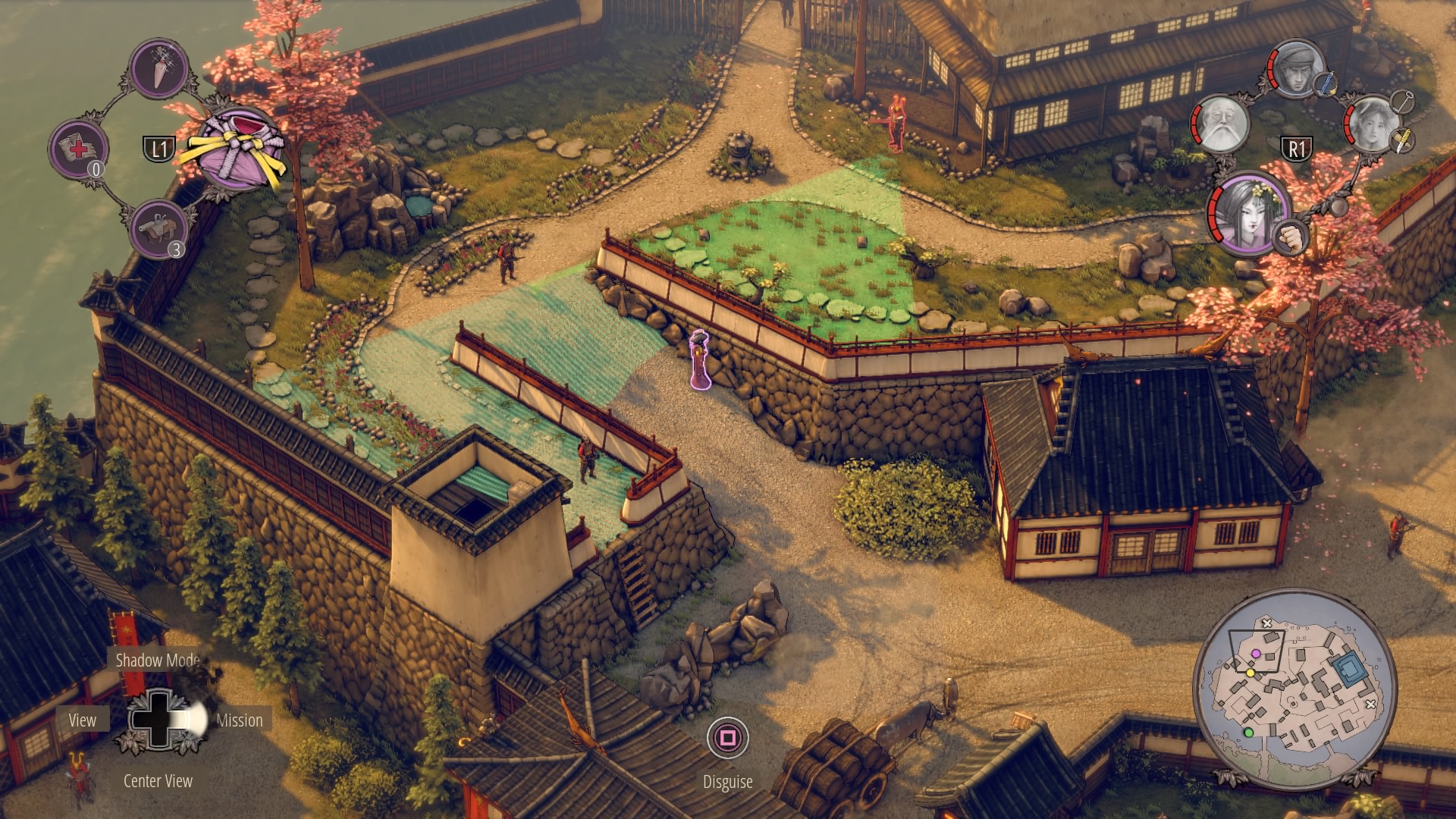 Getting Aiko’s Disguise: Follow the previous steps, and the central garden will be totally clear – except for the samurai. When the civilian is wandering around, toss sneezing powder at the kimono-wearing woman, knock her out and steal her kimono. Don’t worry, if the second civilian sees you, she’s only got the samurai to contact. The samurai will not leave his patrol path.