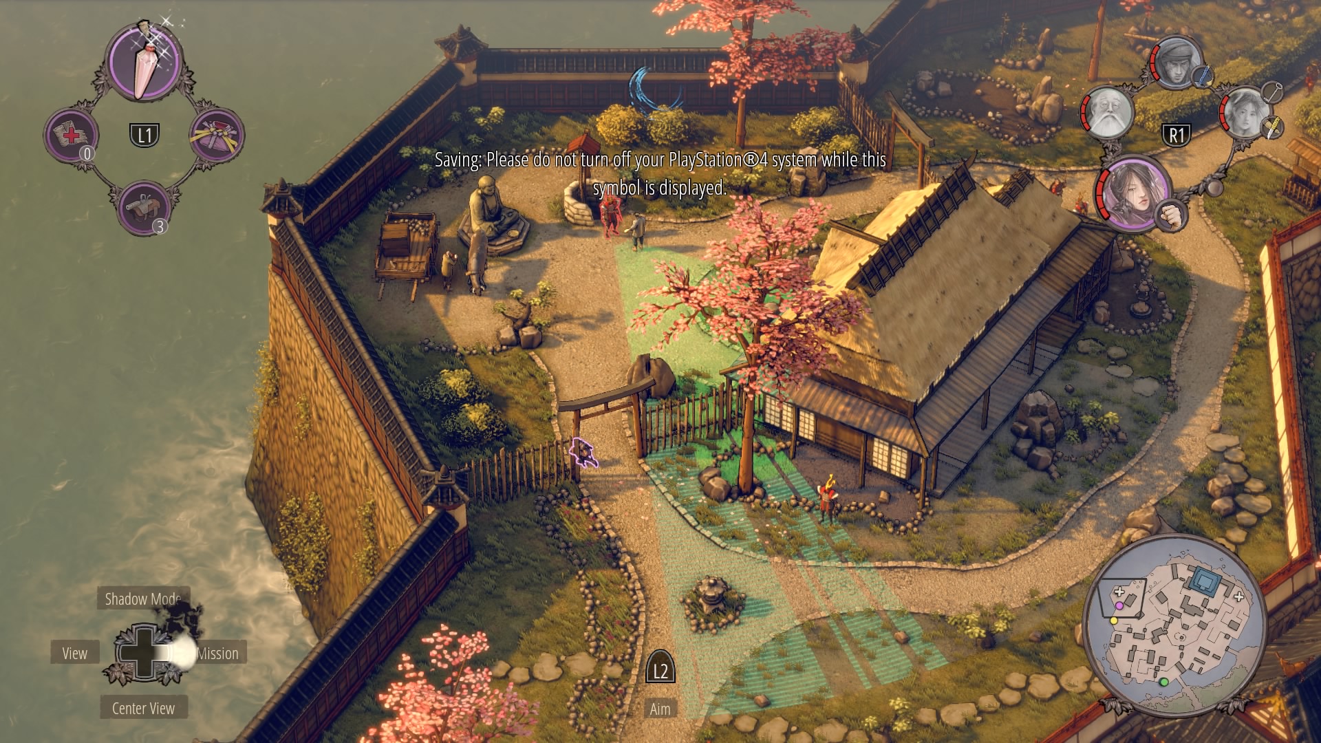 NOTE: It helps have have Aiko in disguise – she can help distract and kill guards in areas other characters can’t easily reach. Use Aiko to reach the central plinth and kill the patrolling samurai – that makes this section much, much easier. The real challenge is getting Takuma through without being seen.
