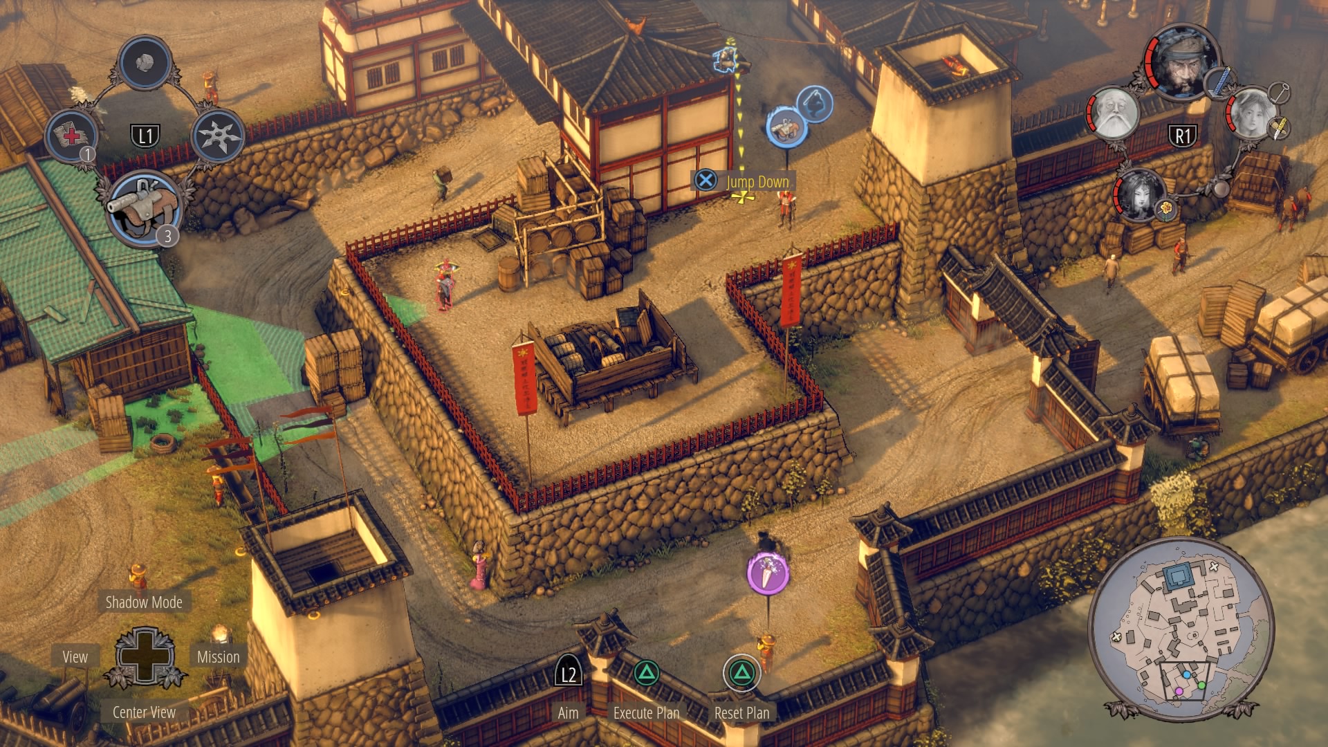Next, you’ll need to clear the two guards looking at each other. One is next to a cannon, the other is watching the cannon. Clear these guards, then the one in the tower. Aiko can distract, Hayato can stab, and you’ll be able to clear the area with minimal interference.