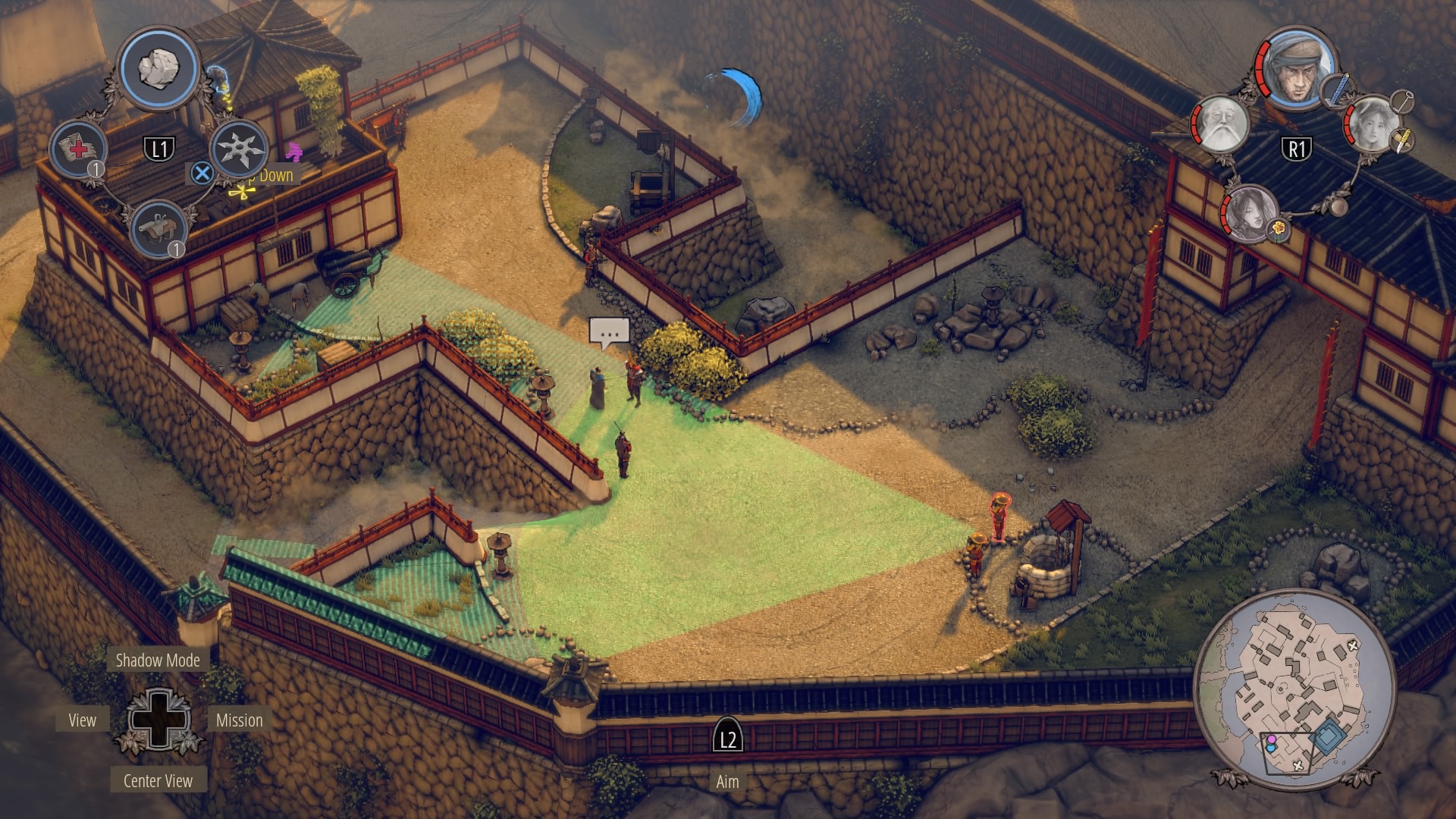 All four heroes will appear in a well at the top tier of the castle, just below the central keep. To end this war, you’ll need to climb up the keep and confront Noboru on the balcony. On the first path, two guards patrol while two straw hats watch from above. A fifth guard watches the patrol – use Aiko in disguise to stab and hide him in the bushes first. Next, lure the pair of patrollers into an ambush. Use Kuma or Yuki’s whistle.